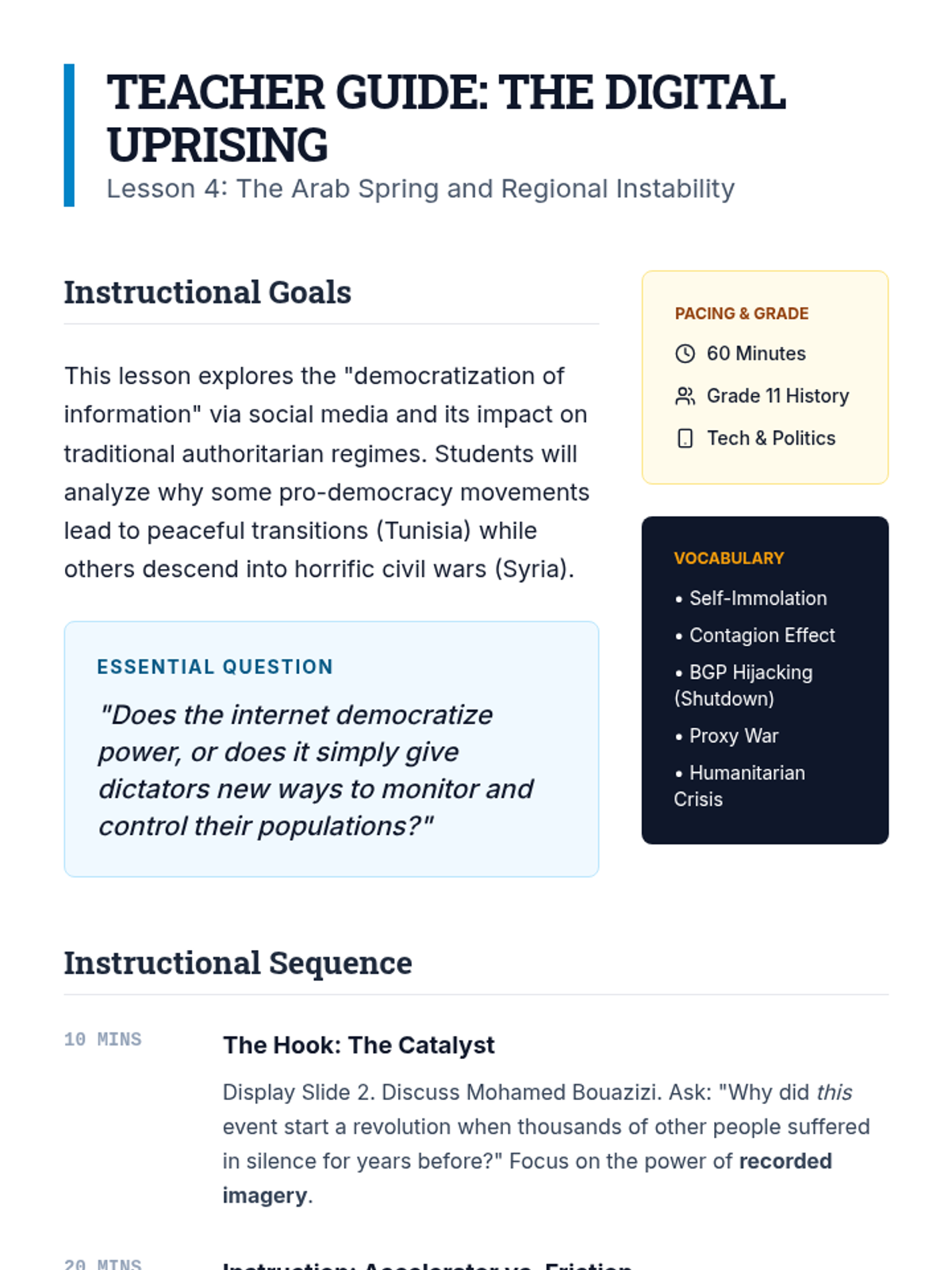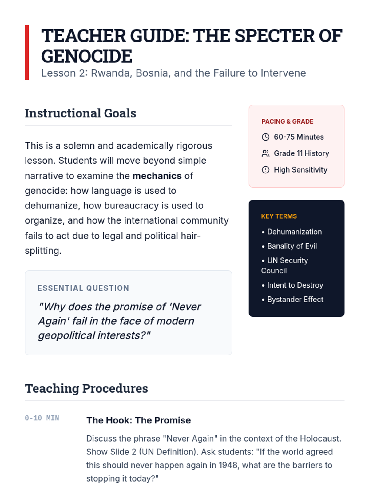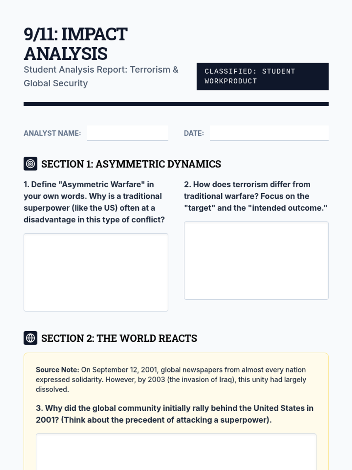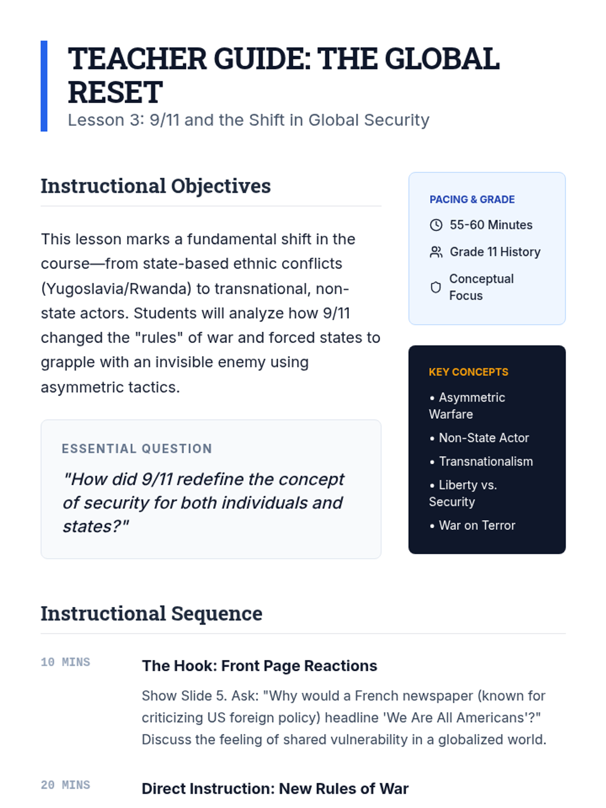 A comprehensive unit for 11th-grade students examining the shift from the bipolar Cold War era to a multipolar world defined by ethnic conflict, terrorism, and asymmetric warfare. Students analyze the breakup of Yugoslavia, genocides in Rwanda and Bosnia, the global impact of 9/11, the Arab Spring, and contemporary geopolitical hotspots.