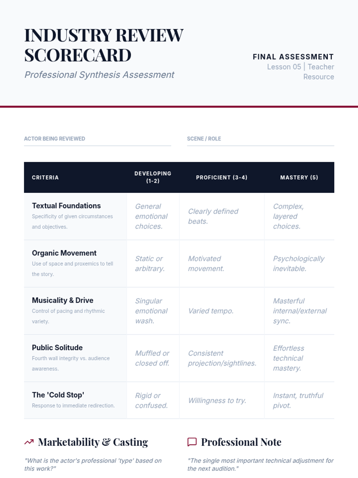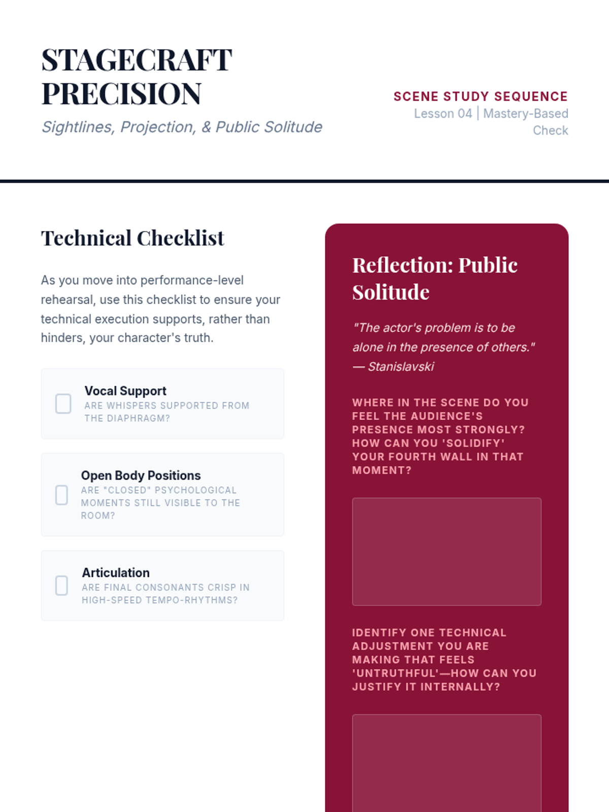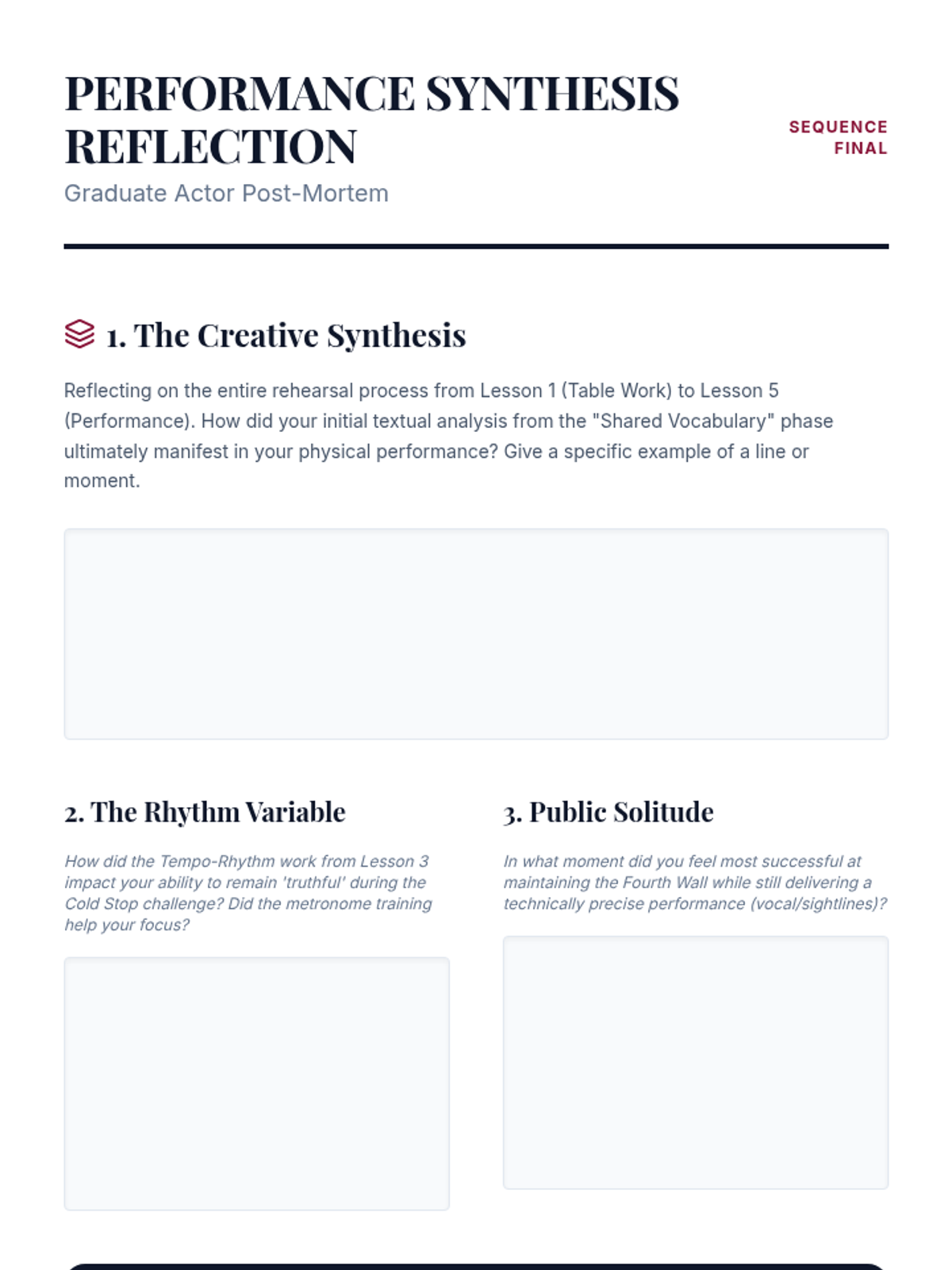 A graduate-level sequence focused on the professional rehearsal process, synthesizing character analysis, physical blocking, and rhythmic precision into a showcase-ready contemporary scene. Students move from deep textual analysis to technical mastery and industry-style critique.