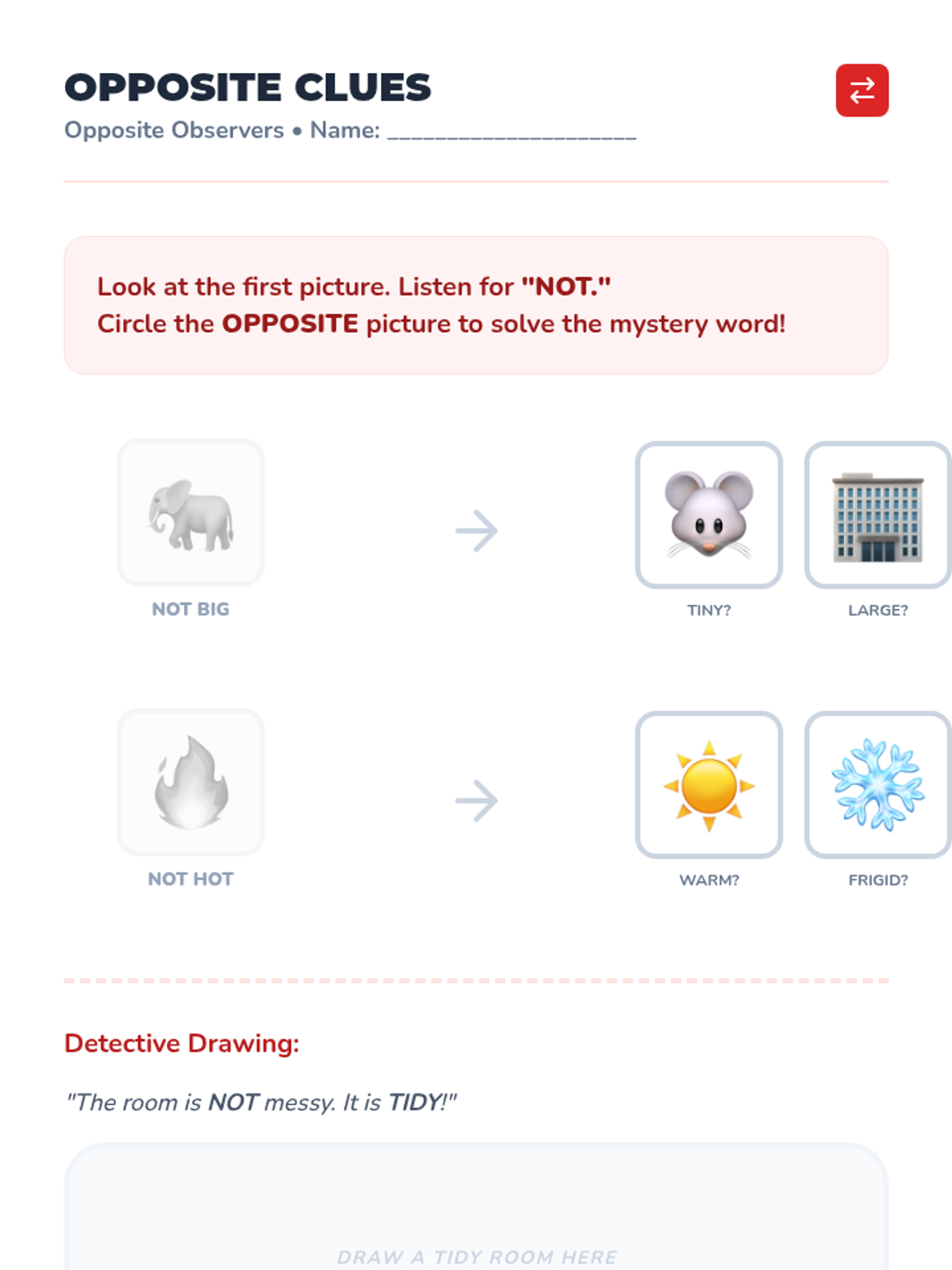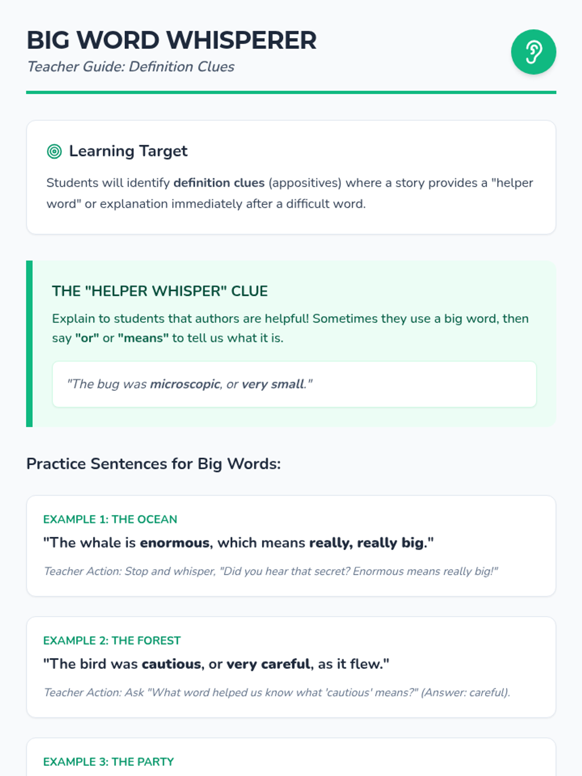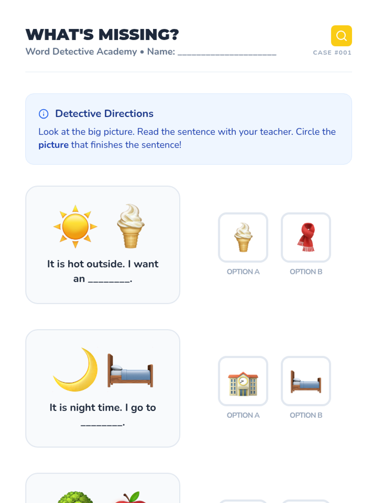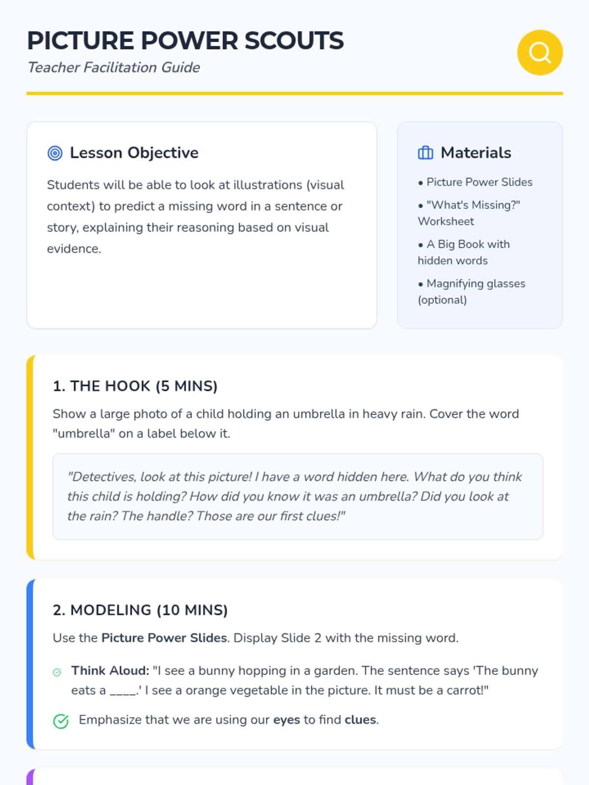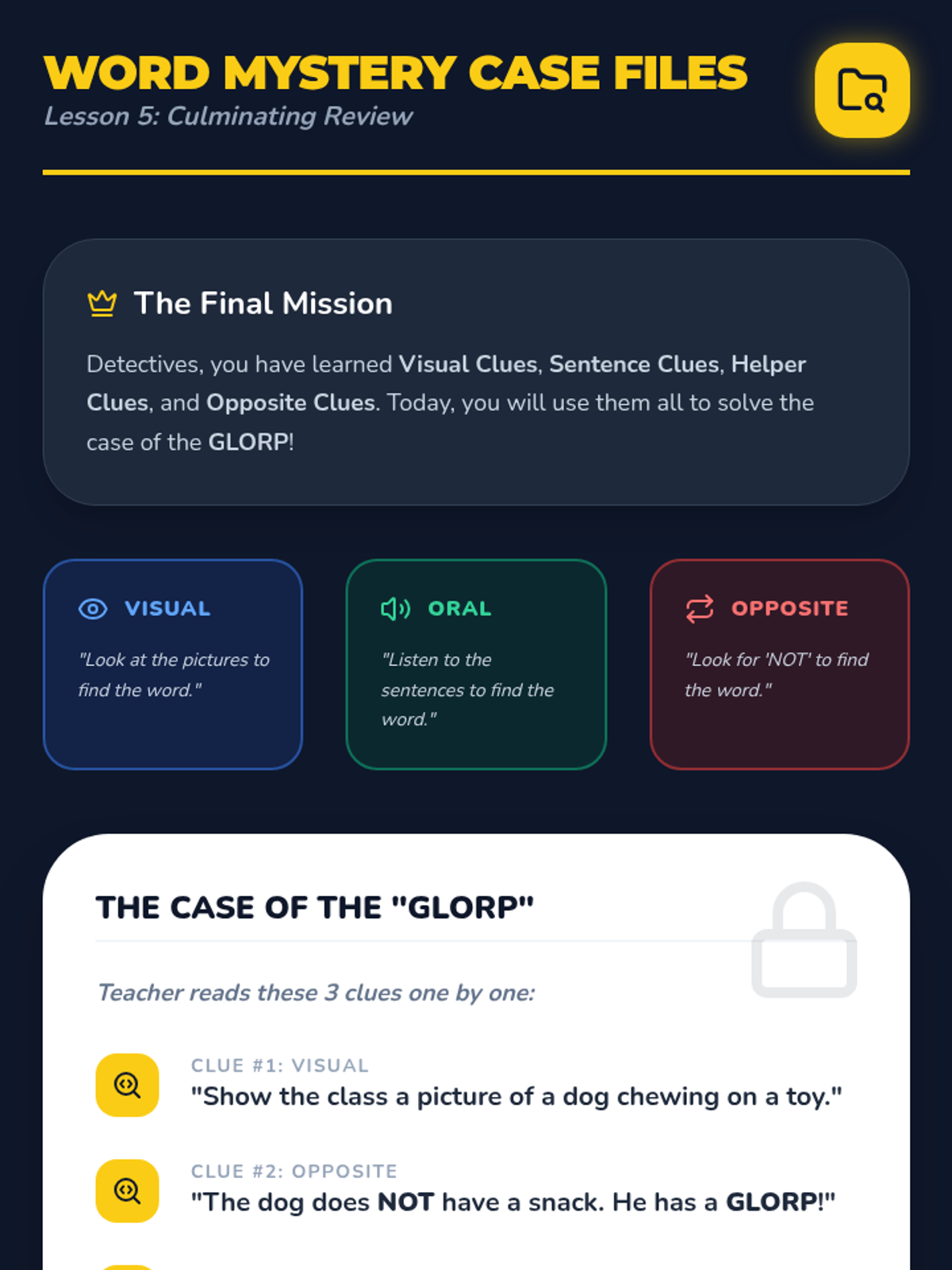 A Kindergarten ELA sequence introducing context clues through visual supports, oral cloze activities, definition identification, and antonym reasoning. Students become 'Word Detectives' to infer meanings of unfamiliar or missing words.