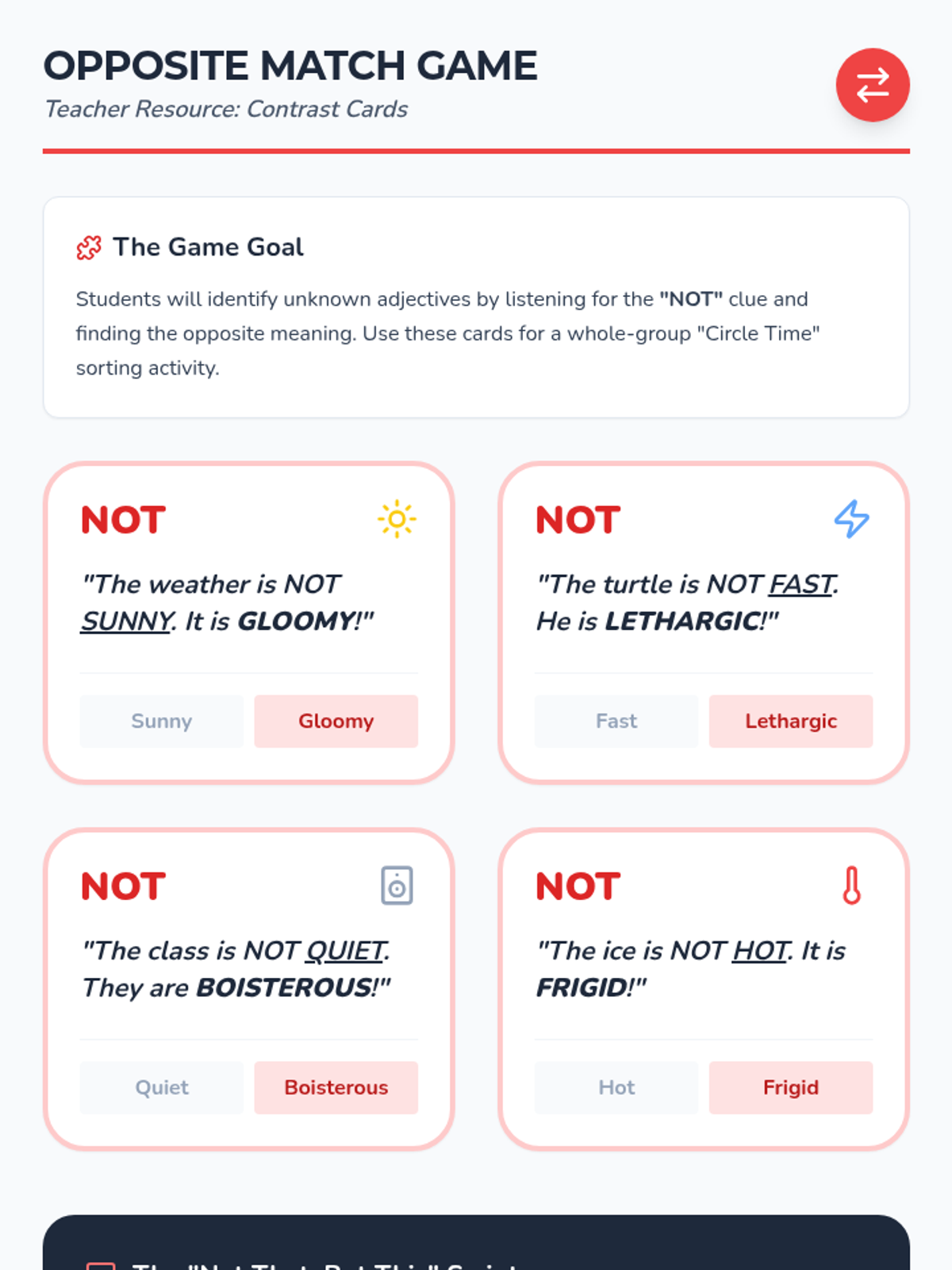 A 3rd-grade vocabulary sequence focused on helping multilingual learners distinguish between synonyms, antonyms, and related-but-not-similar words (thematic associations).
