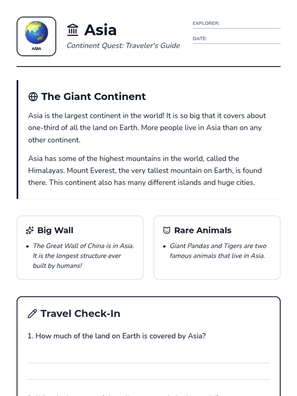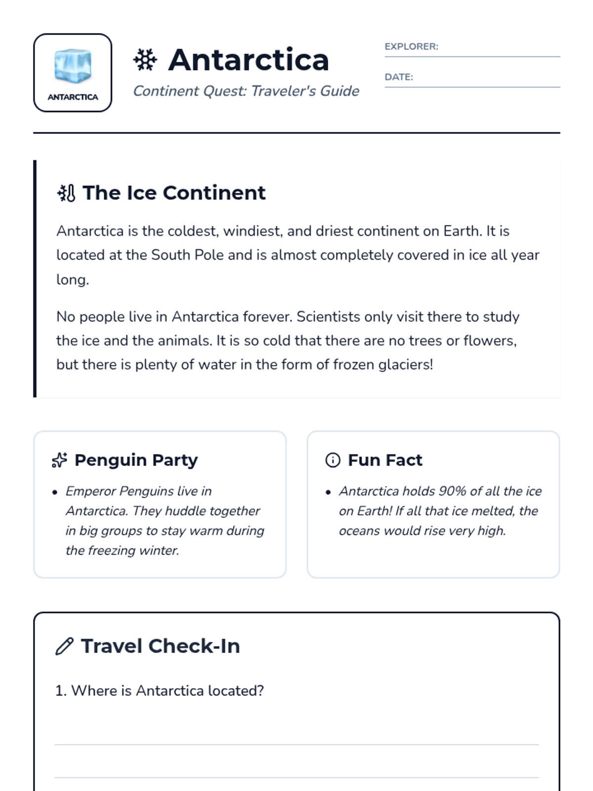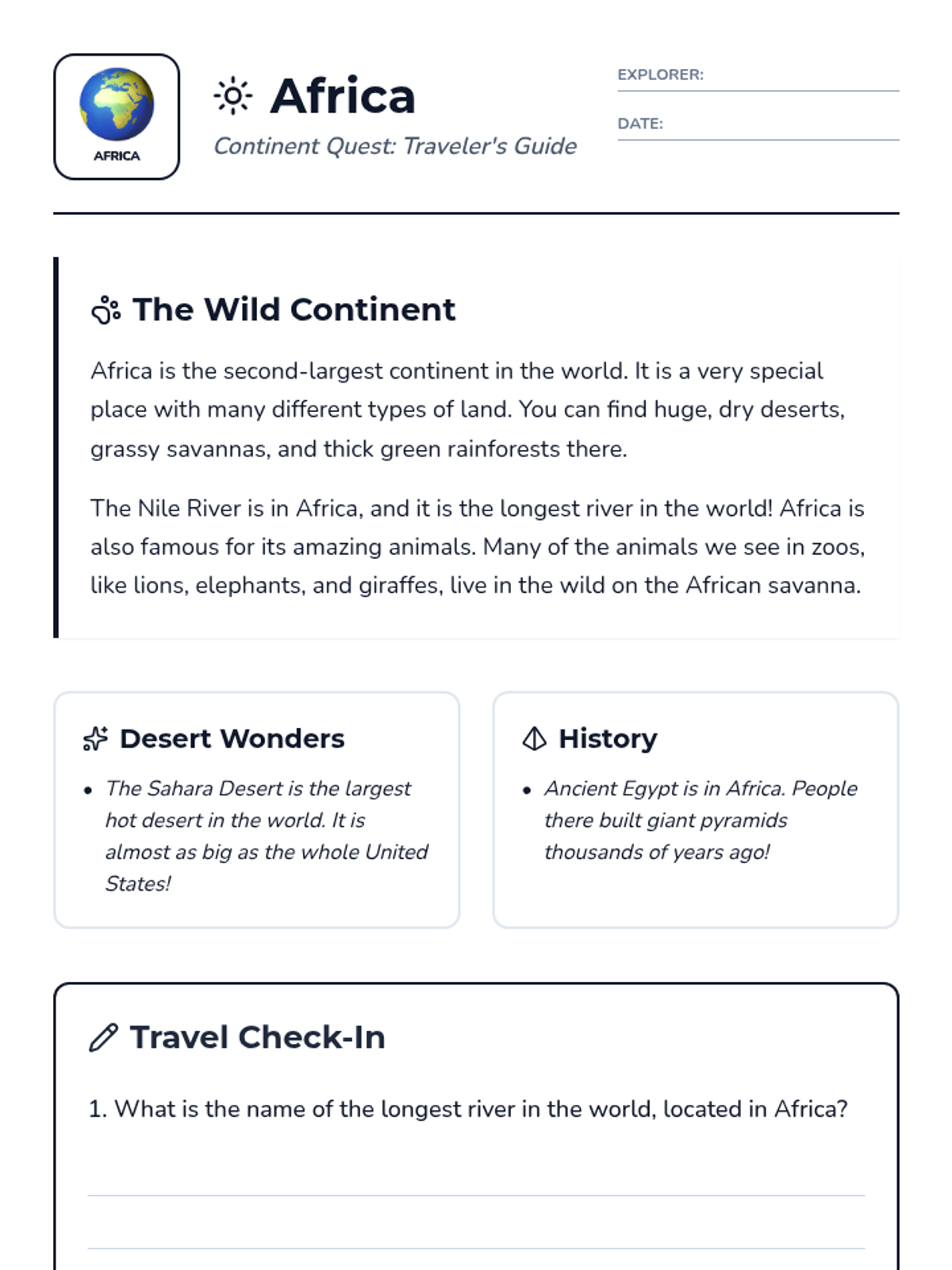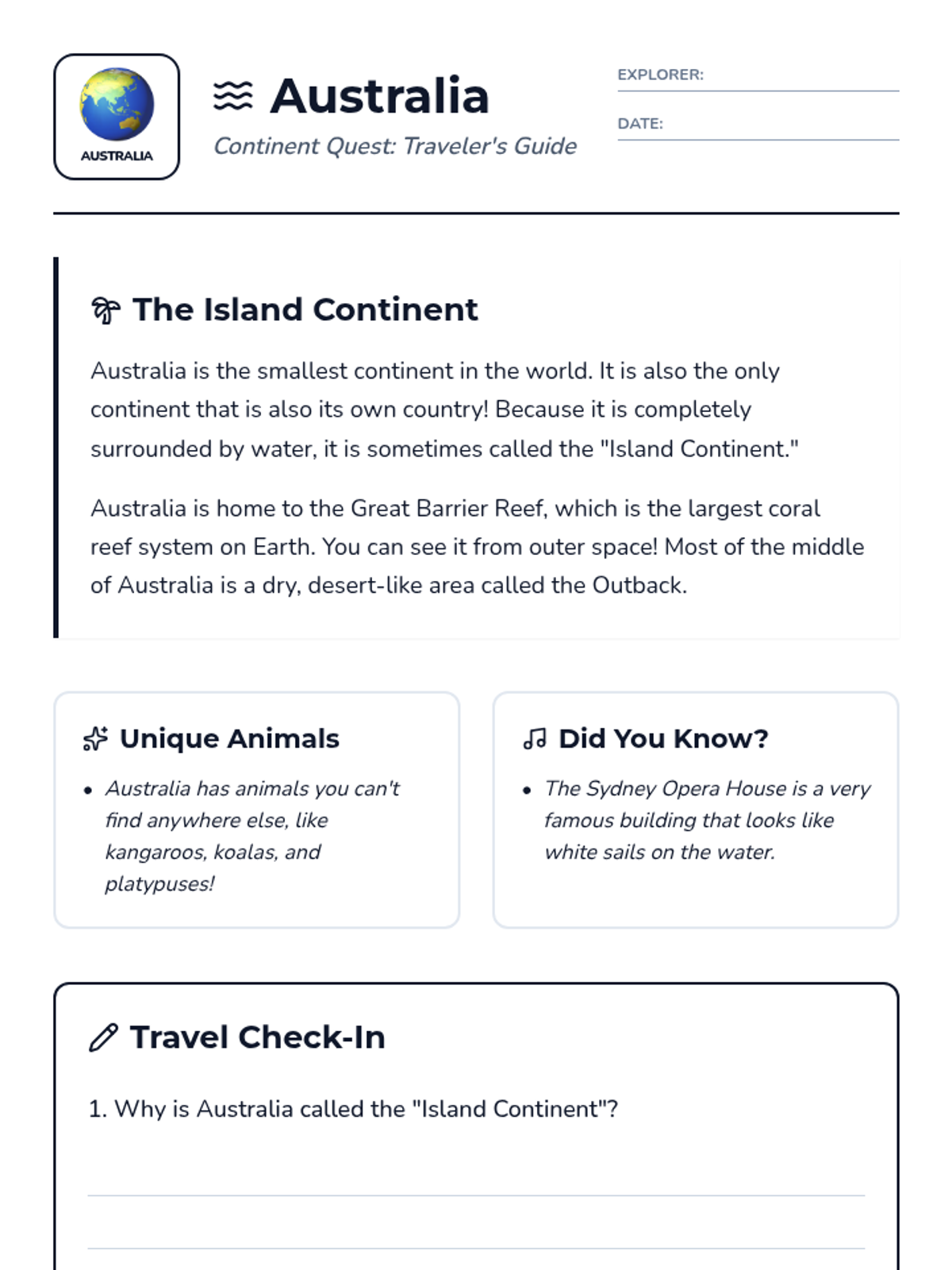 A comprehensive series of reading and comprehension activities covering each of the seven continents, designed for second-grade students to build global awareness.
