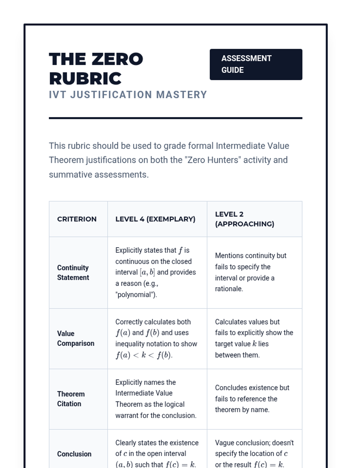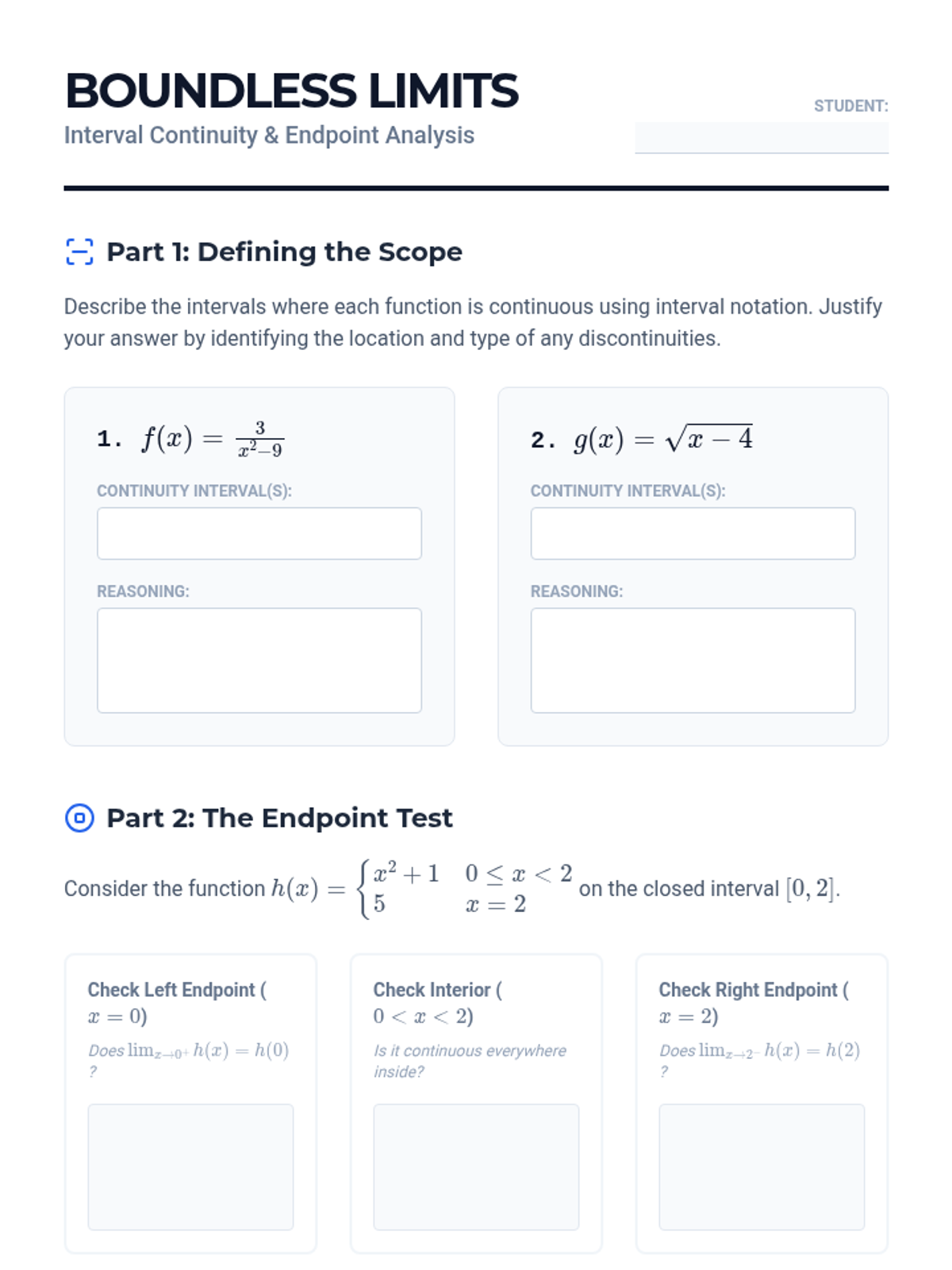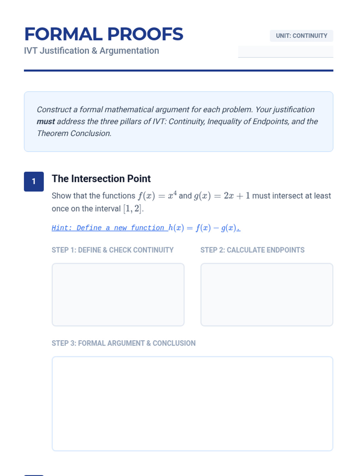 A comprehensive 11th-grade Calculus sequence focusing on the formal definition of continuity, classification of discontinuities, and the application of the Intermediate Value Theorem (IVT). Students transition from intuitive understanding to rigorous mathematical justification.