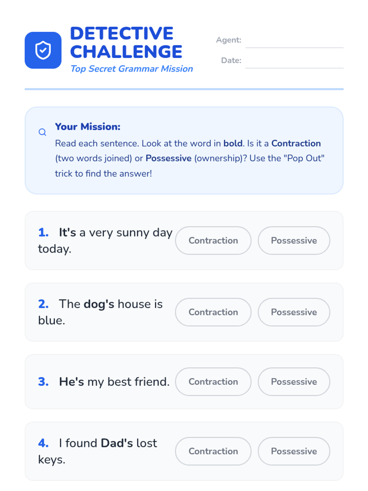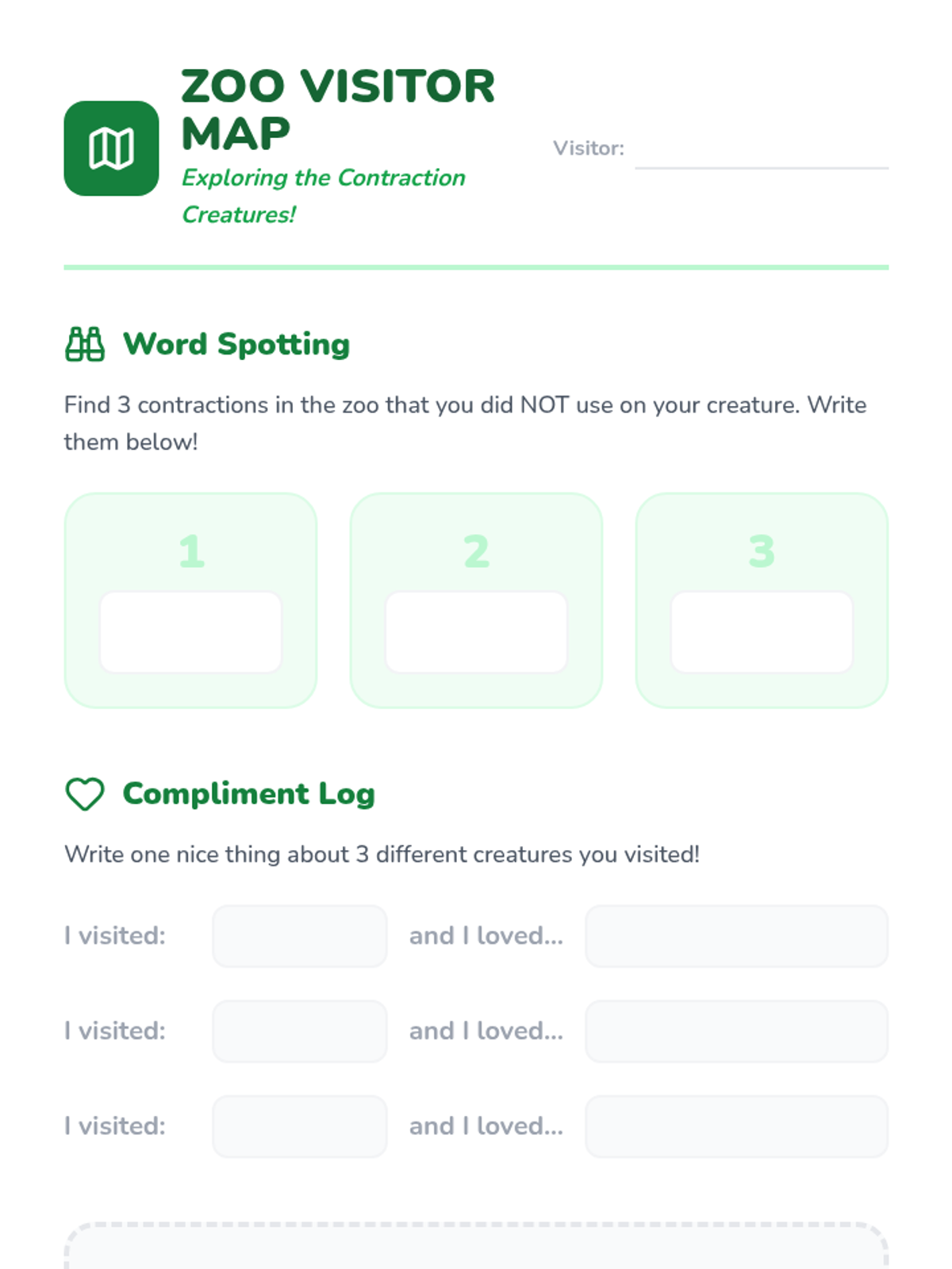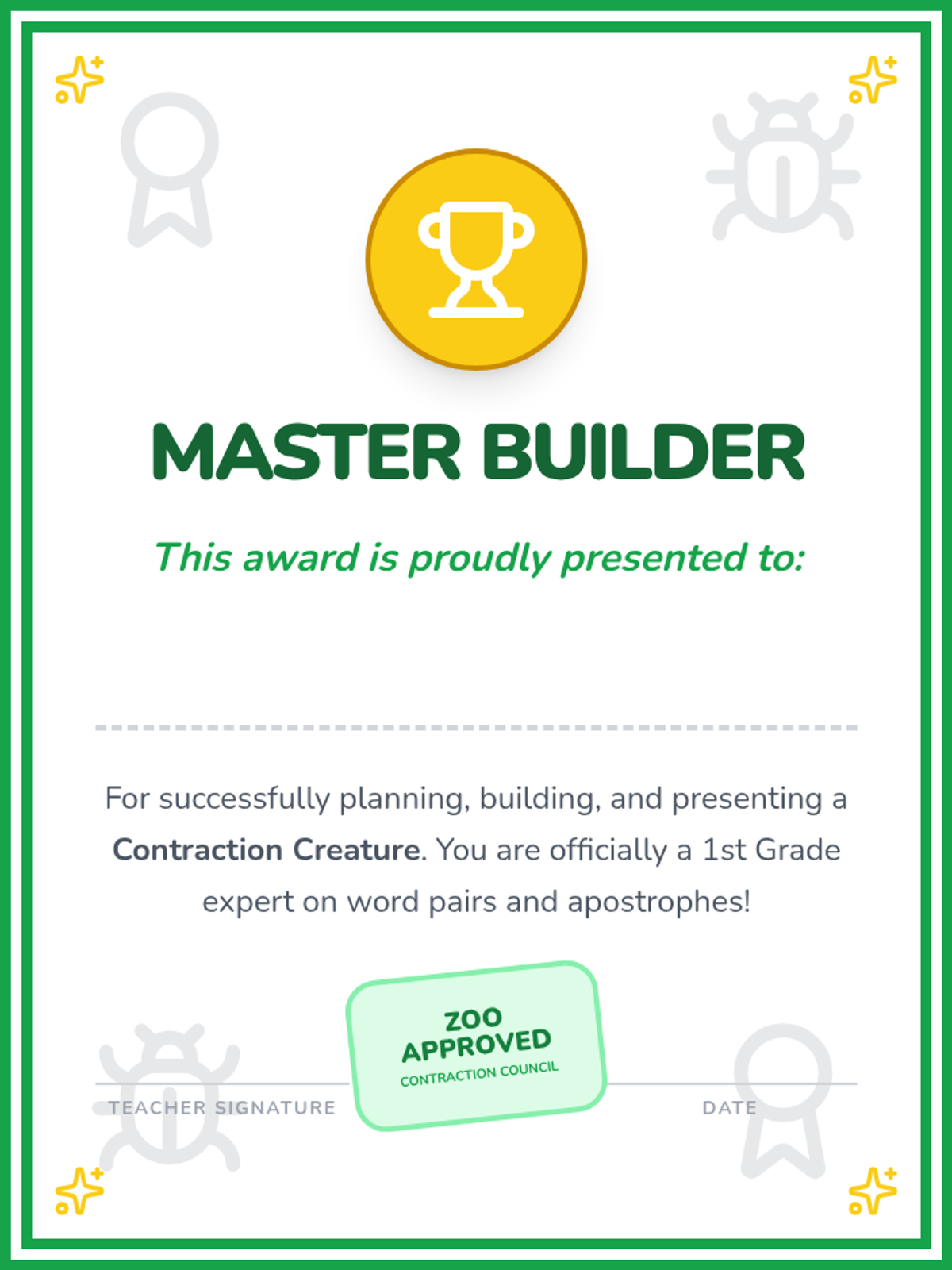 A project-based sequence where 1st-grade students build 'Contraction Creatures' to master how two words combine into one. Students plan, differentiate from possessives, construct, and present their physical word models.