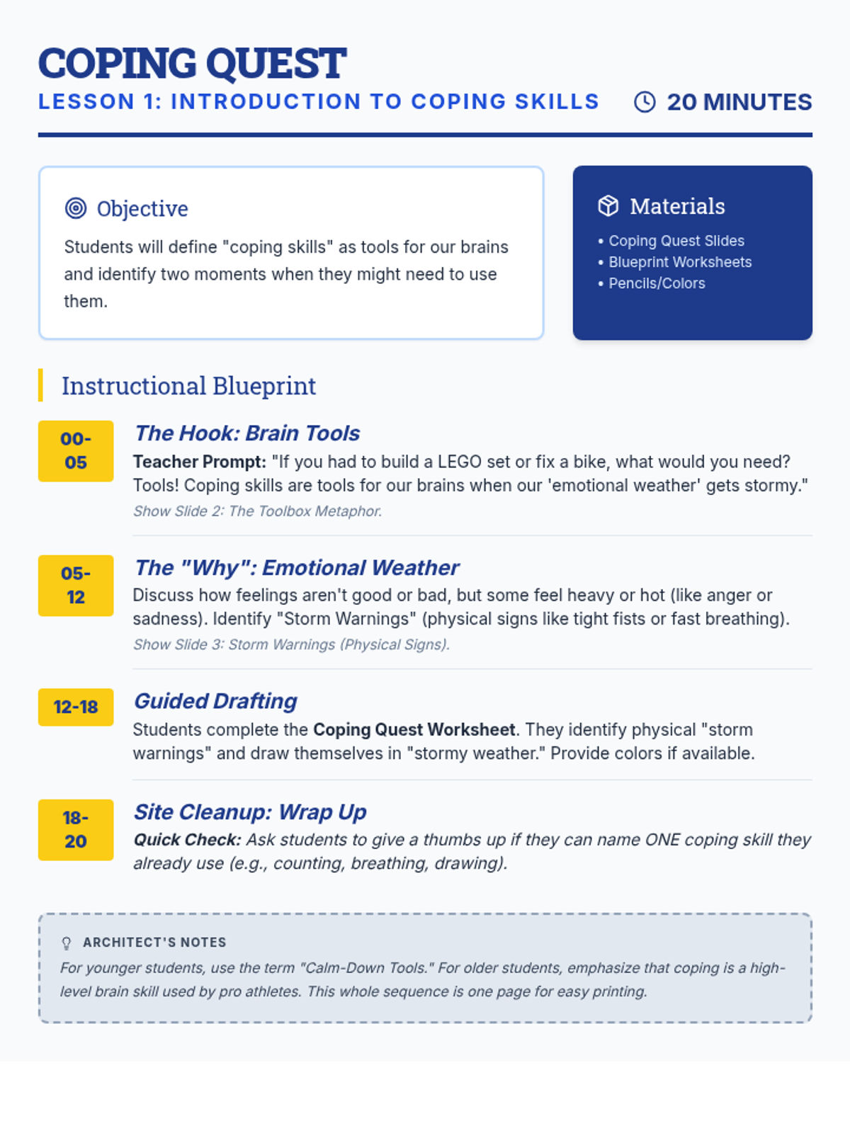An 8-week social-emotional learning curriculum designed for 20-minute sessions. Students learn to identify, categorize, and apply coping skills through a blueprint-inspired framework of self-regulation.