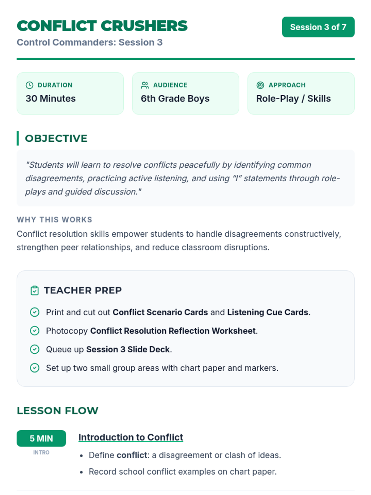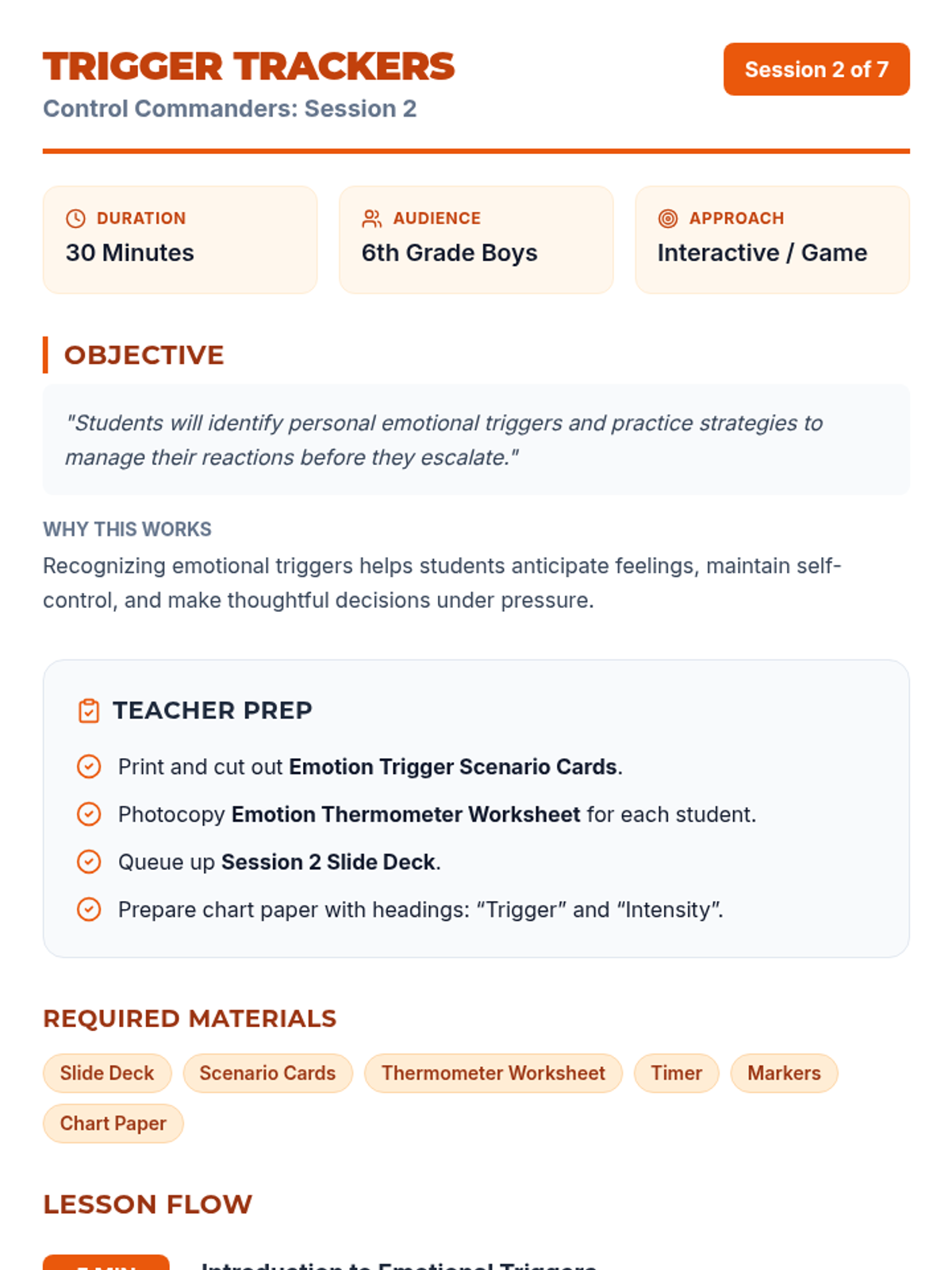 A 7-session Tier 2 group counseling program for 6th grade boys designed to build self-control, emotional regulation, teamwork, and responsible decision-making through active, game-based learning.