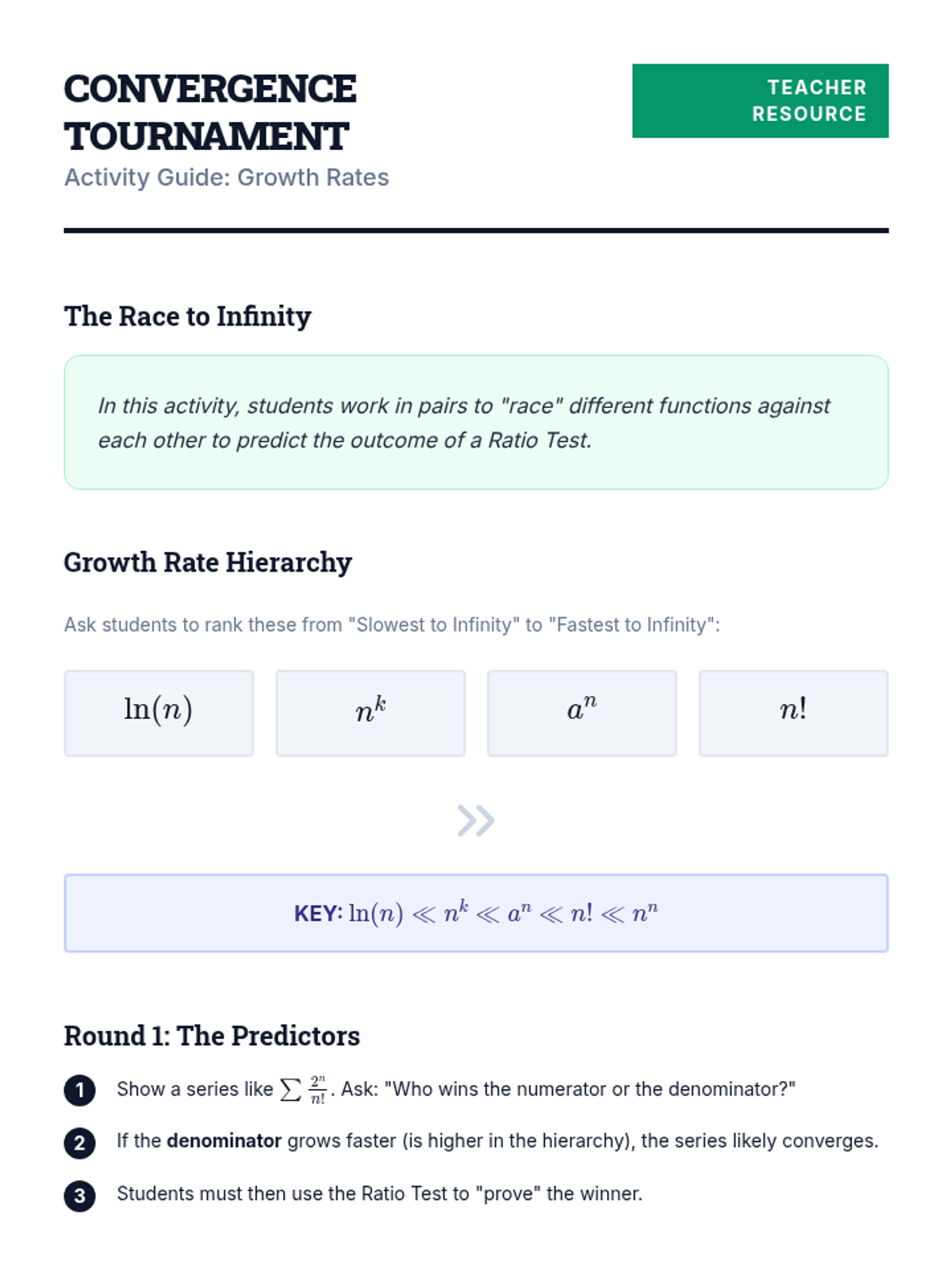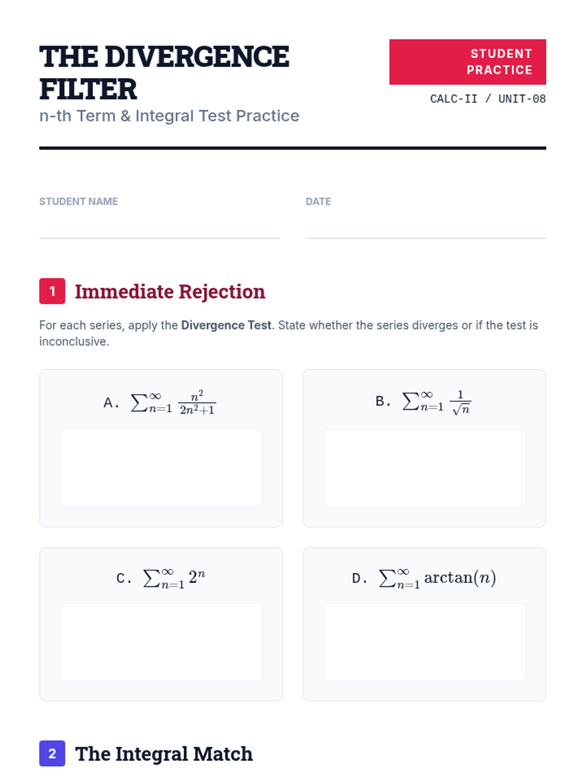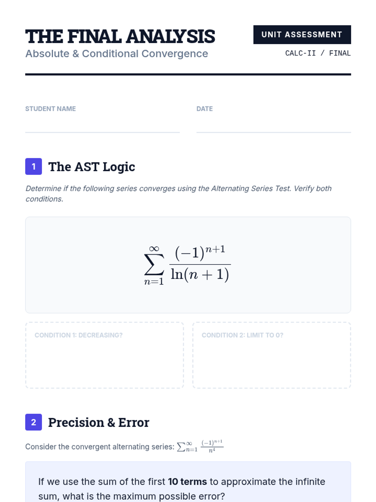 This sequence guides undergraduate students through the transition from sequences to infinite series, focusing on determining convergence and divergence using various tests. Students develop a systematic approach to analyzing series, moving from basic geometric sums to complex absolute and conditional convergence.