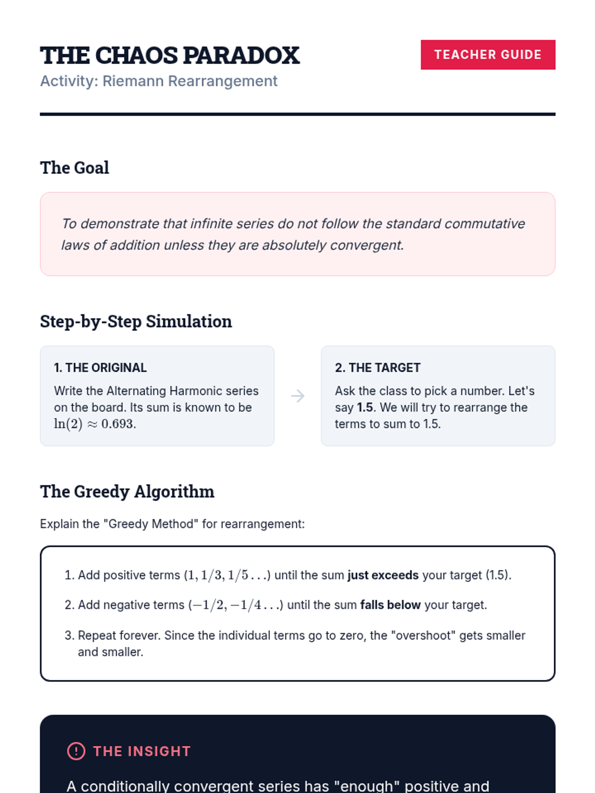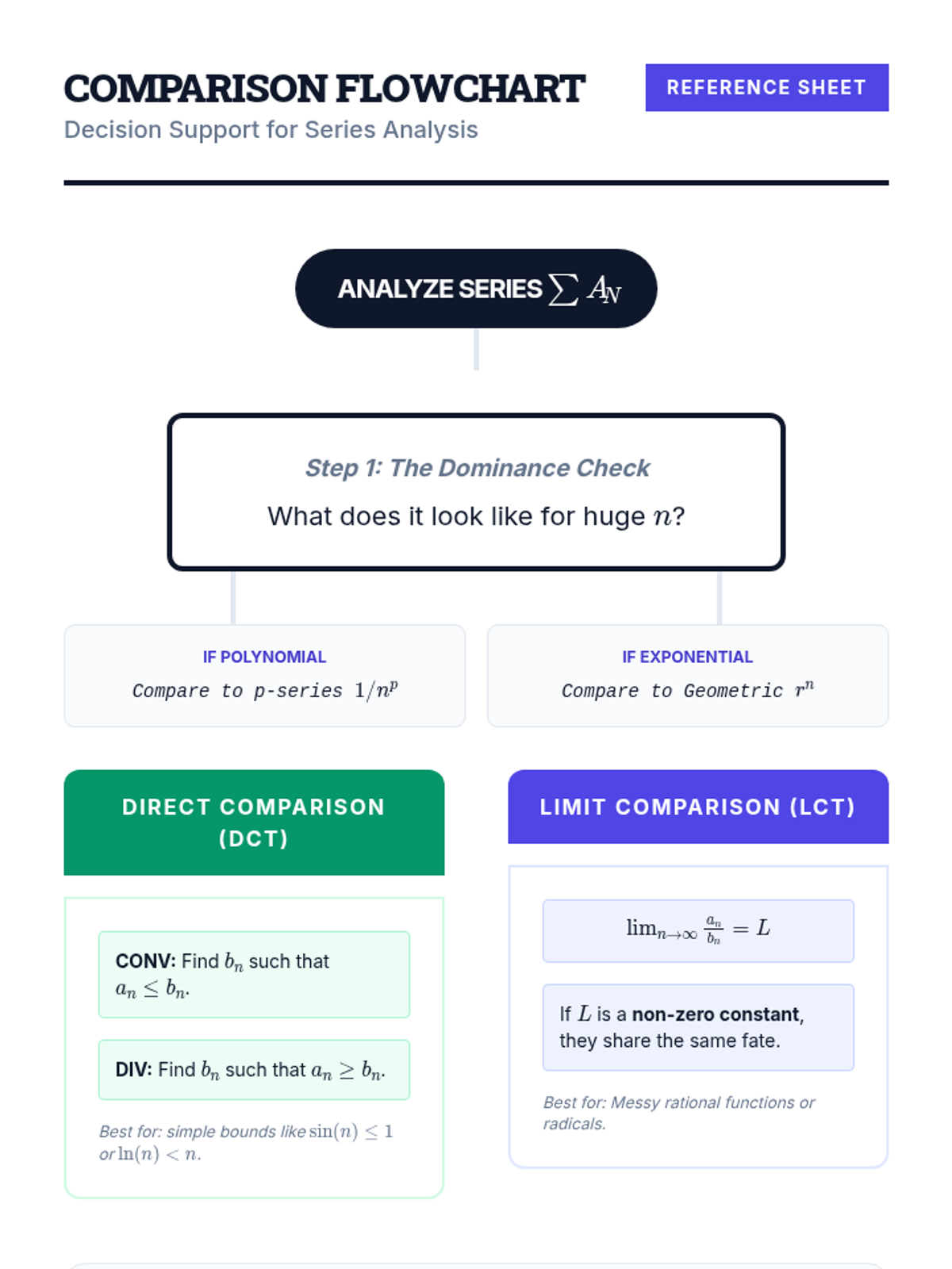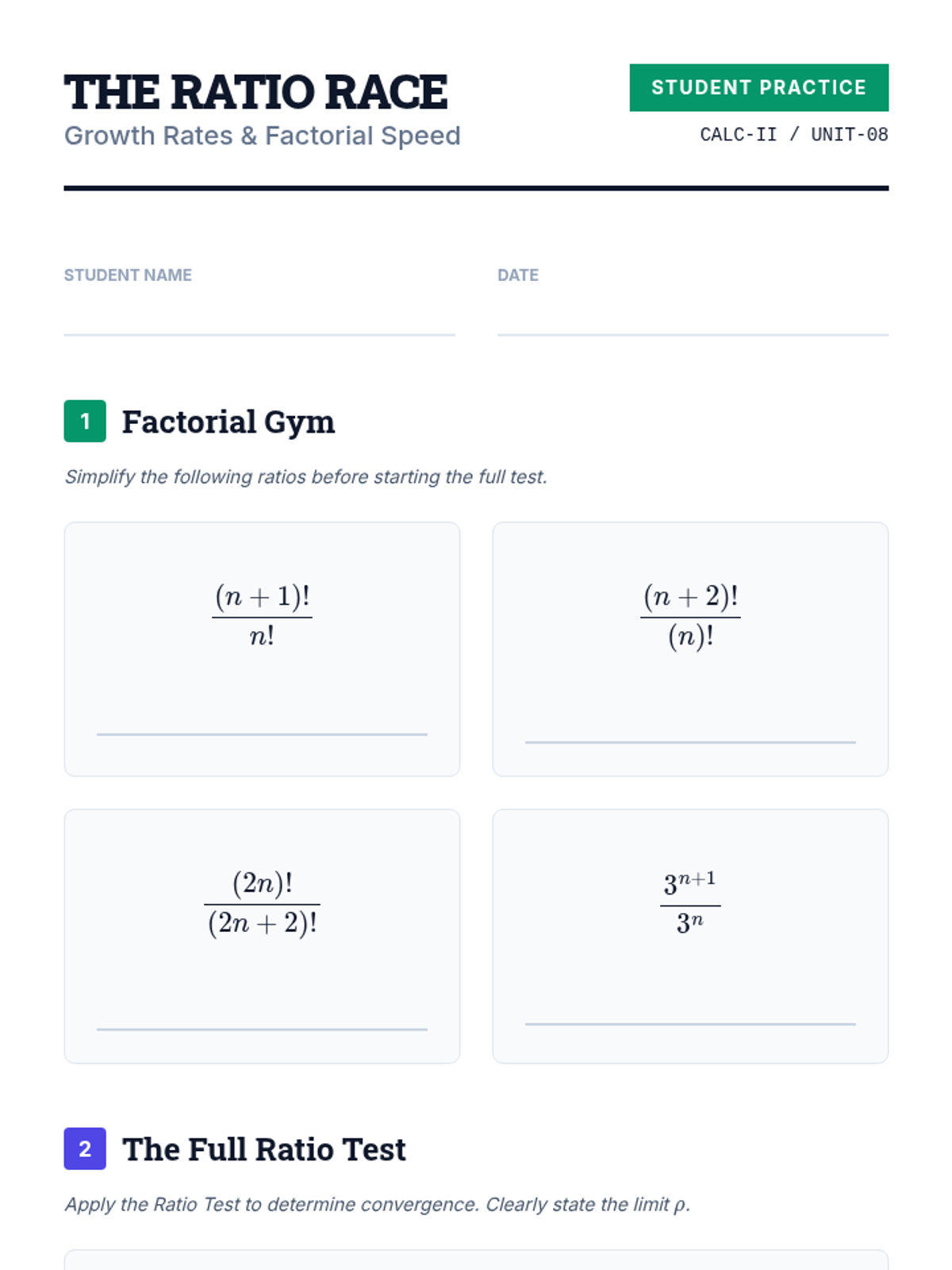 This sequence guides undergraduate students through the transition from sequences to infinite series, focusing on determining convergence and divergence using various tests. Students develop a systematic approach to analyzing series, moving from basic geometric sums to complex absolute and conditional convergence.