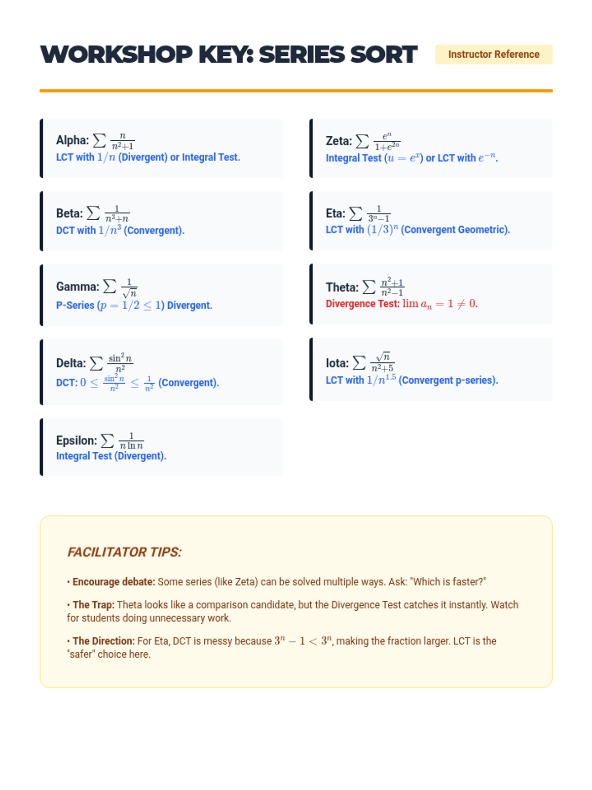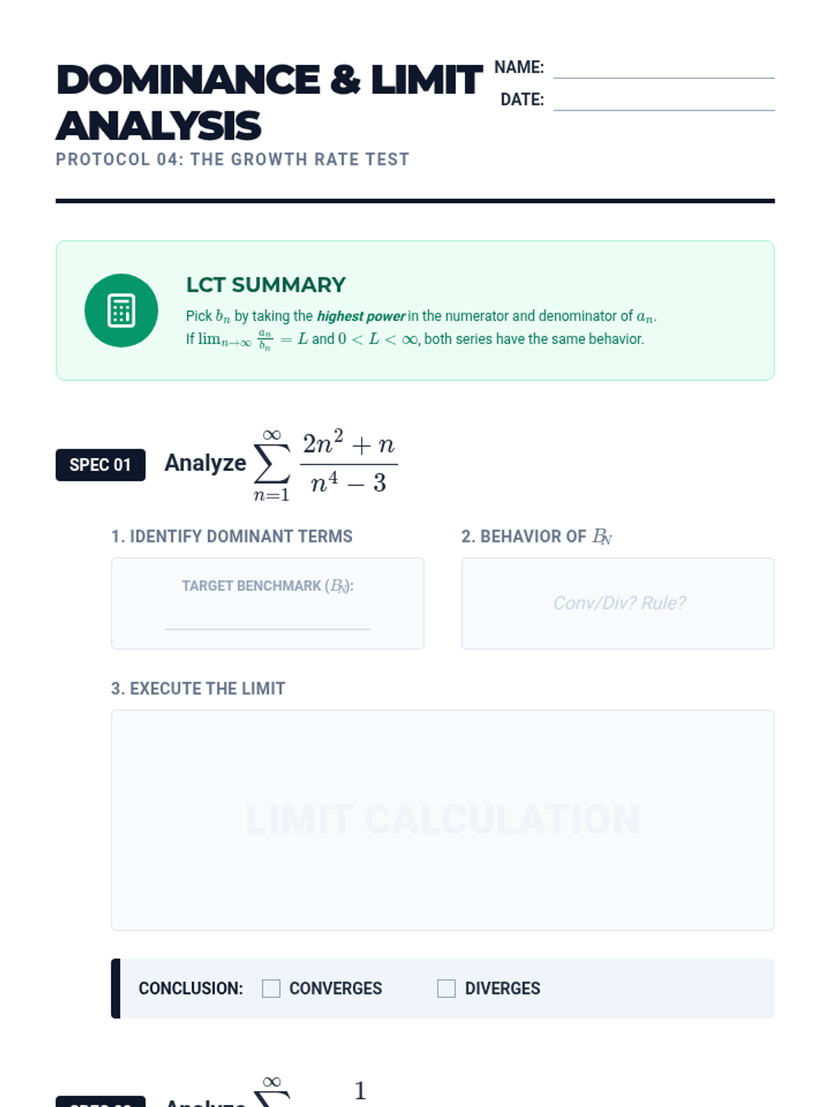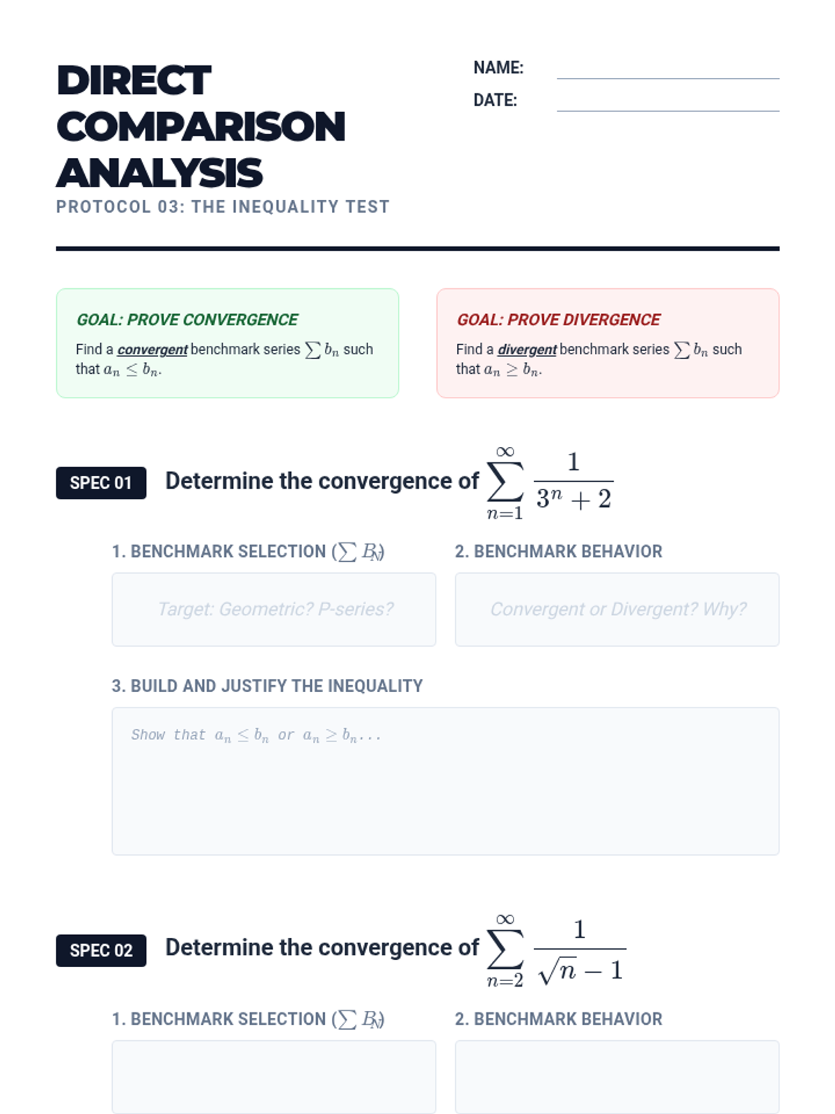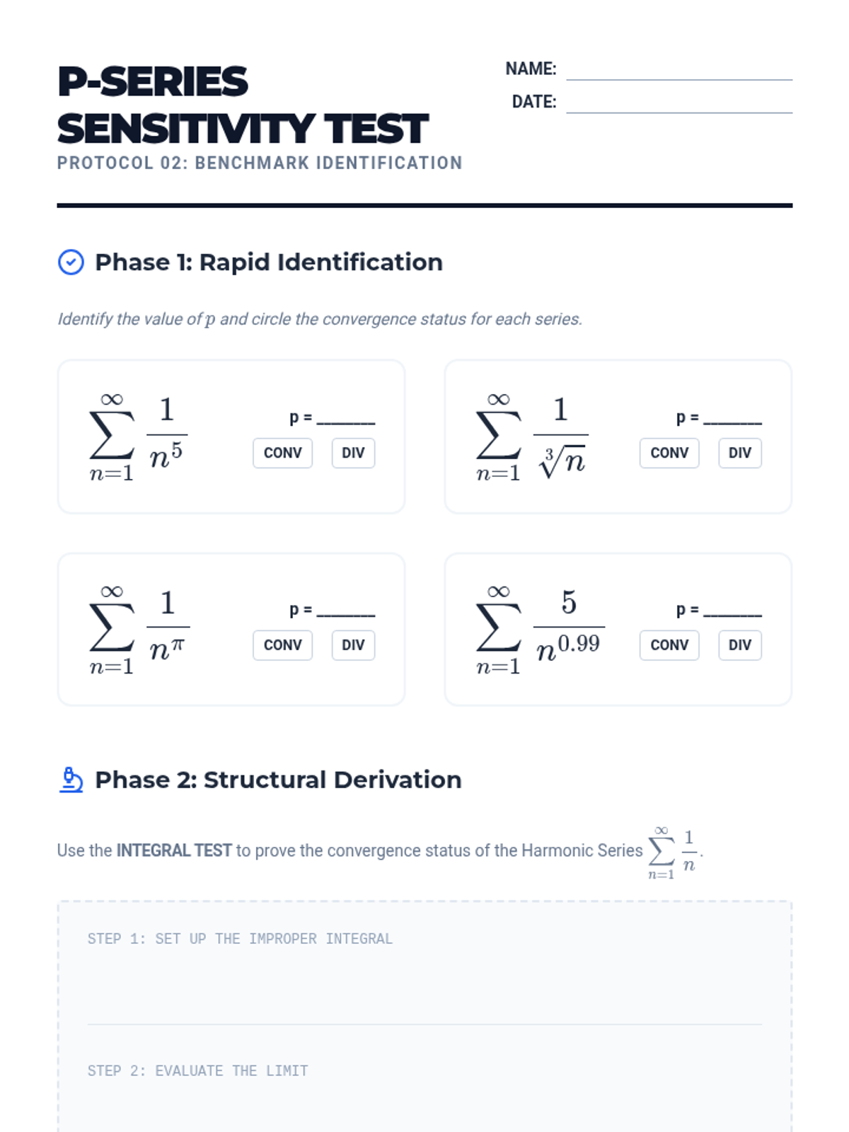 A rigorous unit for 12th-grade Calculus students focusing on the Integral Test, p-series, and Comparison Tests (Direct and Limit) to determine the convergence of positive-term infinite series. Students will build a logical framework for selecting the most efficient convergence test for various mathematical structures.