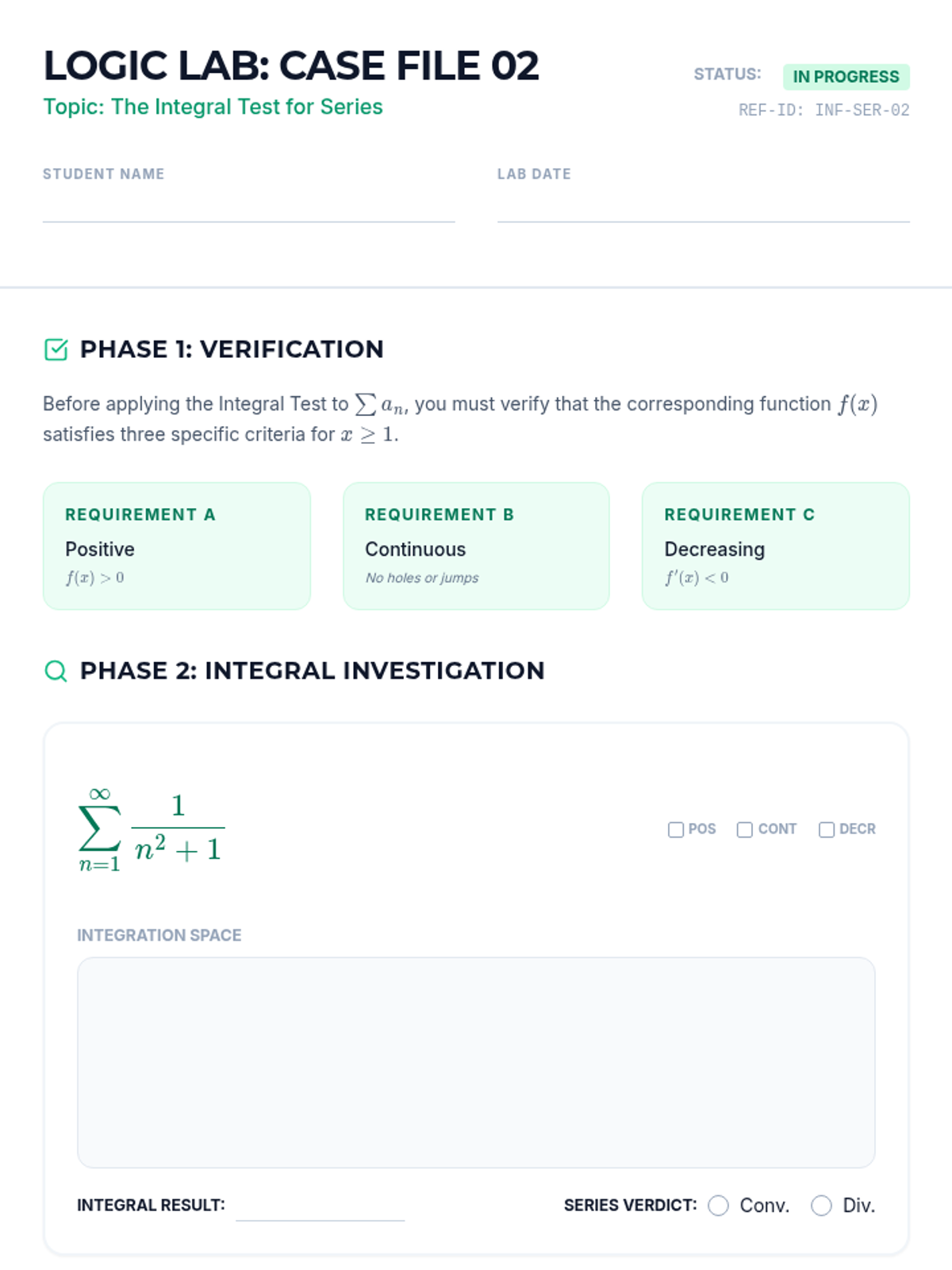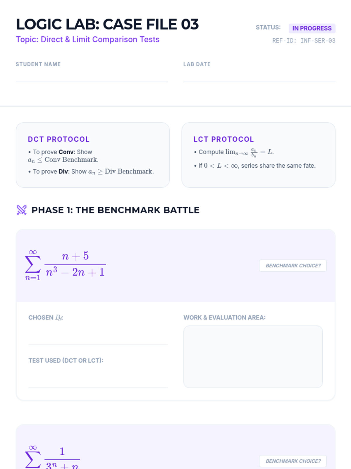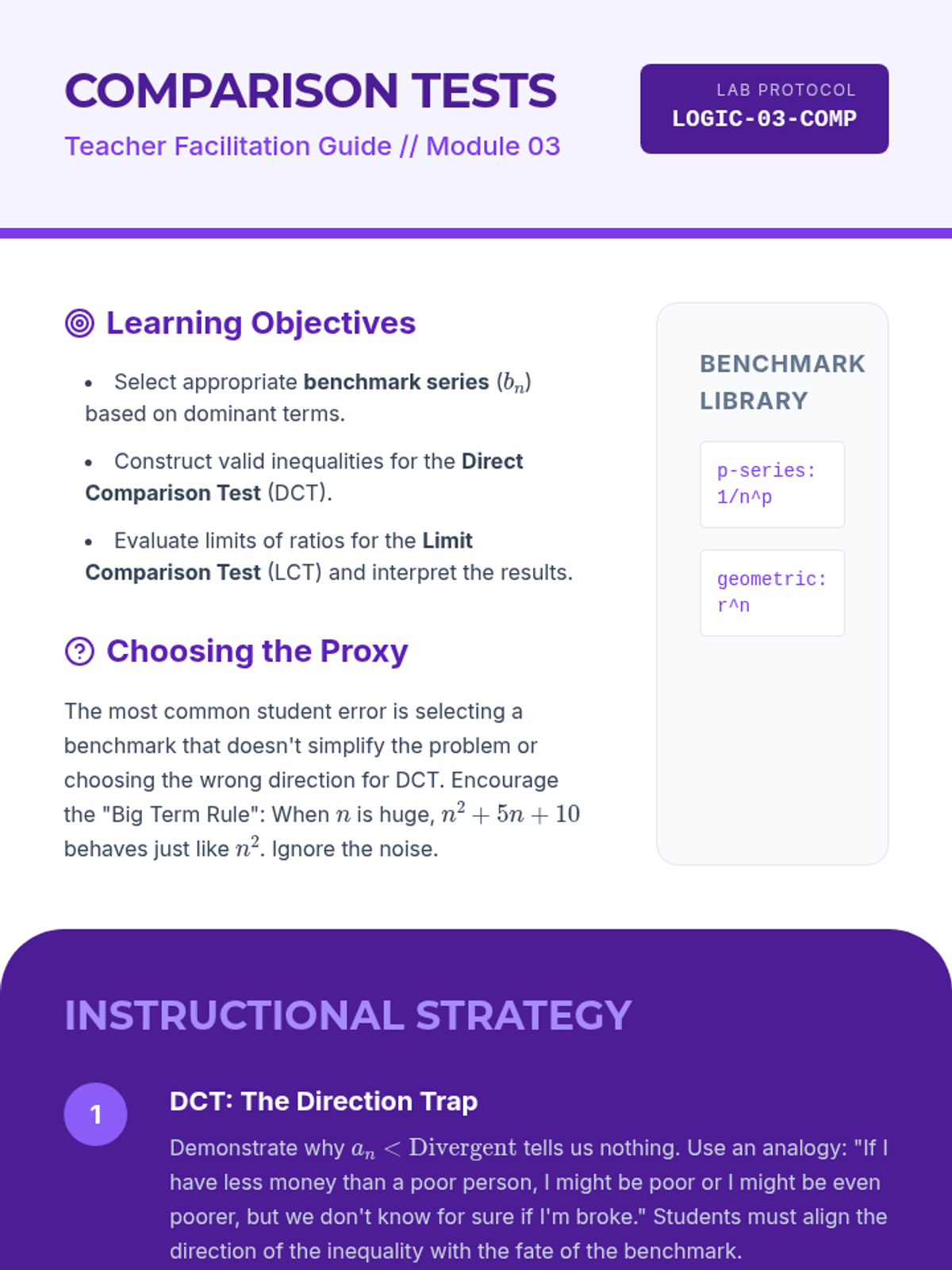 A comprehensive sequence for 10th-grade calculus students focusing on the logical rigor of infinite series convergence tests. Students learn to analyze series behavior through various analytical tools, culminating in a strategic decision-making framework.