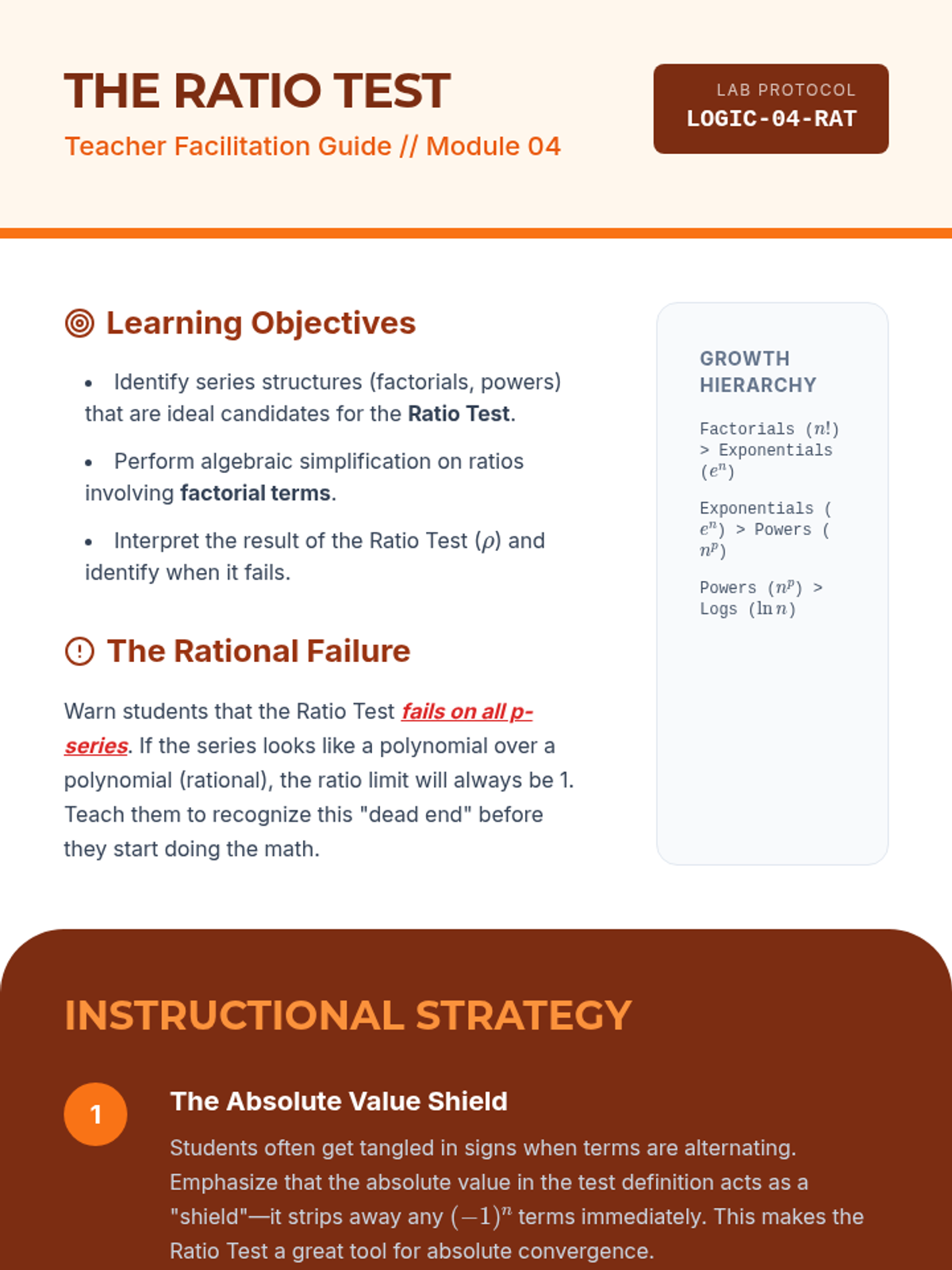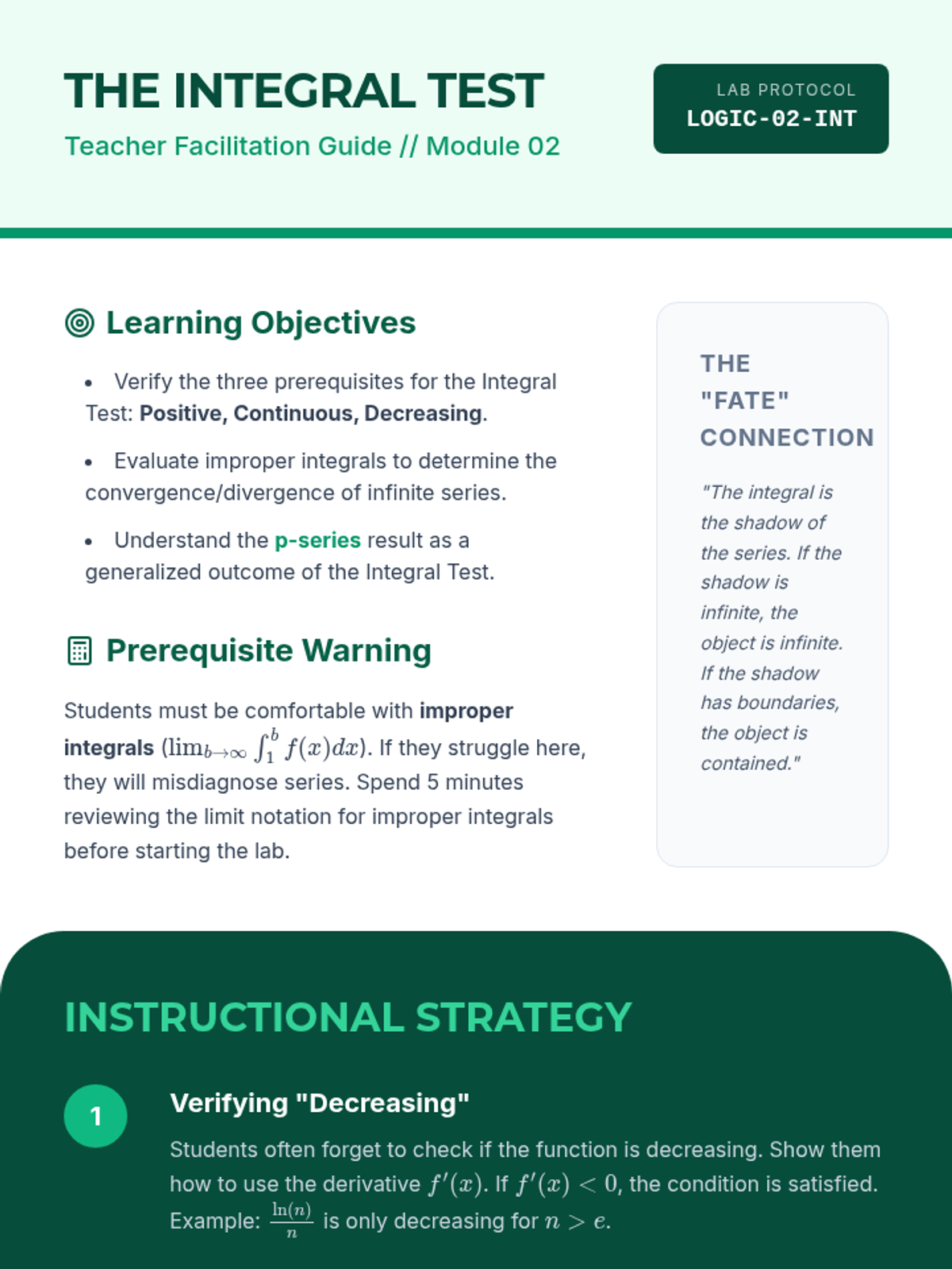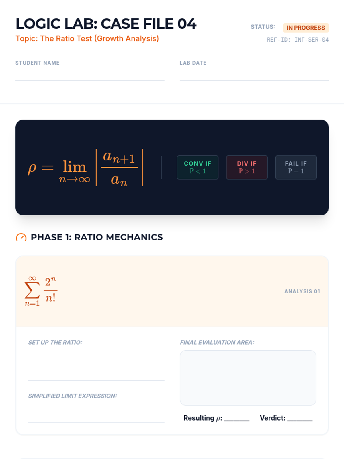 A comprehensive sequence for 10th-grade calculus students focusing on the logical rigor of infinite series convergence tests. Students learn to analyze series behavior through various analytical tools, culminating in a strategic decision-making framework.
