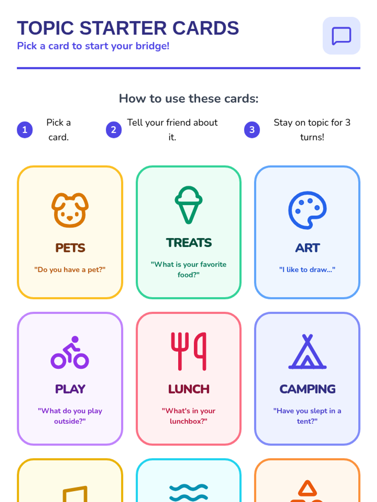 A Kindergarten social communication sequence focusing on topic maintenance. Students learn to listen for clues, build "connection bridges" between thoughts, ask on-topic questions, and transition politely using a detective and builder theme.