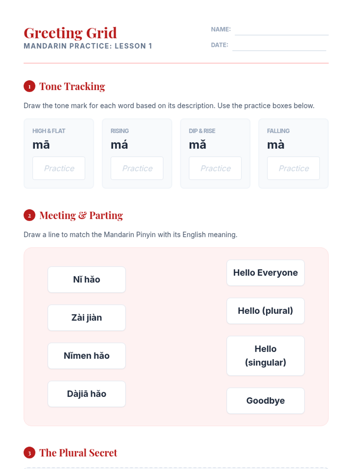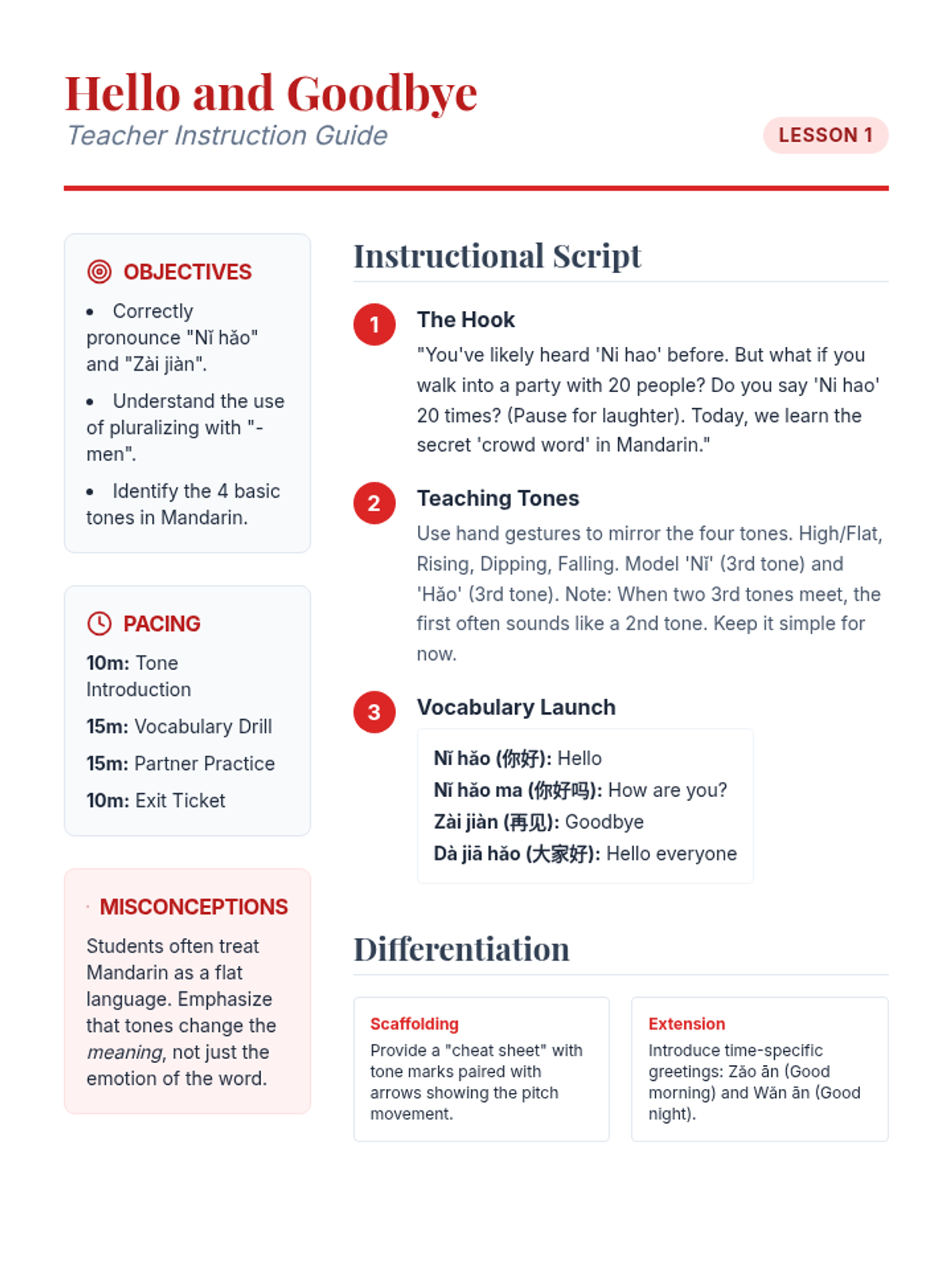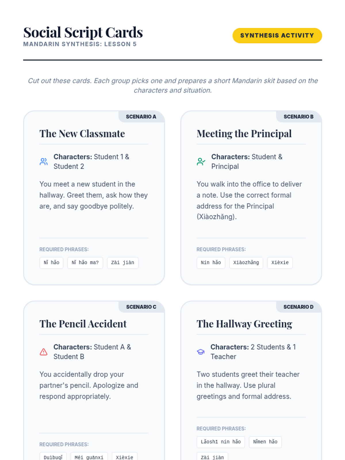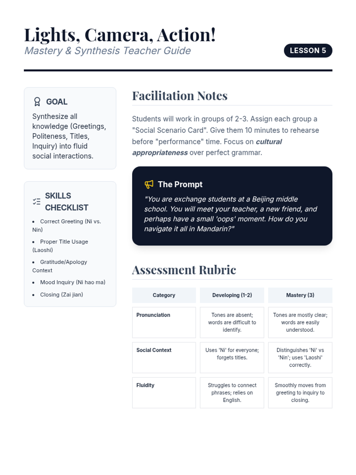 A 5-lesson sequence for 5th graders to master basic Mandarin greetings, polite expressions, and social etiquette within a Chinese cultural context. Students progress from simple salutations to complex social role-plays.