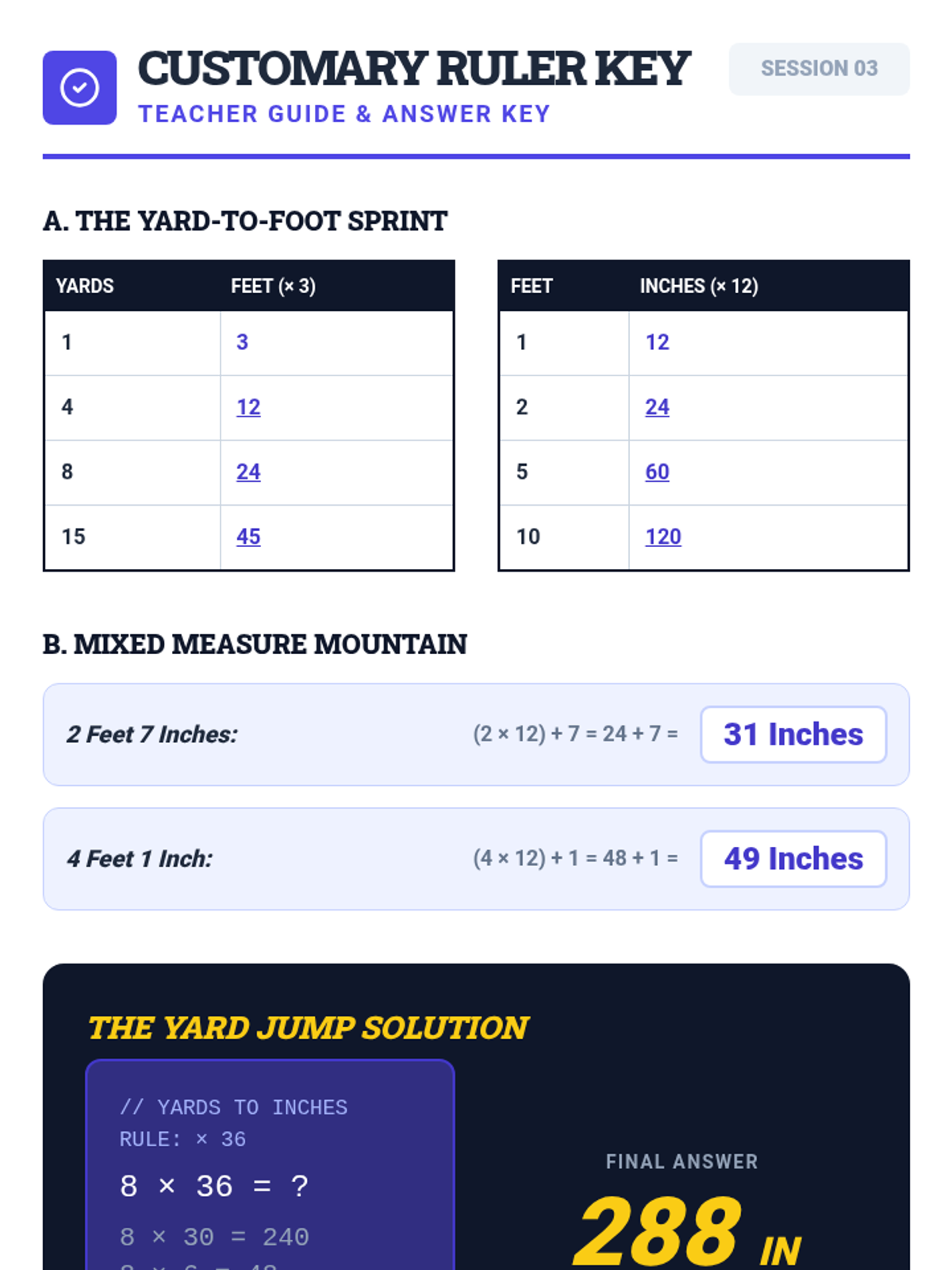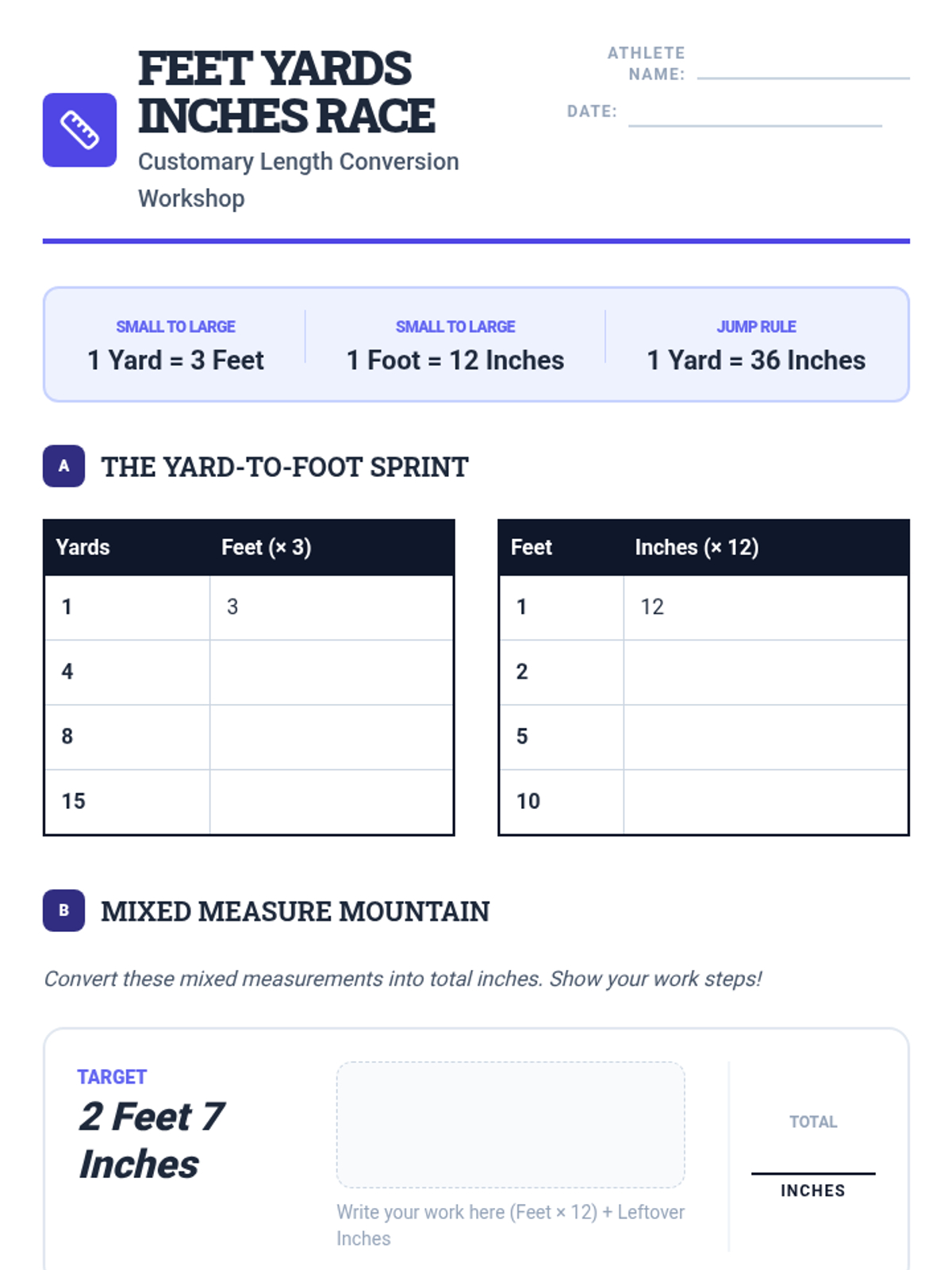 A comprehensive sequence focusing on linear measurement conversions, providing step-by-step visual guides and practice for converting between inches, feet, yards, and miles.