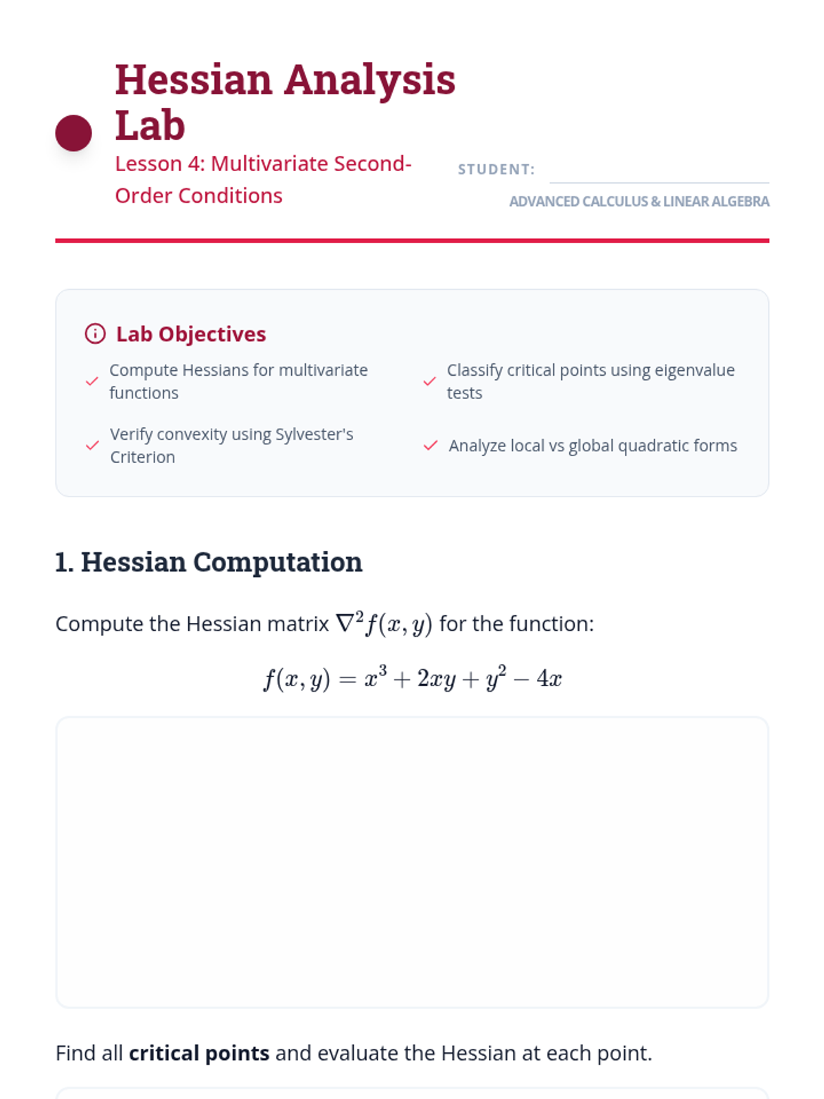 This sequence establishes the rigorous mathematical underpinnings necessary for advanced optimization work, moving beyond procedural calculus to analysis-based proofs. Students explore the intersection of topology, set theory, and multivariate calculus to determine the existence and uniqueness of optimal solutions.
