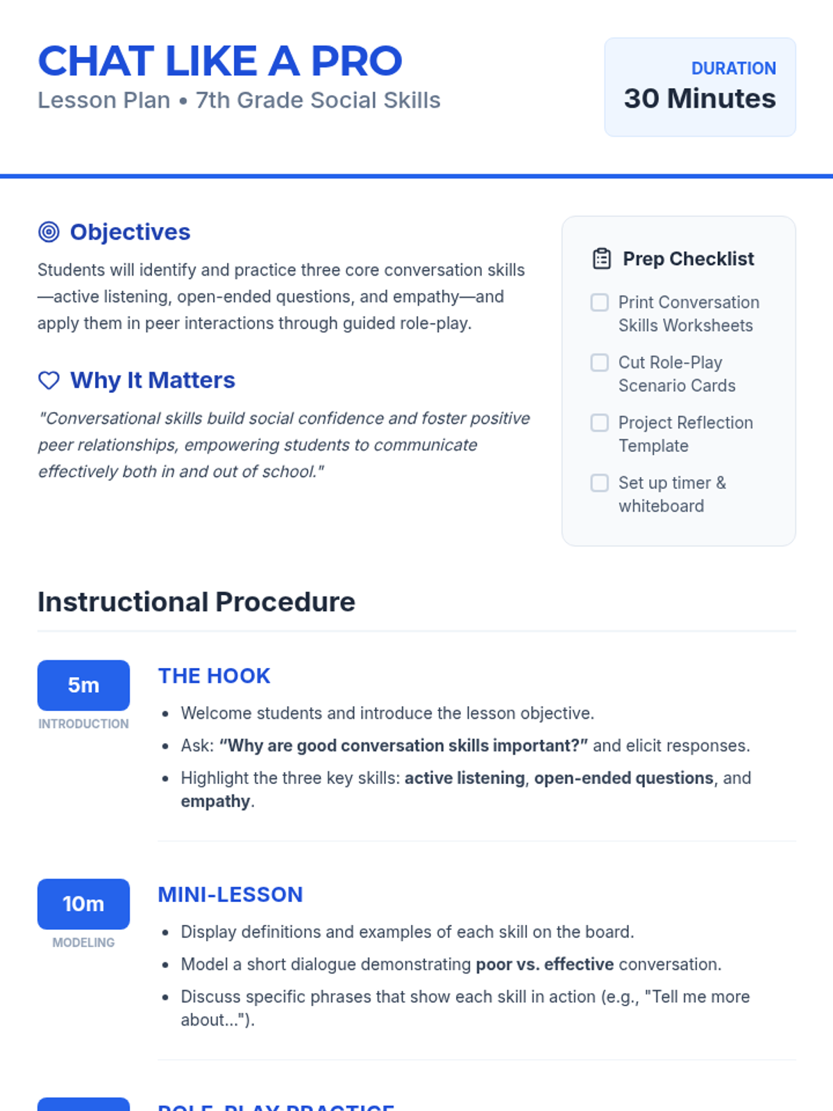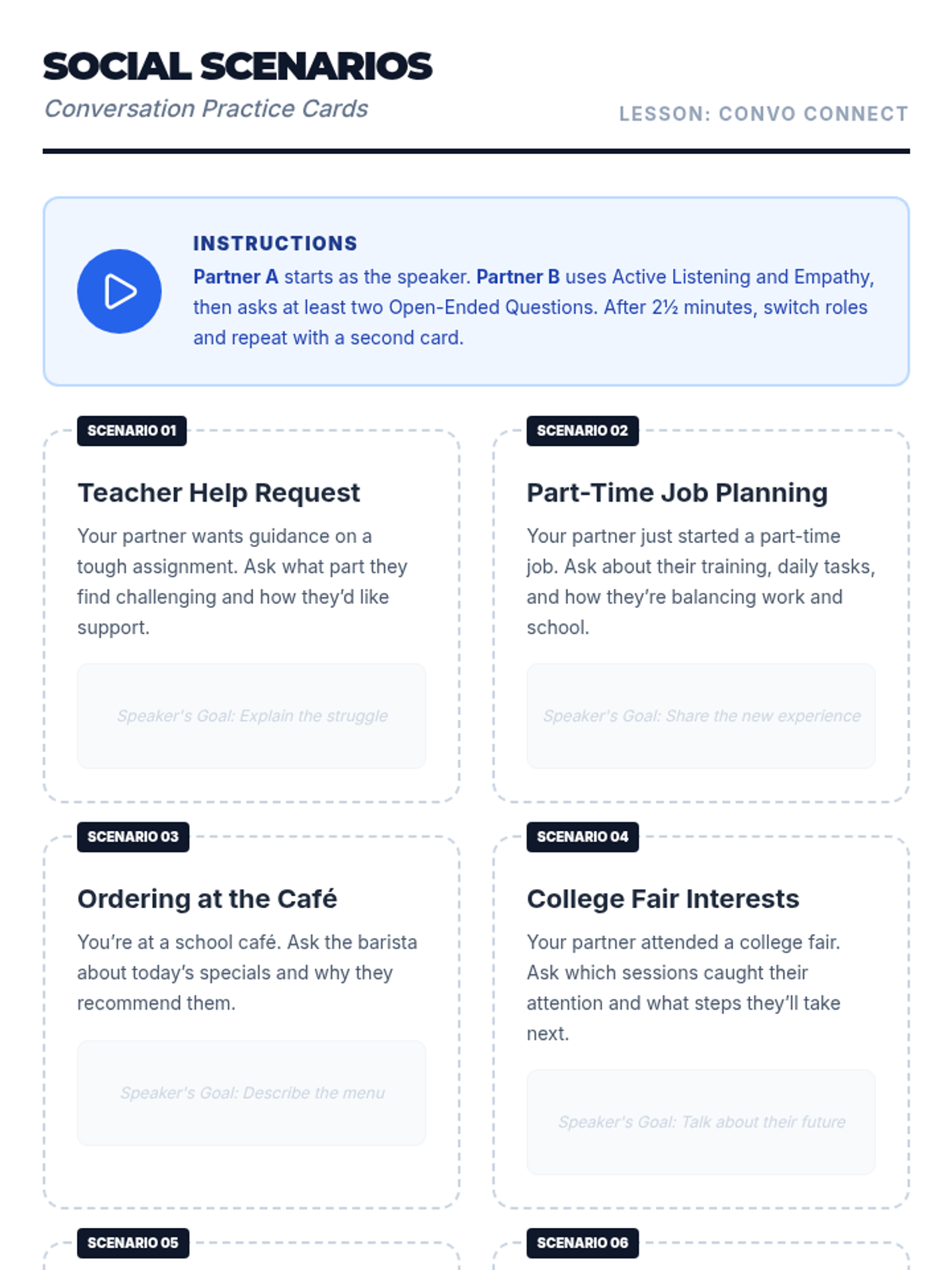A comprehensive sequence focused on developing essential conversational skills like active listening, empathy, and open-ended questioning, with tailored materials for middle school and high school life skills settings.