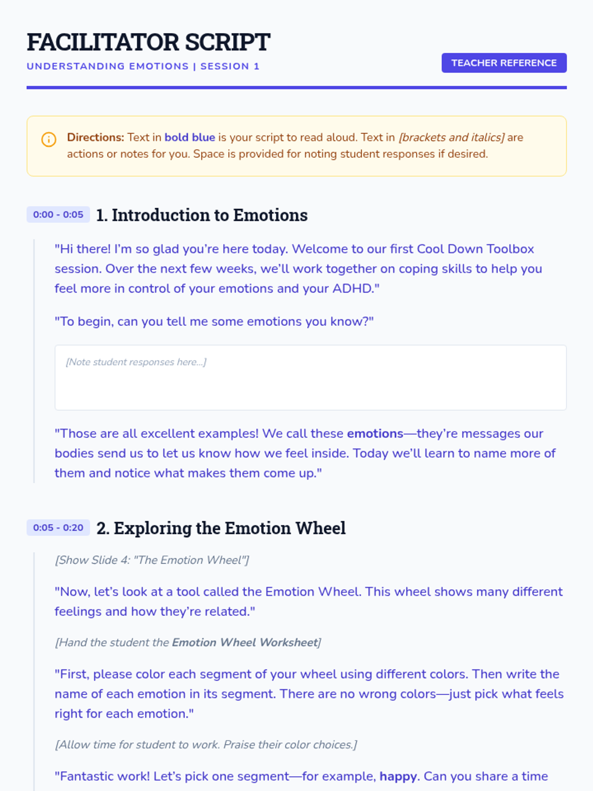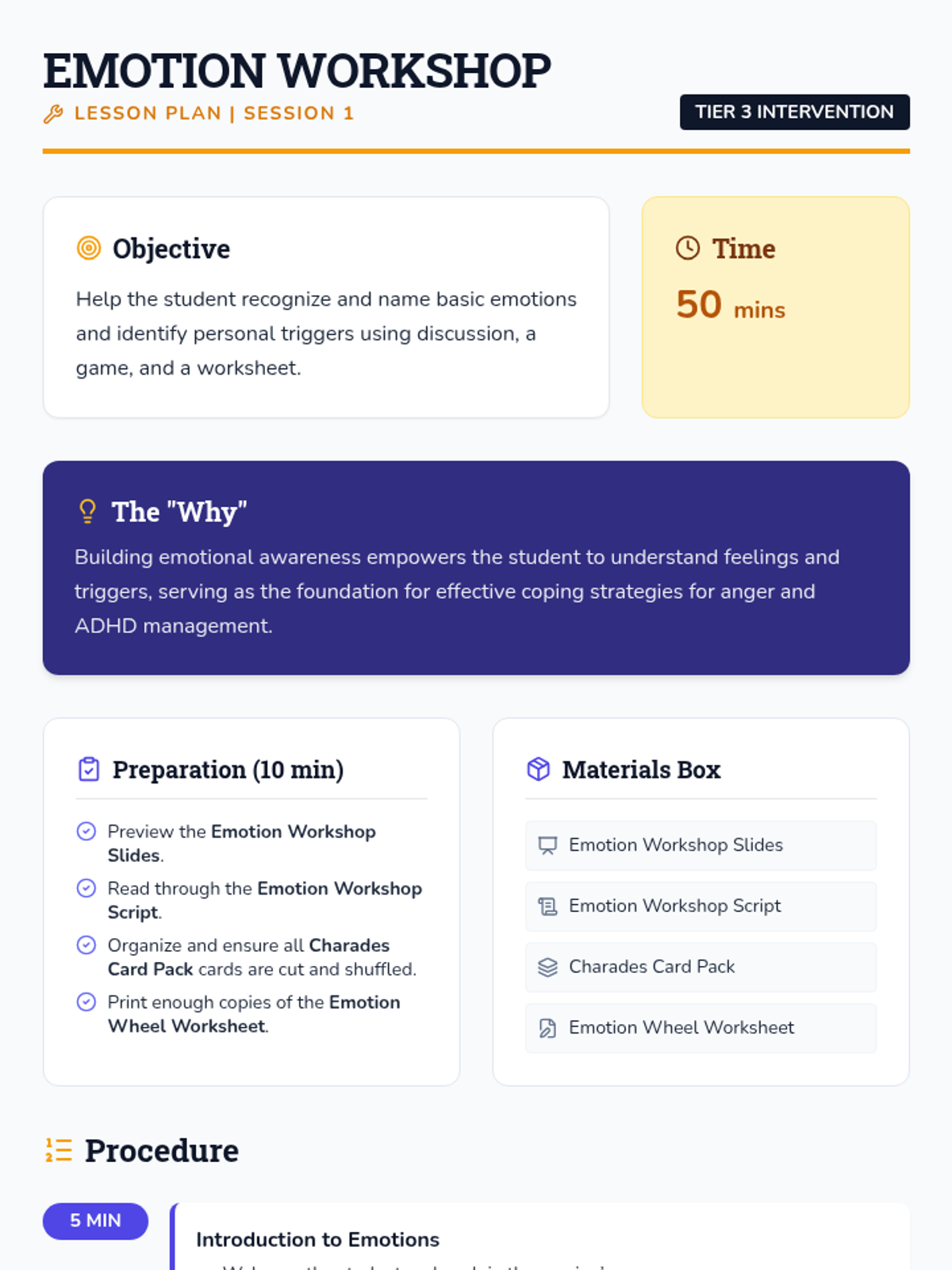 A 17-session individual intervention designed for middle school students to develop emotional regulation, anger management, and ADHD coping strategies through interactive games and hands-on activities.