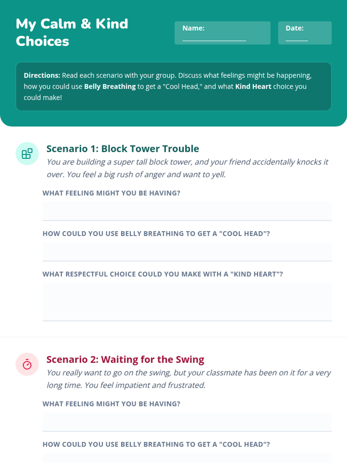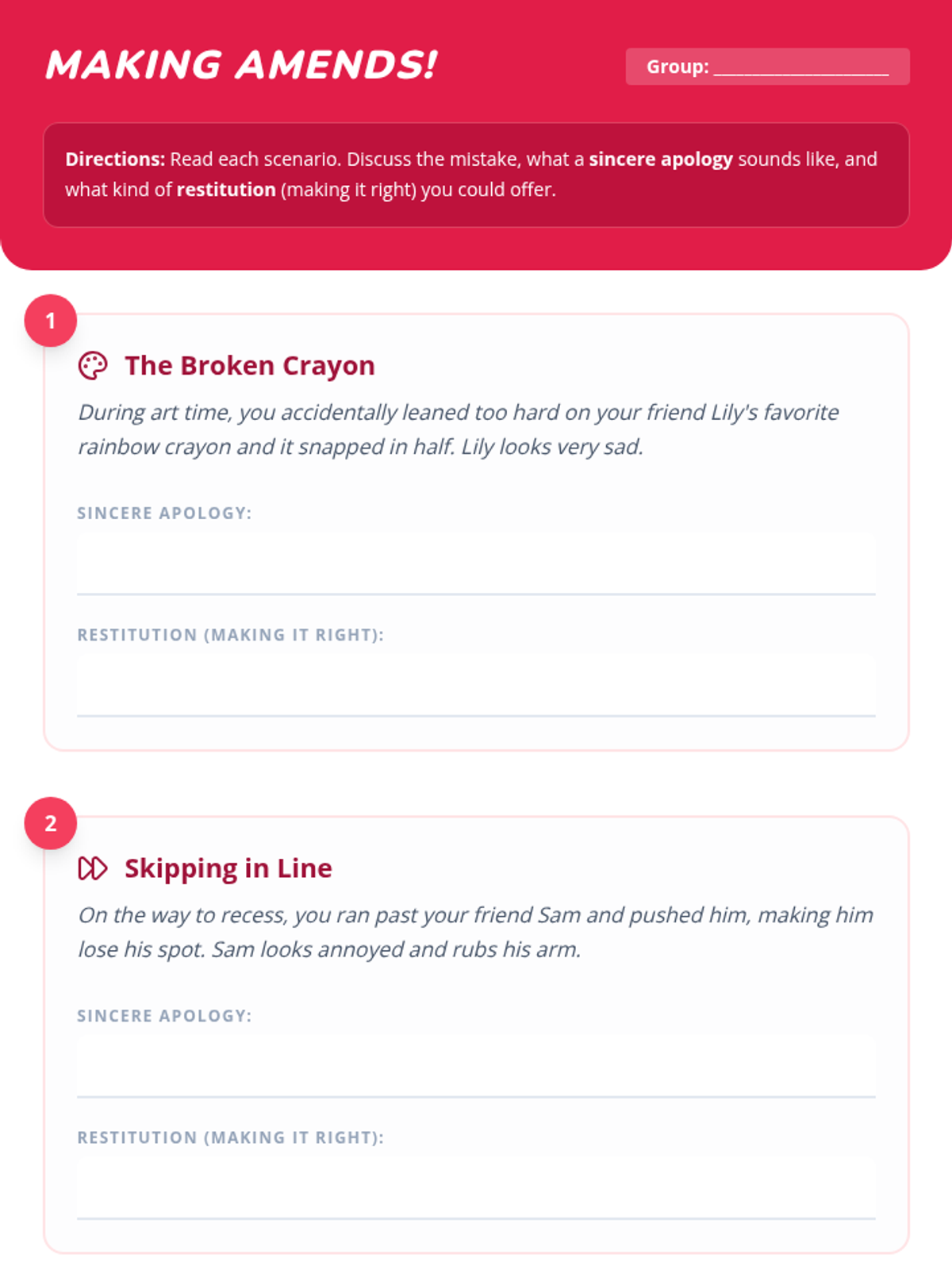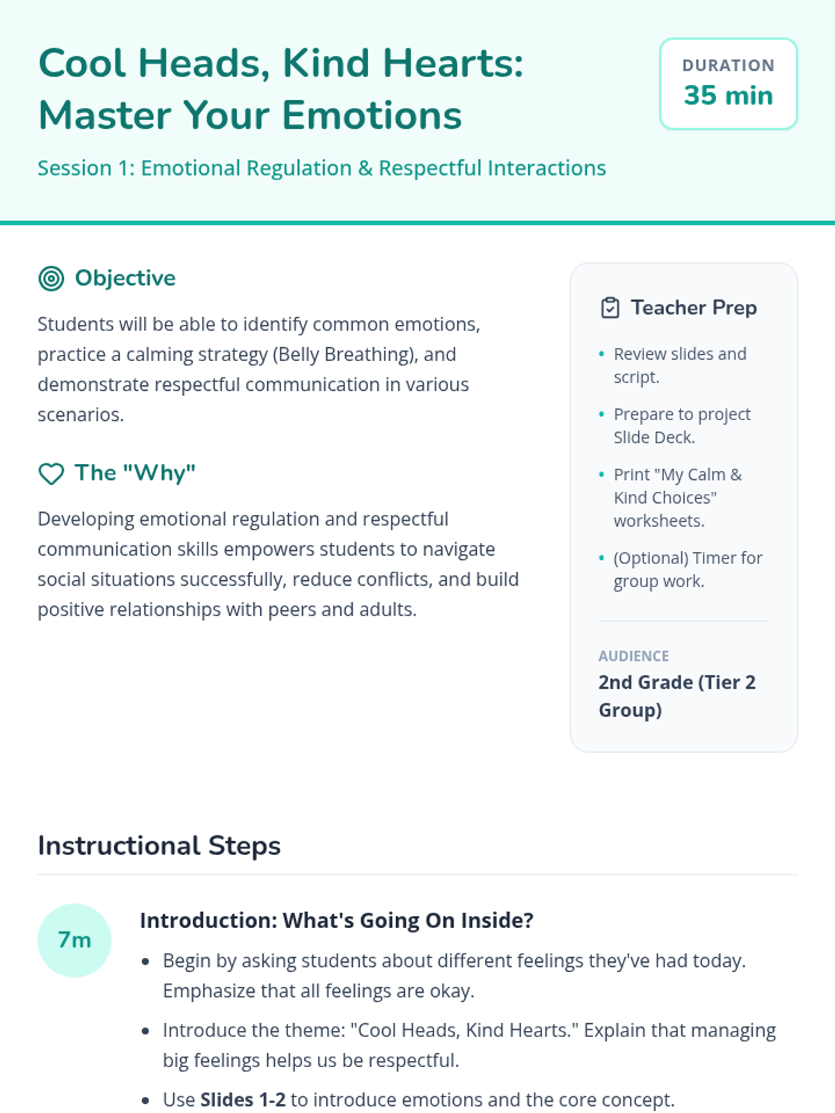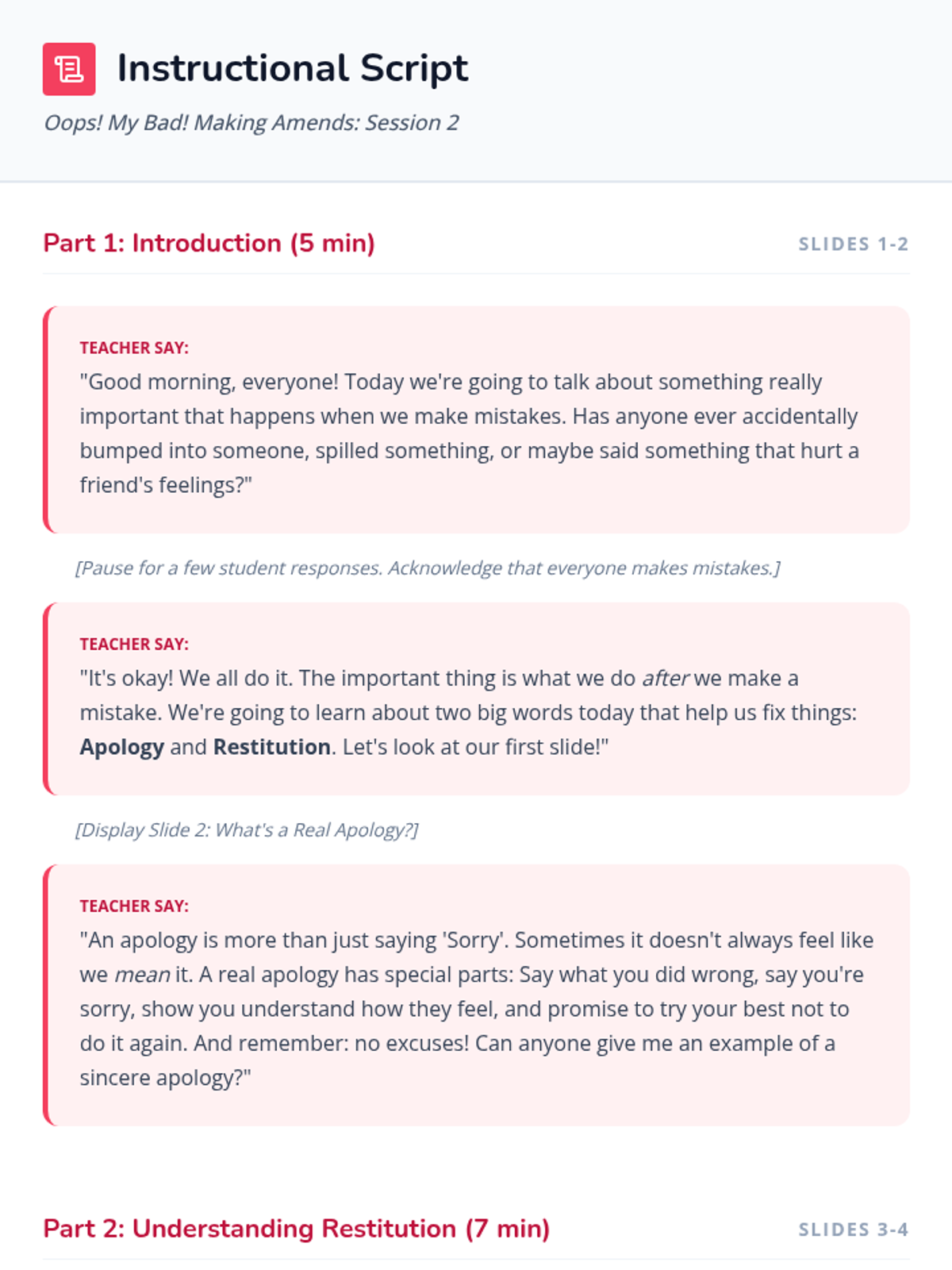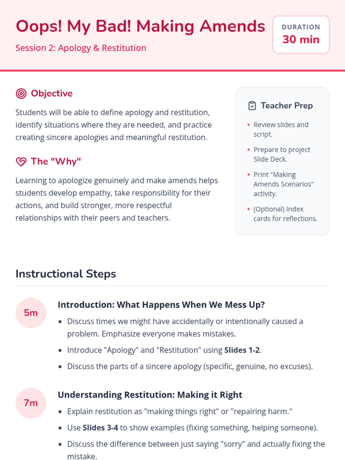 A two-session Tier 2 intervention sequence for second-grade students focusing on emotional regulation, respectful communication, and the process of making sincere apologies and restitution. Students learn to manage big feelings with calming strategies and repair relationships when mistakes happen.