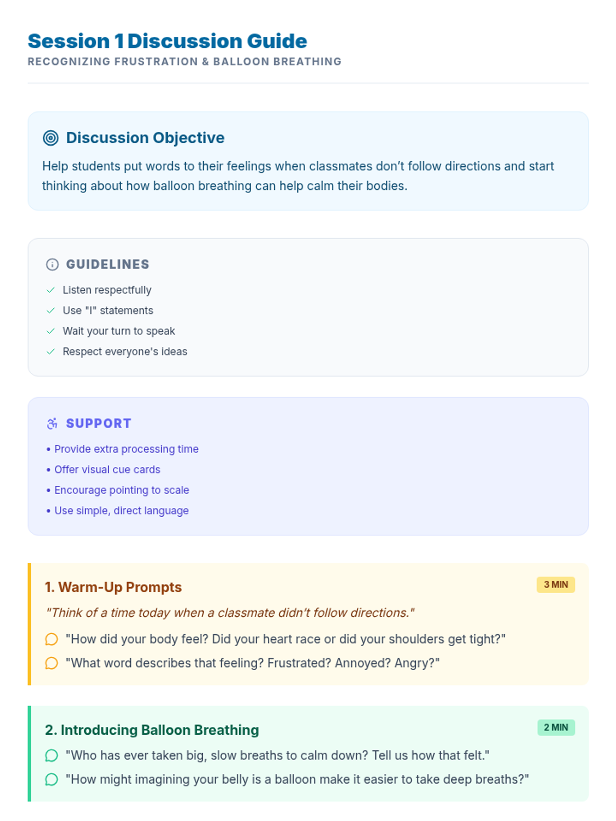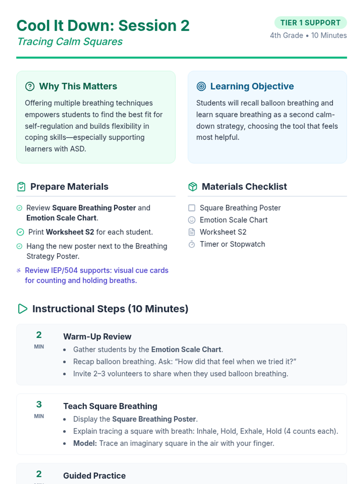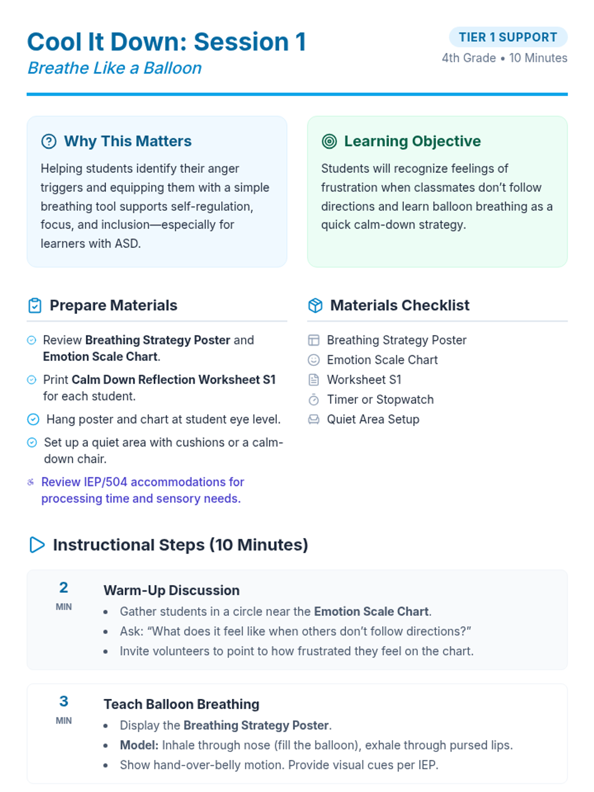 A 3-session unit for 4th grade students to learn and practice calm-down strategies like balloon breathing, square breathing, and 5-4-3-2-1 grounding to manage frustration when classmates don't follow directions.