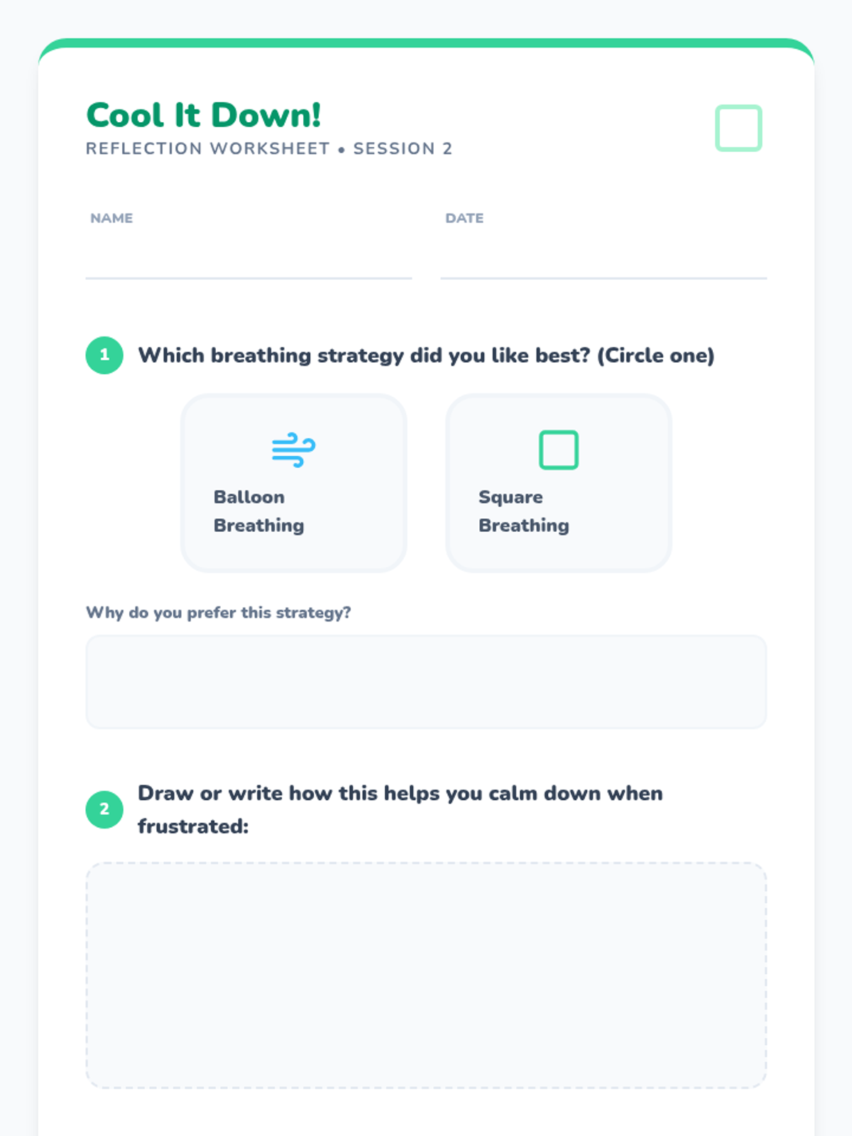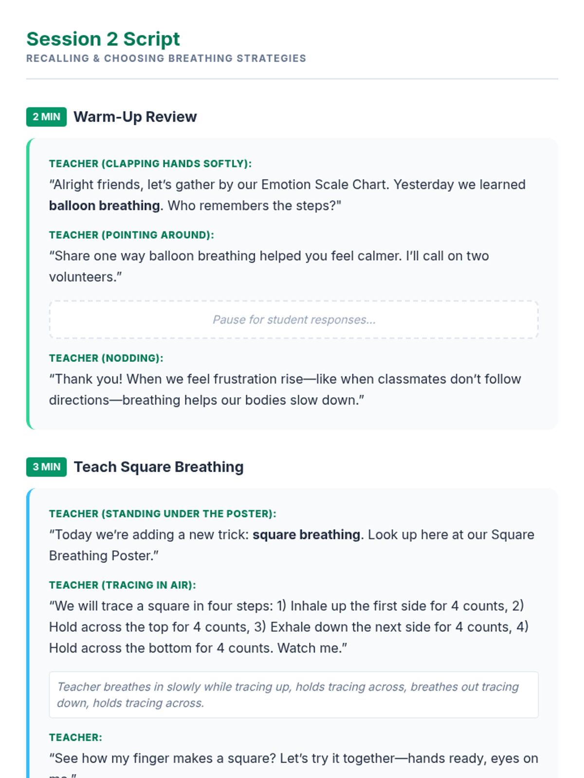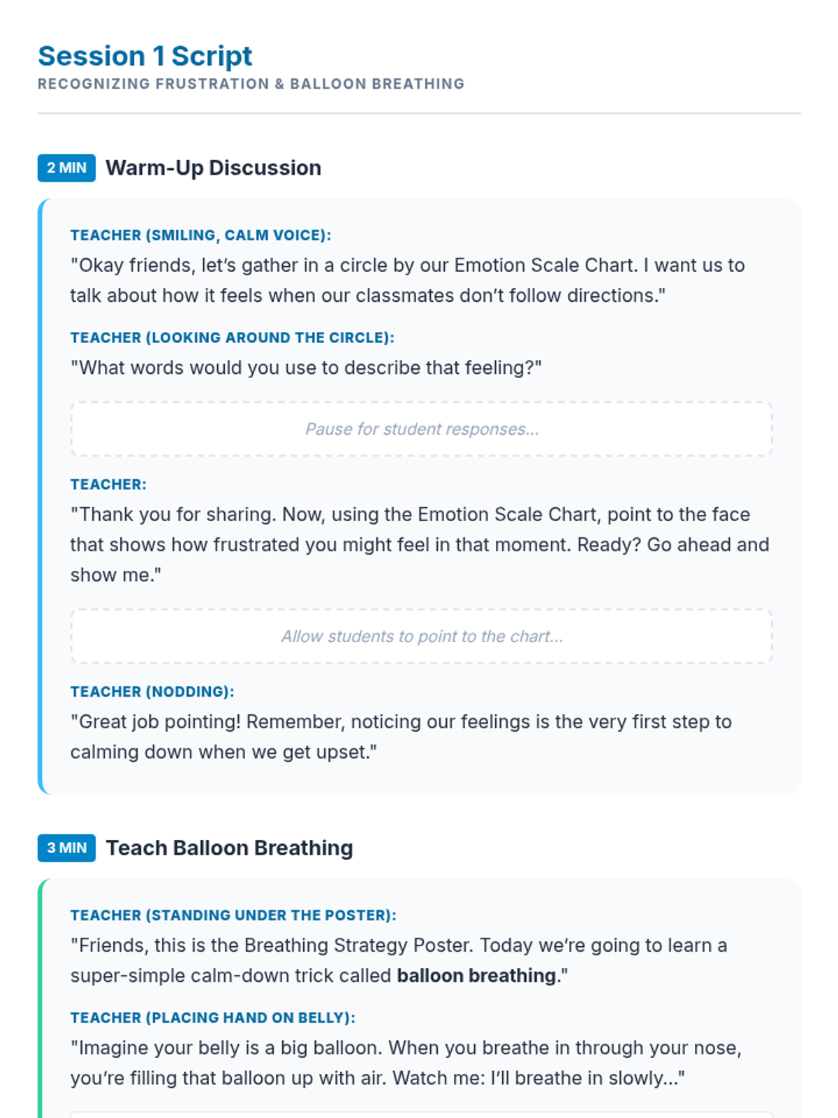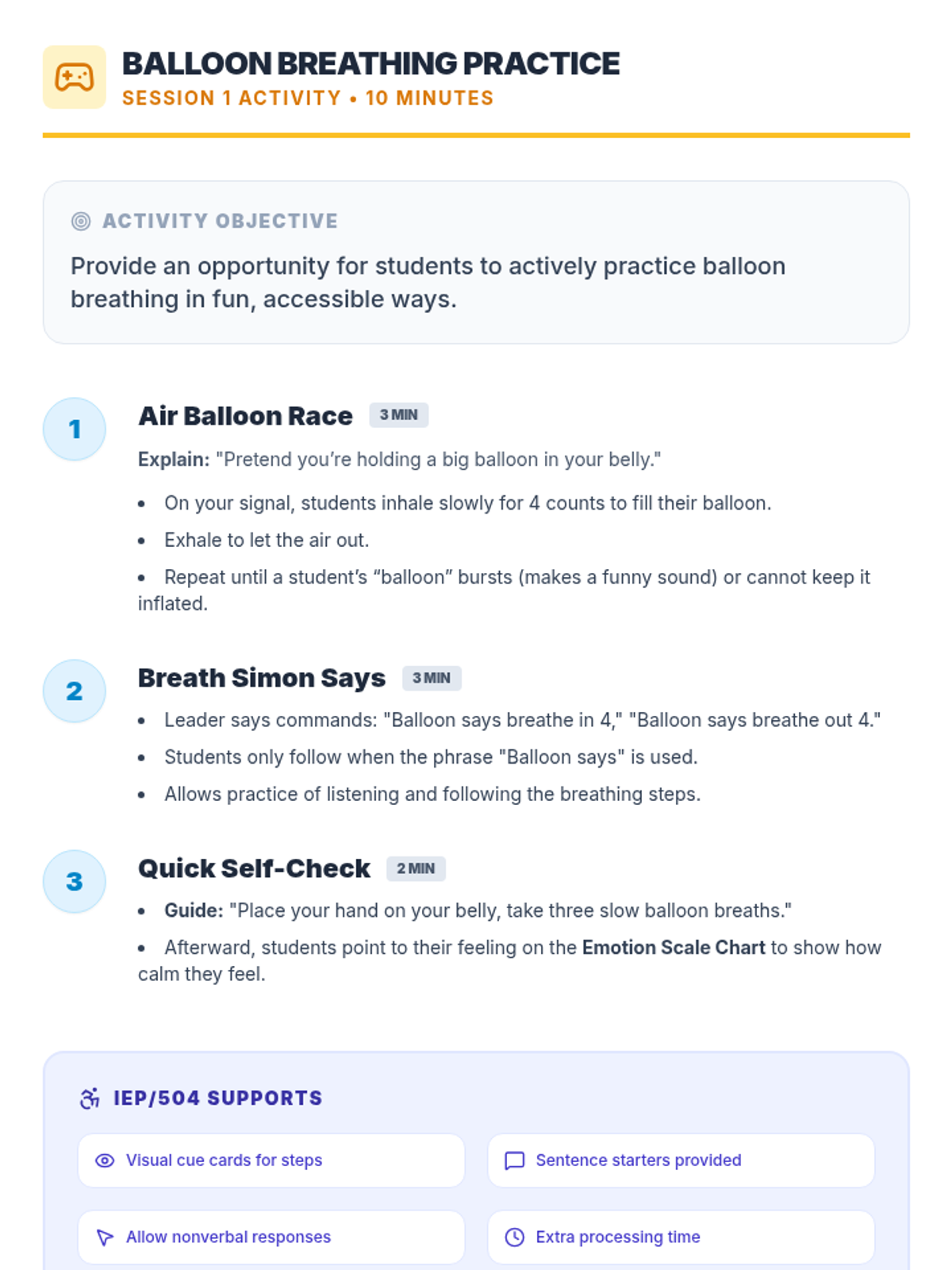 A 3-session unit for 4th grade students to learn and practice calm-down strategies like balloon breathing, square breathing, and 5-4-3-2-1 grounding to manage frustration when classmates don't follow directions.