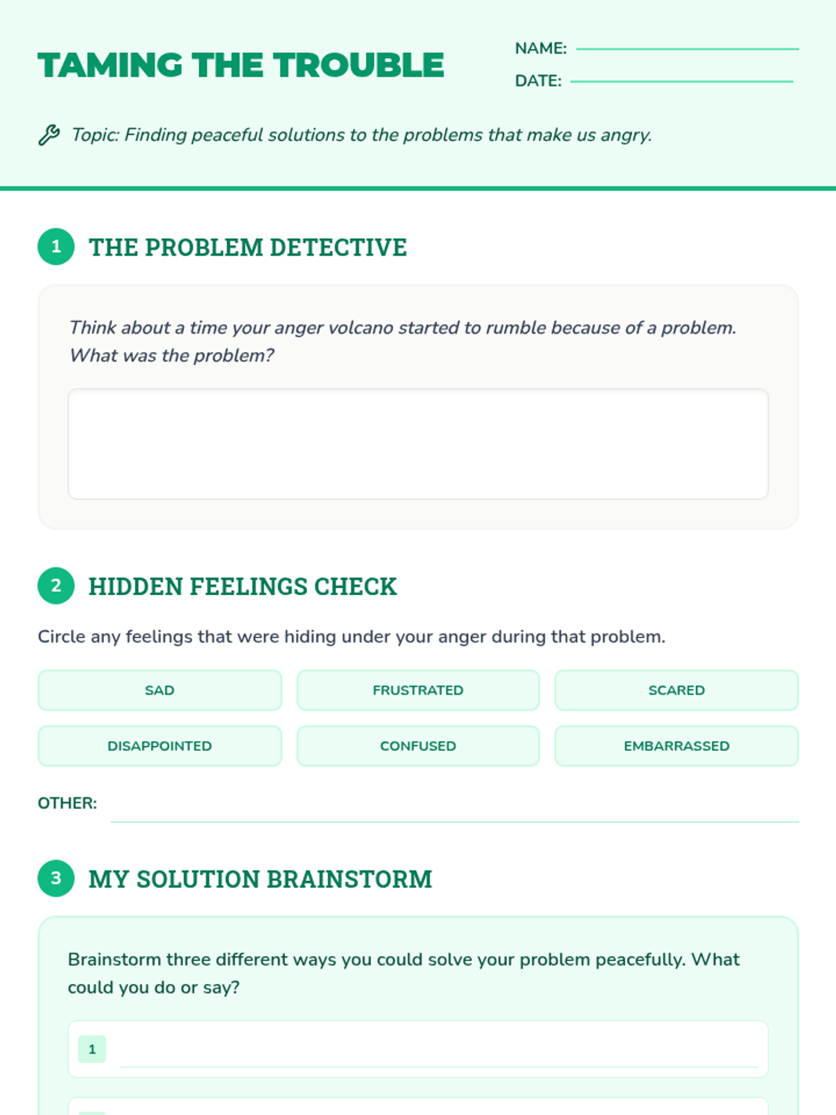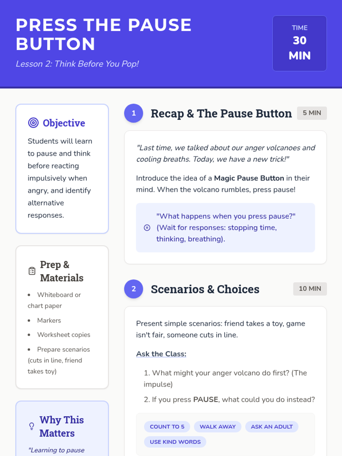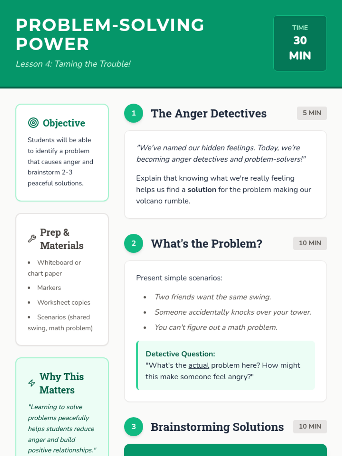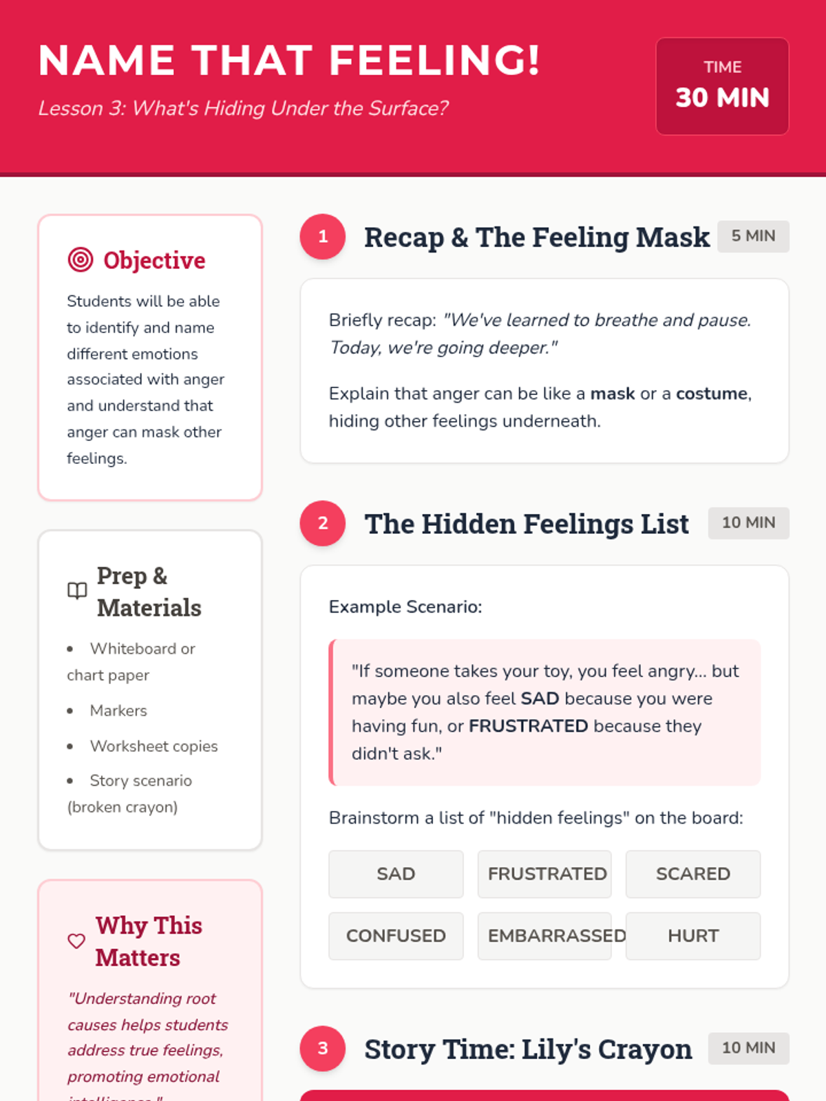 A 5-lesson sequence for third graders to identify, understand, and manage anger using the metaphor of a volcano, focusing on breathing, pausing, underlying emotions, and communication.