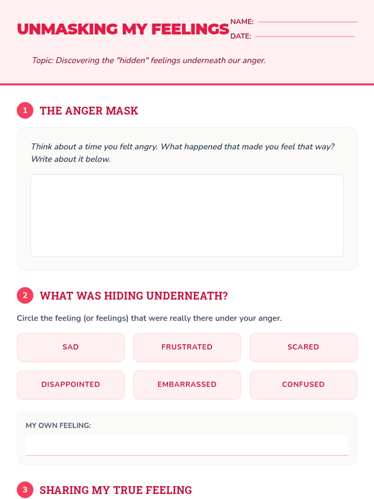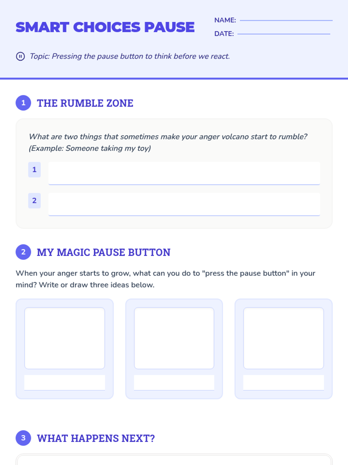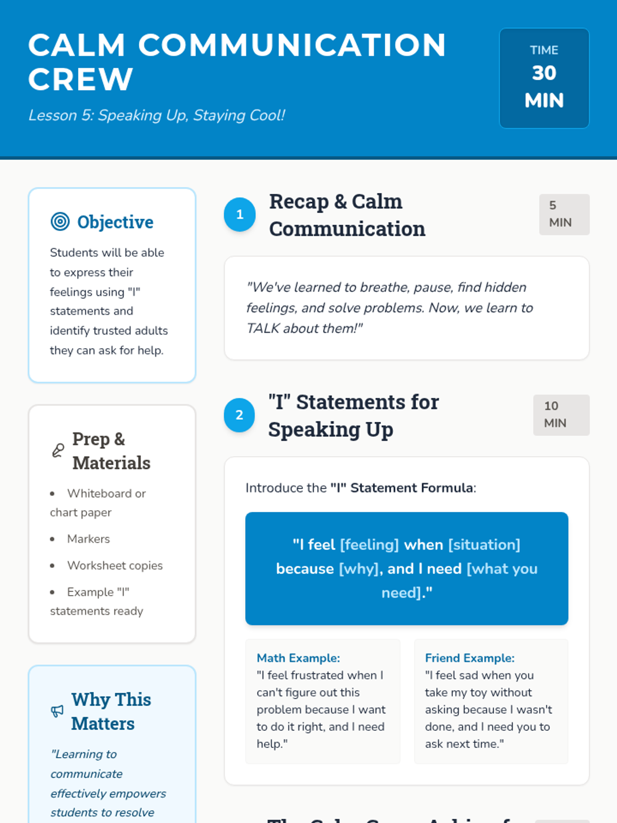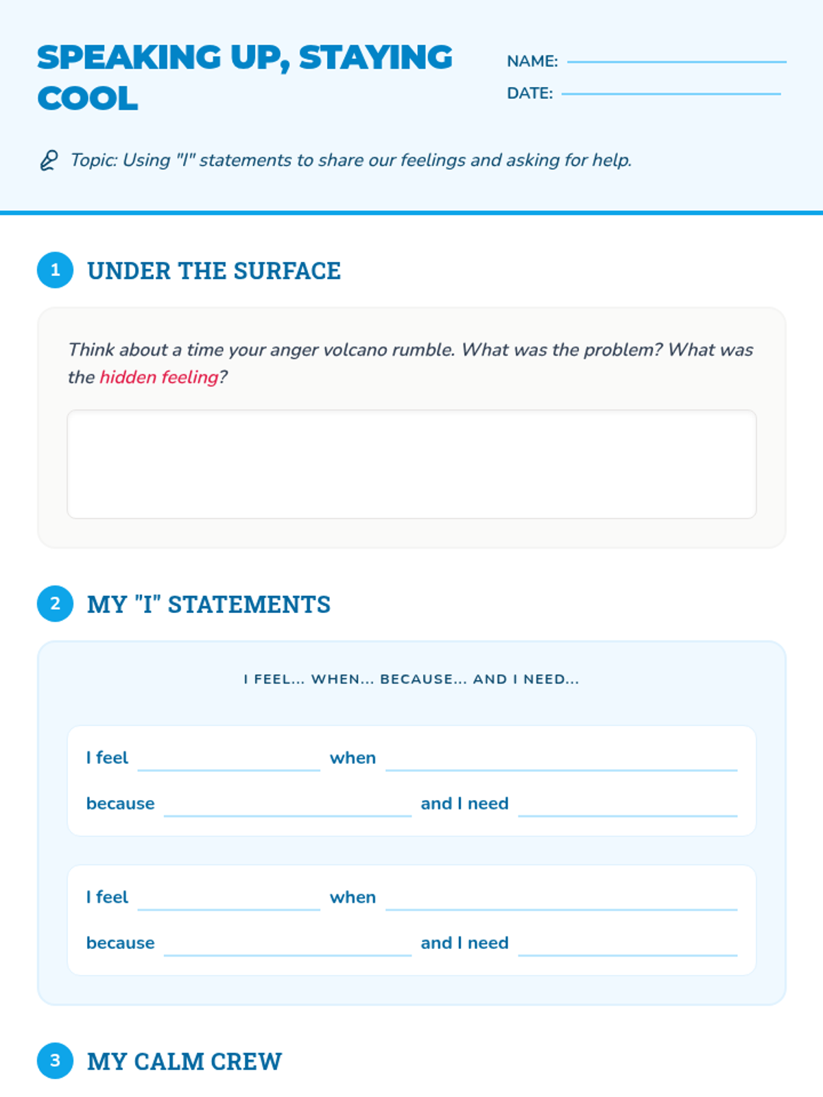 A 5-lesson sequence for third graders to identify, understand, and manage anger using the metaphor of a volcano, focusing on breathing, pausing, underlying emotions, and communication.