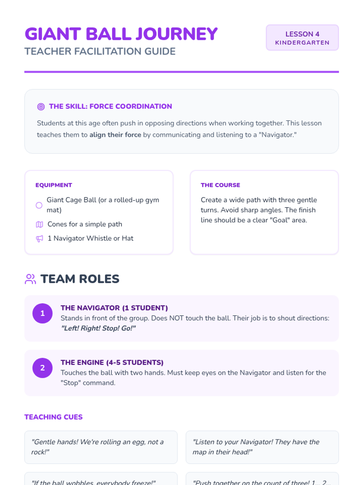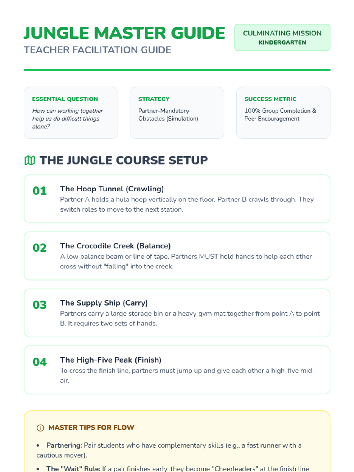 A Kindergarten Physical Education sequence focused on cooperative play and group problem-solving. Students use imaginative play and teamwork to overcome challenges without competition.