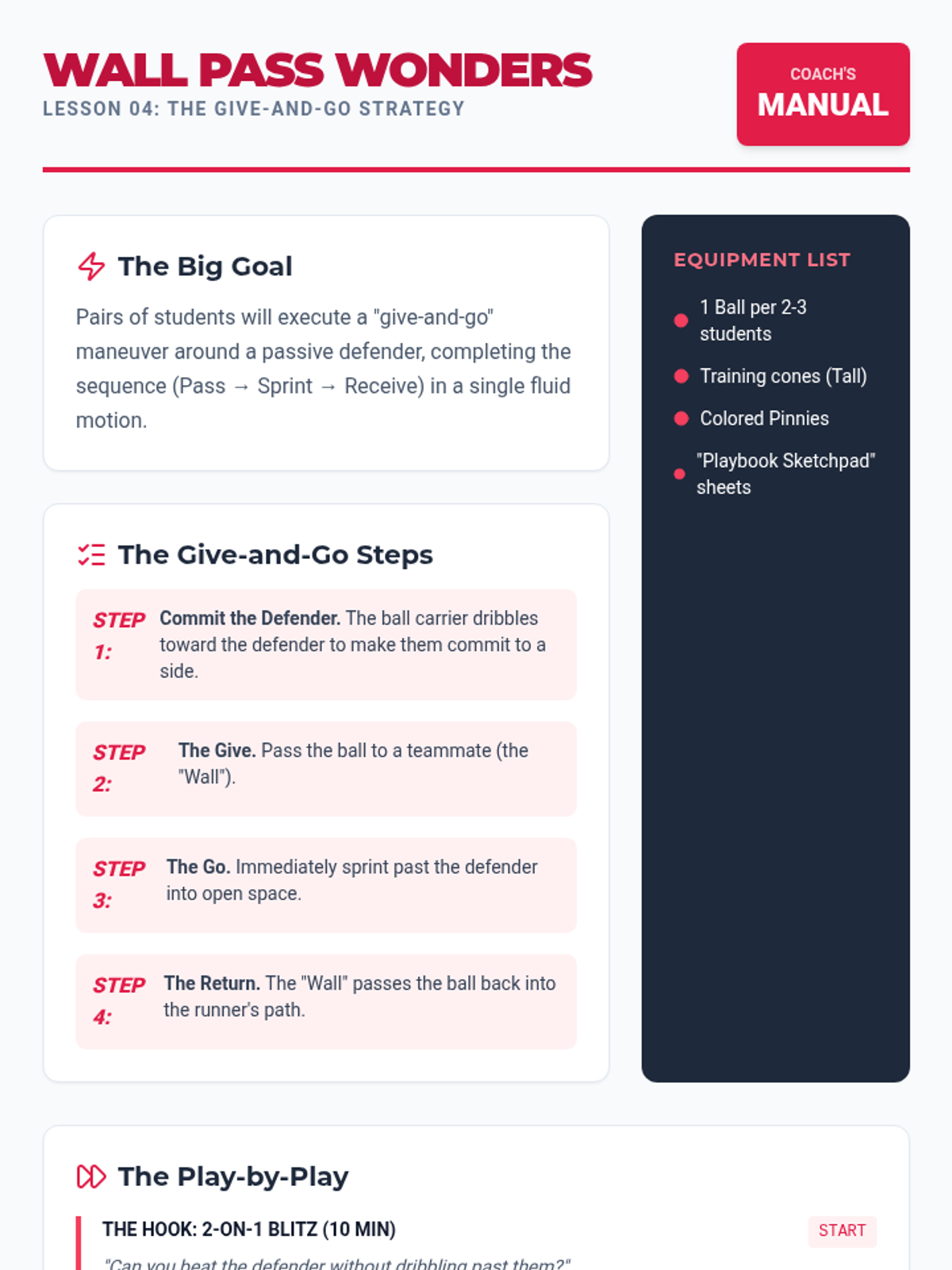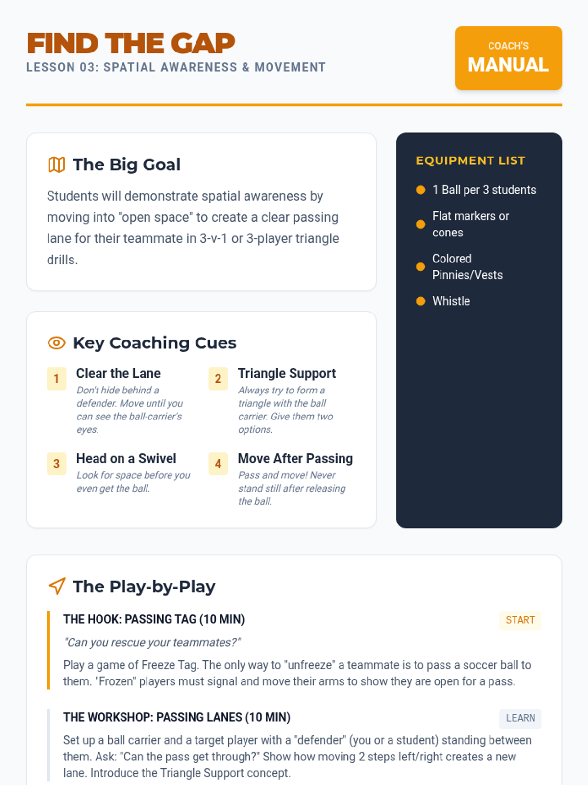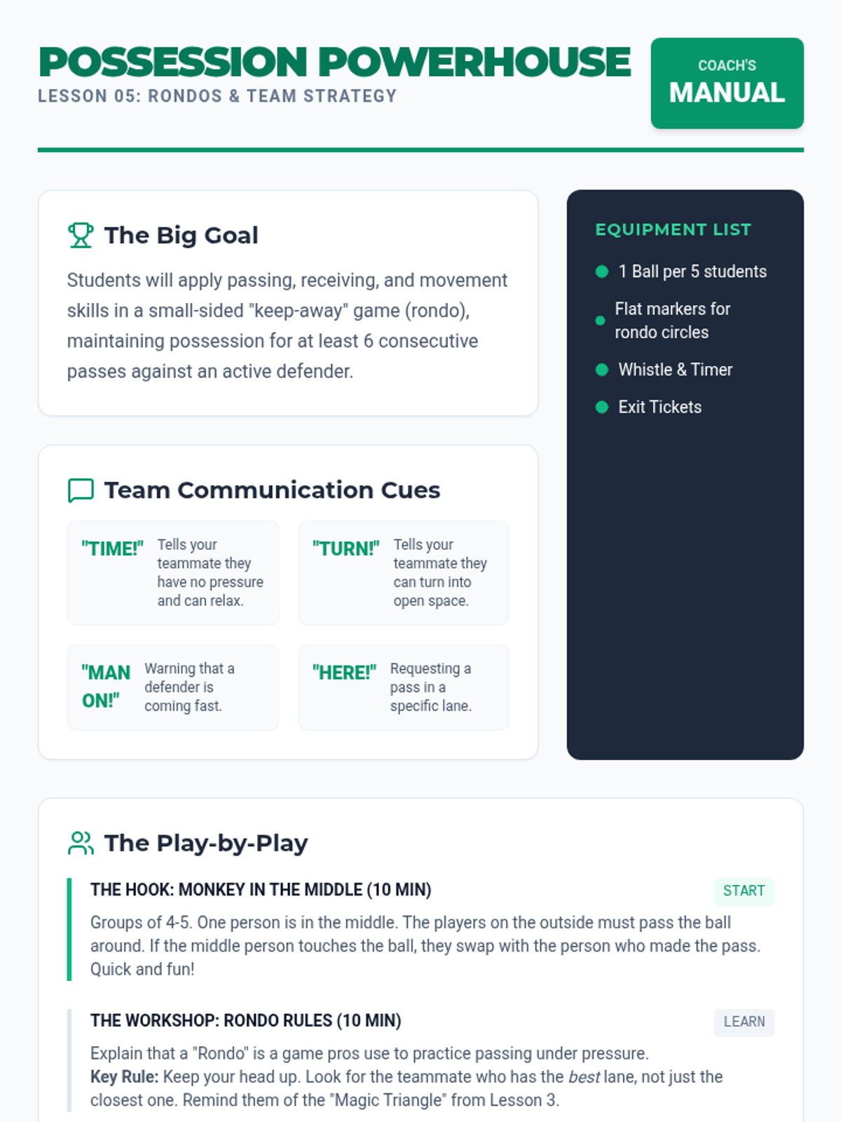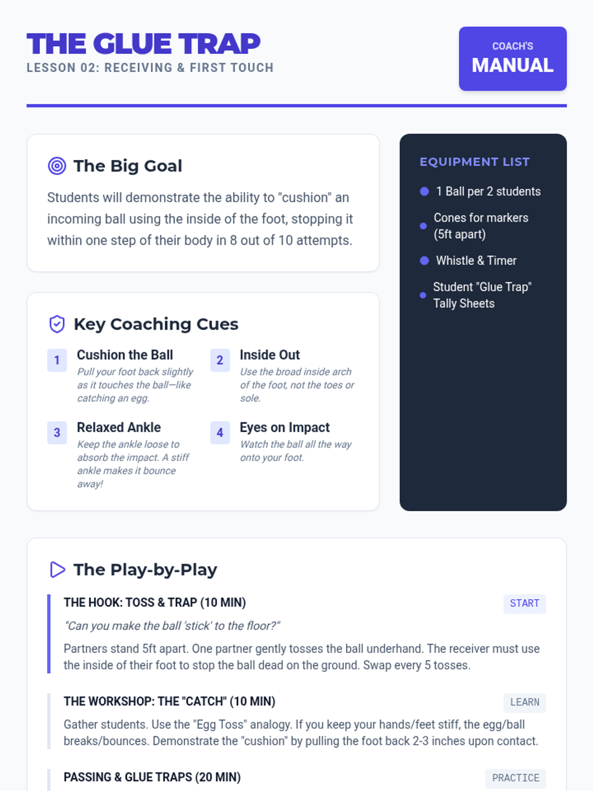 A 4th-grade physical education unit focused on the fundamentals of soccer passing and receiving. Students progress from isolated technique to dynamic team strategies like the give-and-go and maintaining possession under pressure.