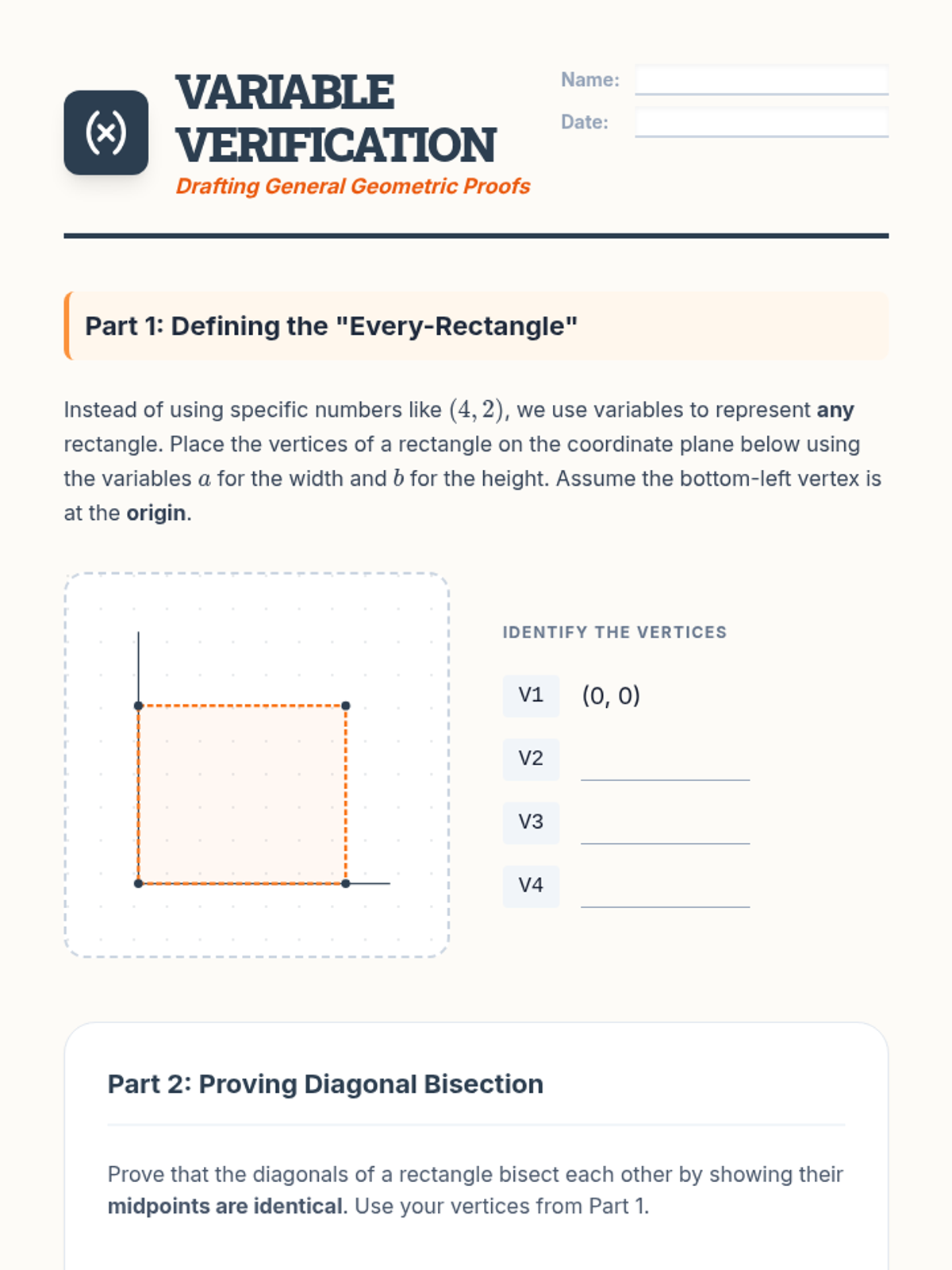 A 10th-grade geometry unit that bridges algebra and geometry by using coordinate methods (slope, distance, and midpoint formulas) to classify polygons and write formal coordinate proofs. Students progress from verifying specific shapes to generalizing geometric properties using variables.