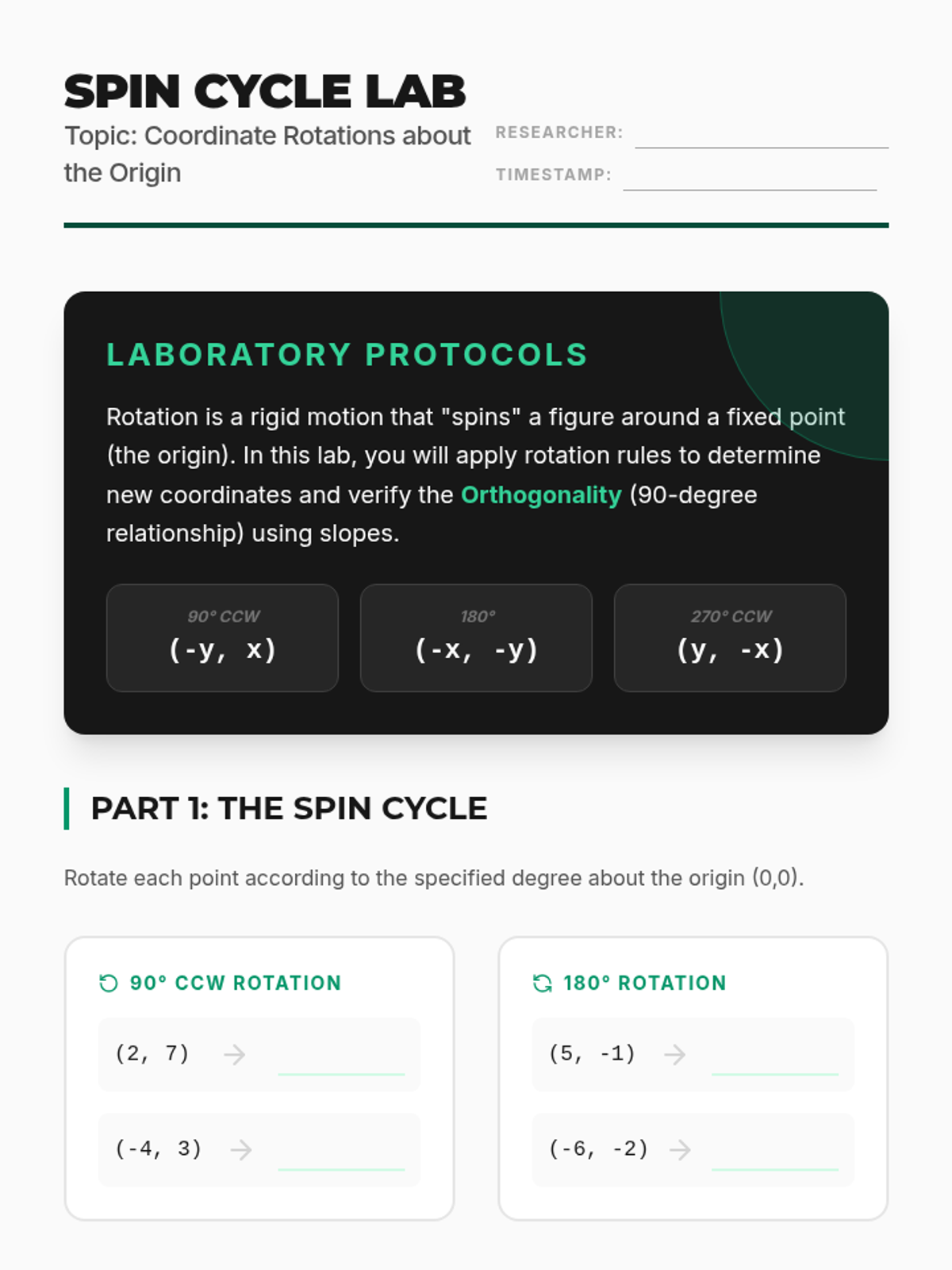 A 5-lesson geometry sequence where students master rigid motions on the coordinate plane. From translations to complex rotations, students learn to express geometric changes as algebraic functions and verify congruence using the distance formula.