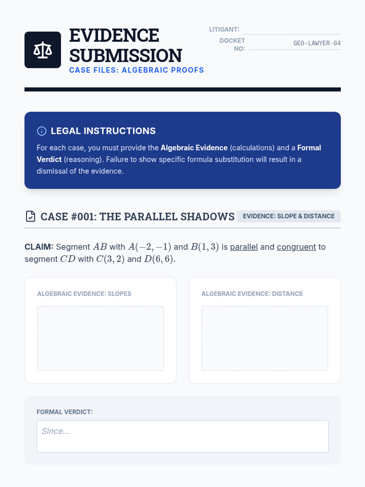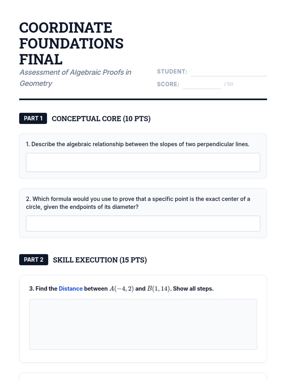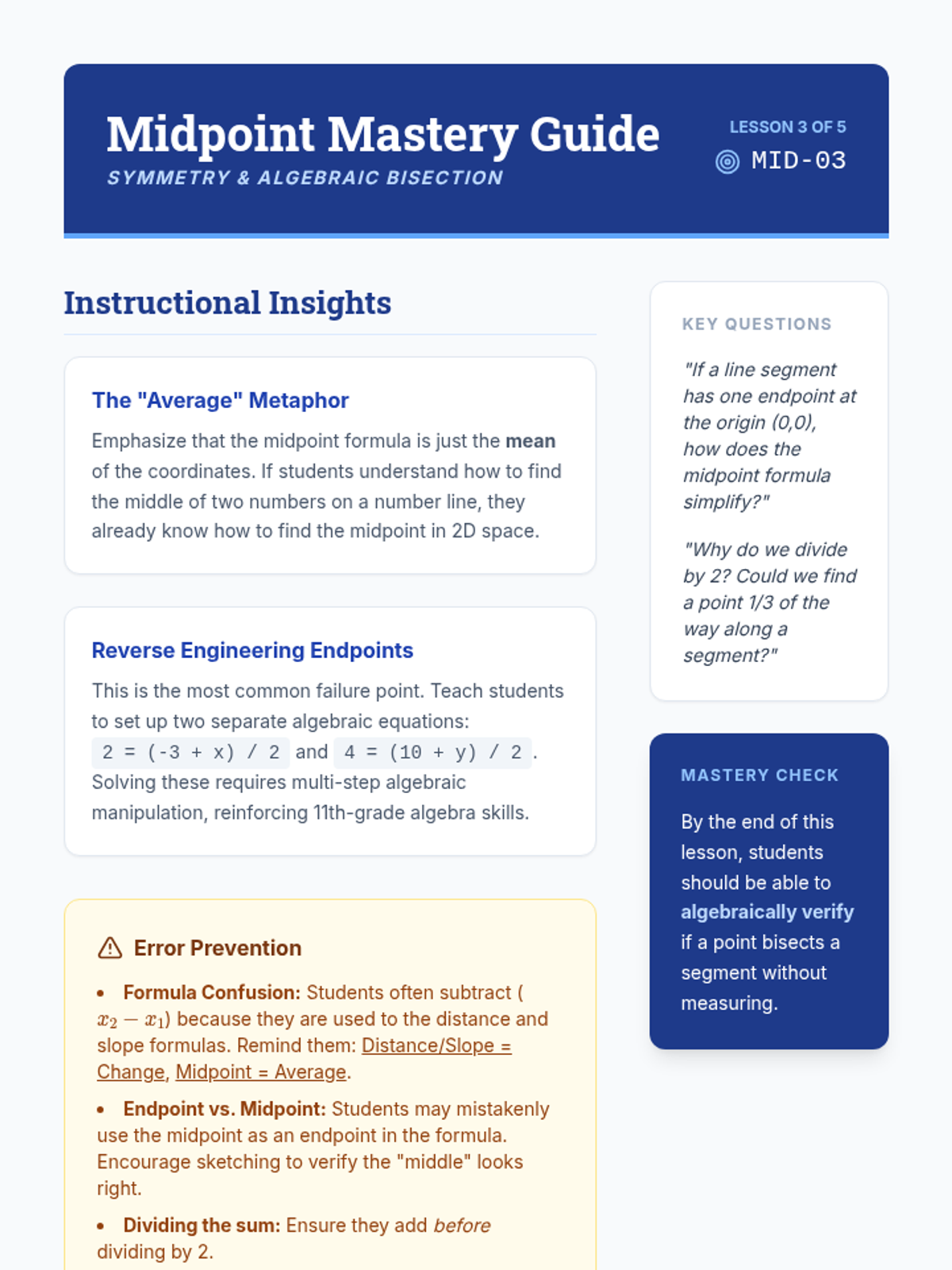 This sequence explores the intersection of algebra and geometry, focusing on using the Cartesian plane to prove geometric theorems. Students derive and apply distance, midpoint, and slope formulas to provide algebraic evidence for geometric relationships.