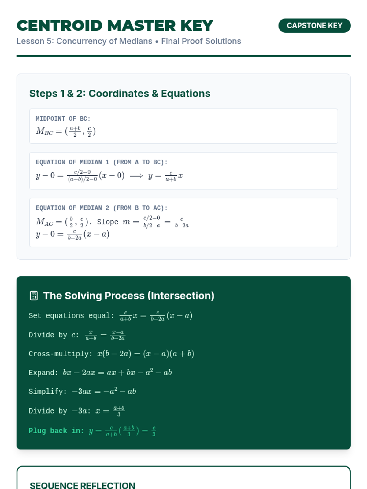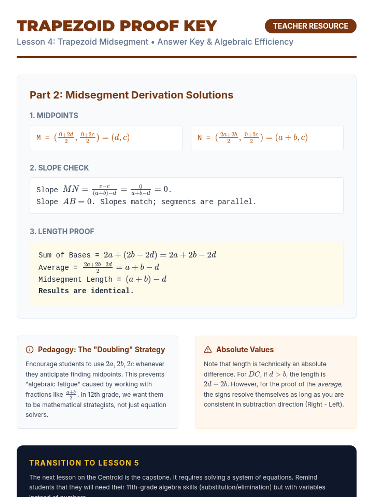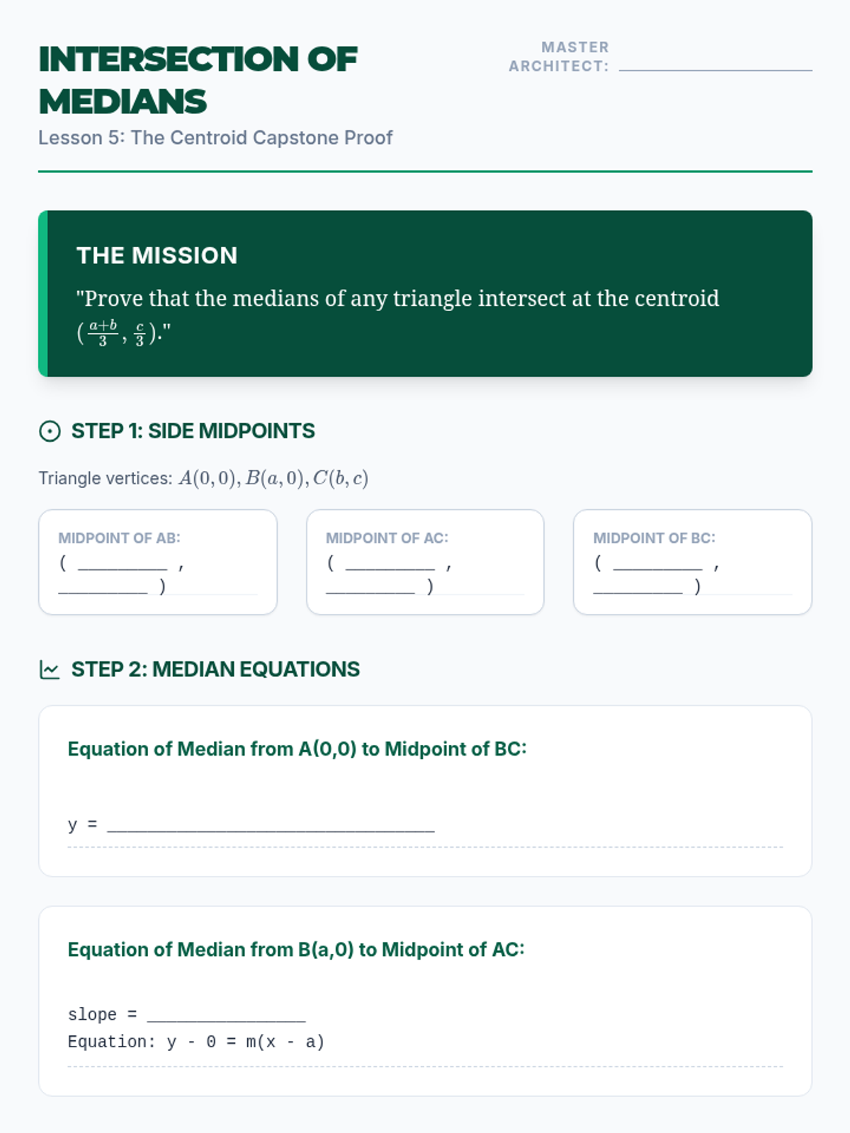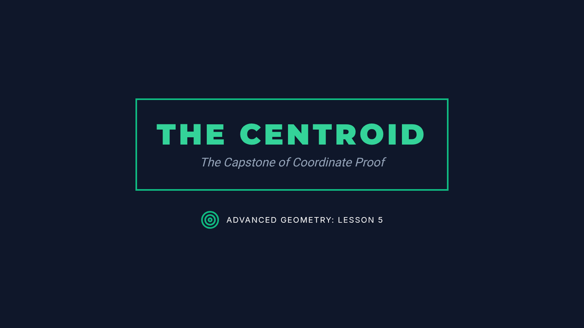 An advanced 12th-grade sequence on coordinate geometry proofs, focusing on strategic shape placement, algebraic manipulation with general variables, and proving classic theorems like the trapezoid midsegment and the triangle centroid.