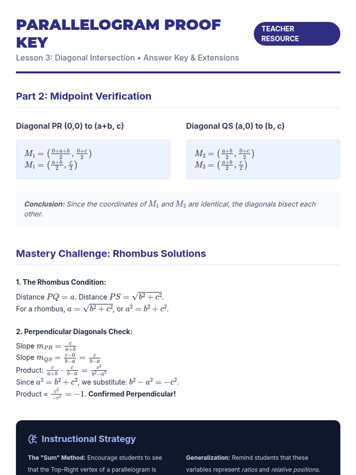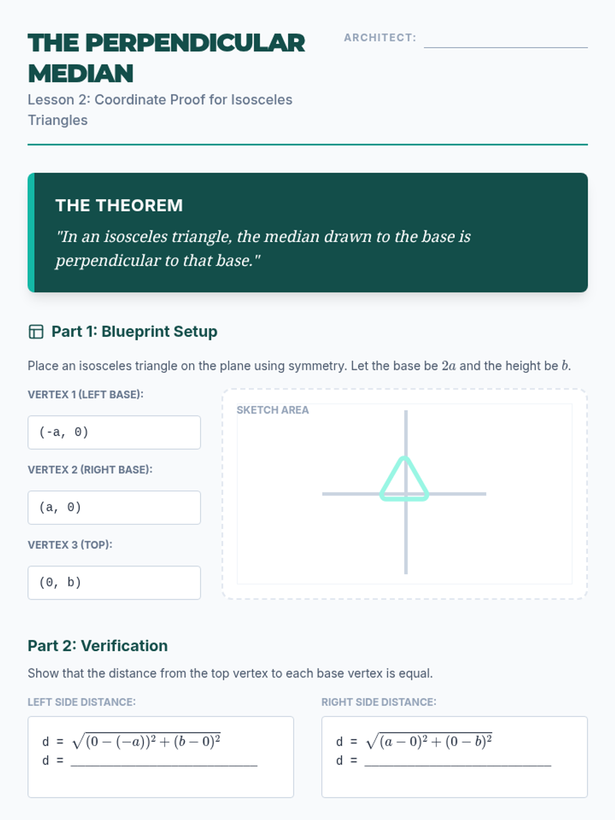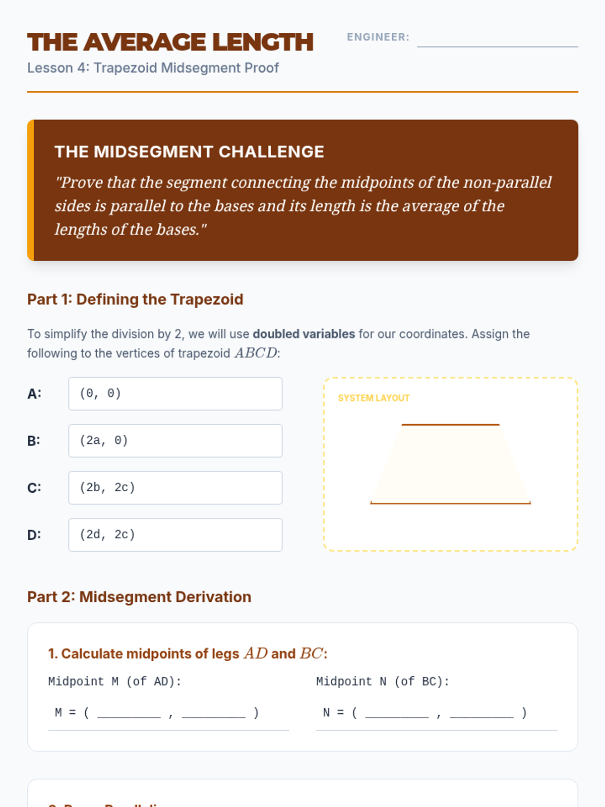 An advanced 12th-grade sequence on coordinate geometry proofs, focusing on strategic shape placement, algebraic manipulation with general variables, and proving classic theorems like the trapezoid midsegment and the triangle centroid.