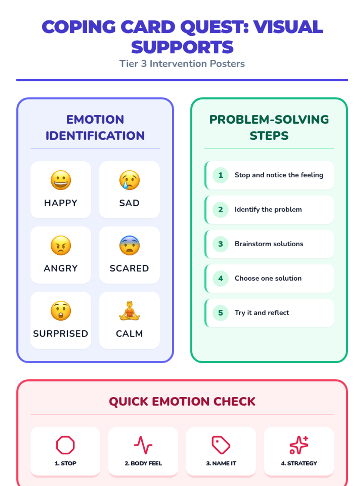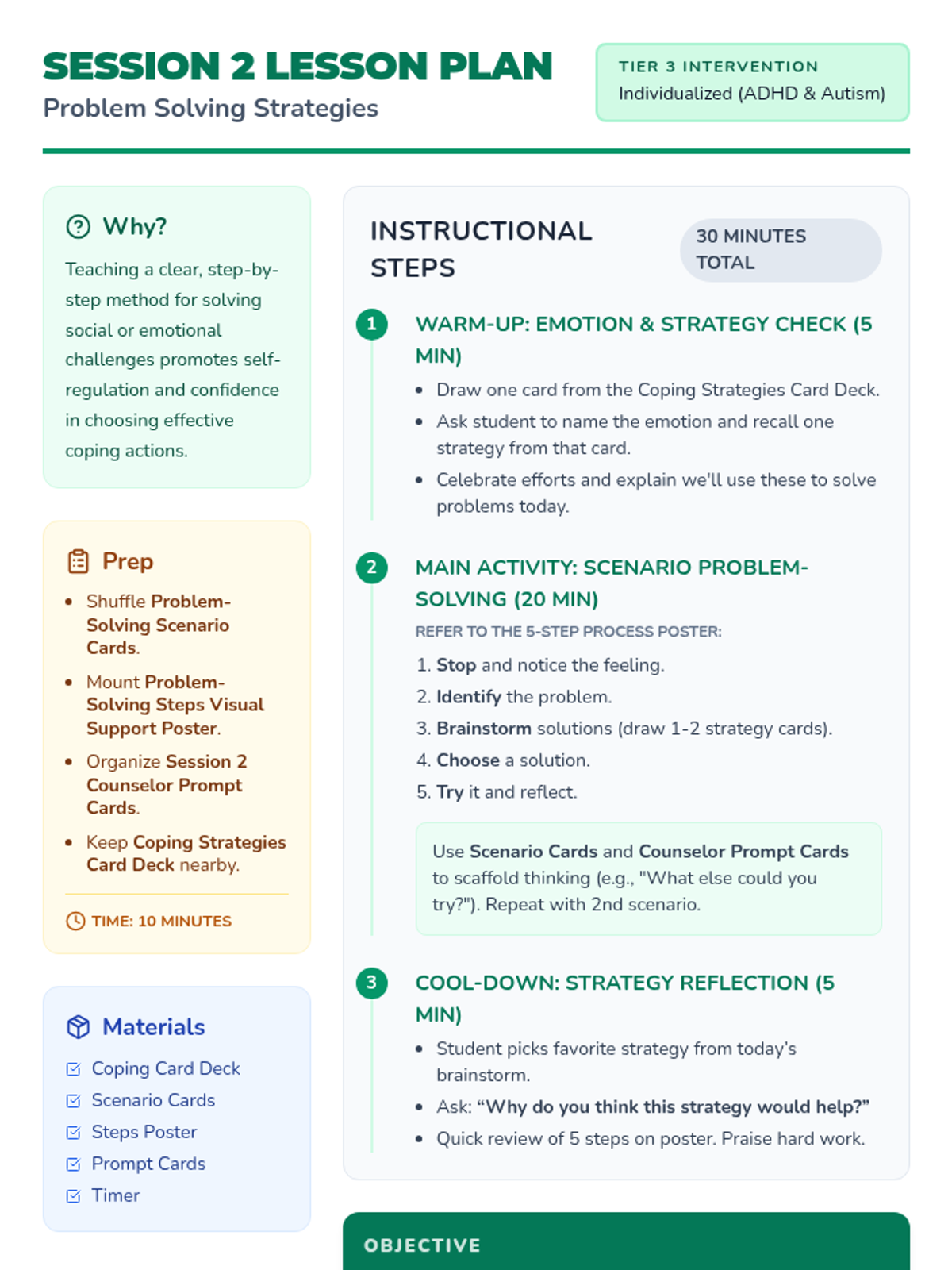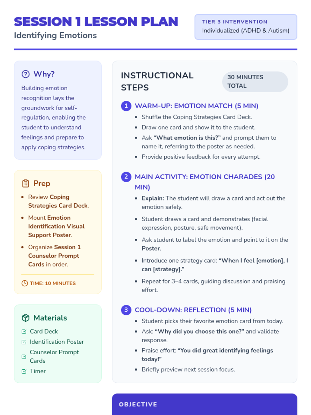 A 3-session intensive intervention program for 5th graders with ADHD and Autism, focusing on emotion identification, structured problem-solving, and real-time coping strategy application through game-based card activities.