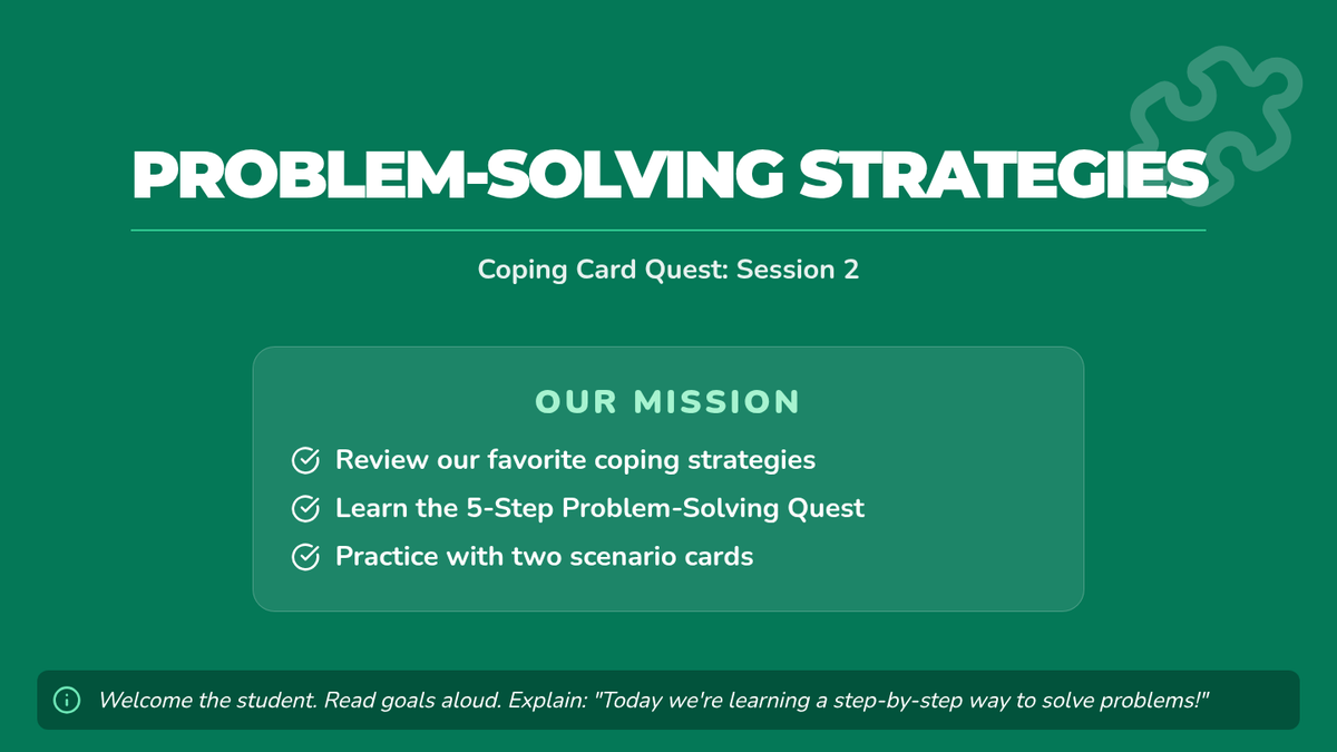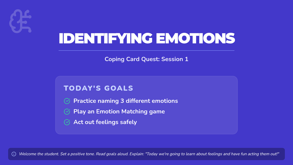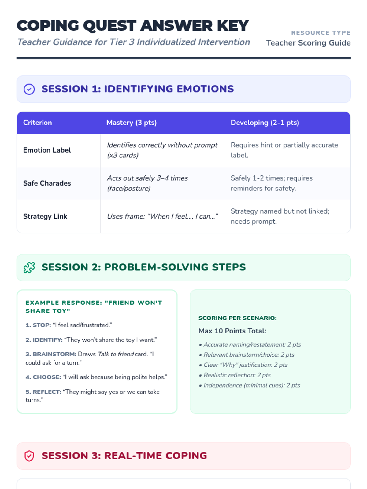 A 3-session intensive intervention program for 5th graders with ADHD and Autism, focusing on emotion identification, structured problem-solving, and real-time coping strategy application through game-based card activities.