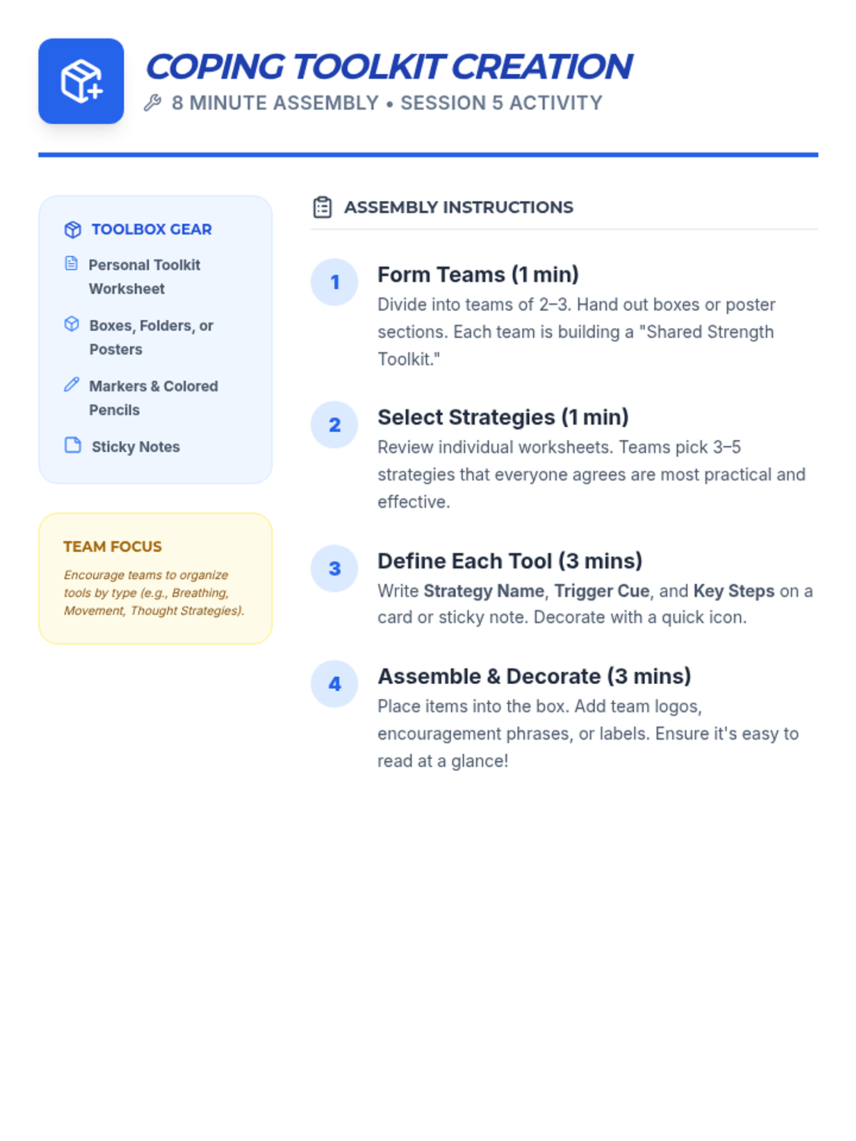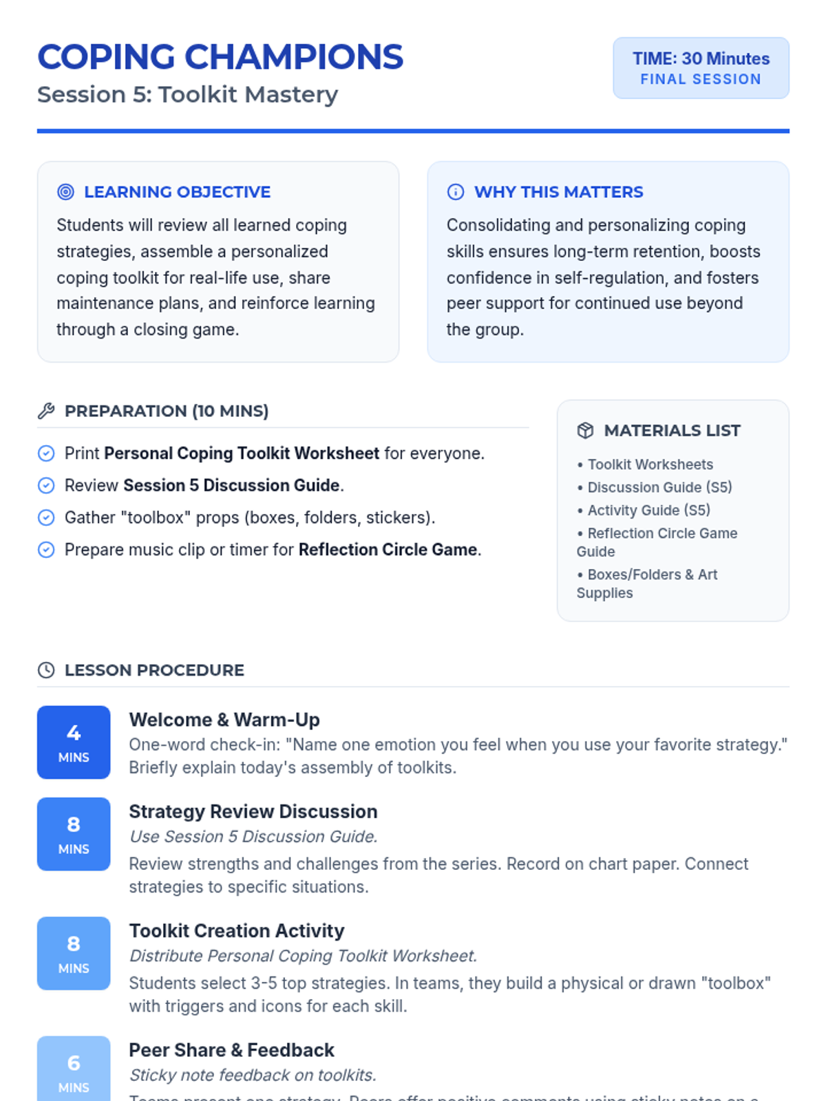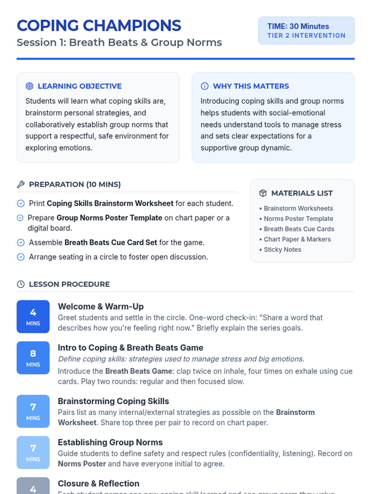 A five-session small-group series teaching 7th–8th graders with social-emotional needs how to identify, implement, and personalize coping skills. Research shows explicit instruction in coping strategies improves emotional regulation and reduces stress.