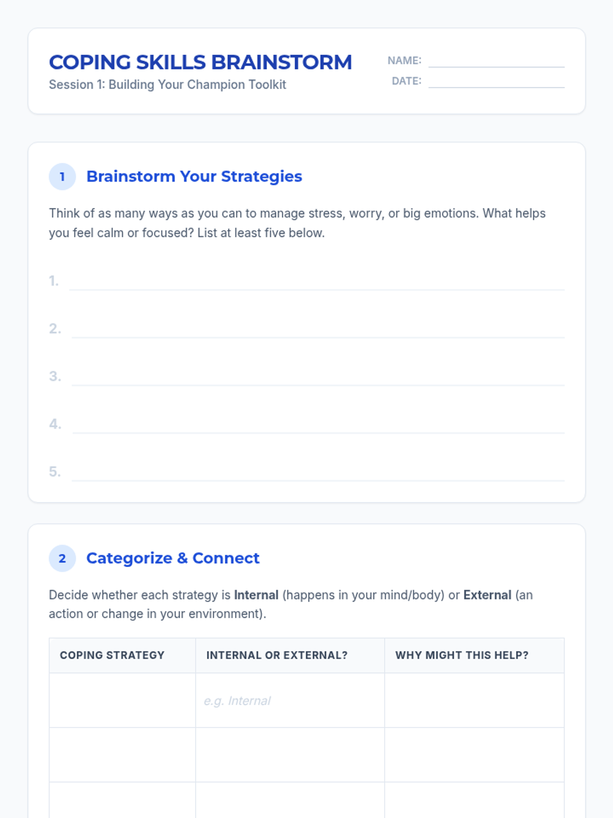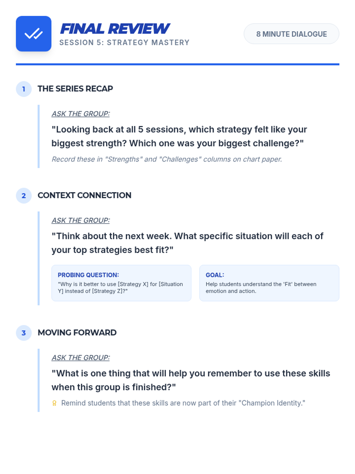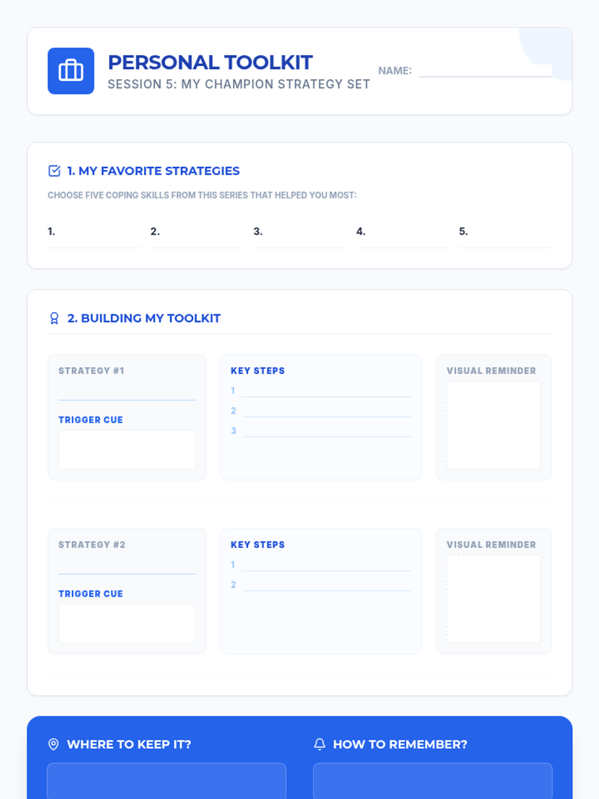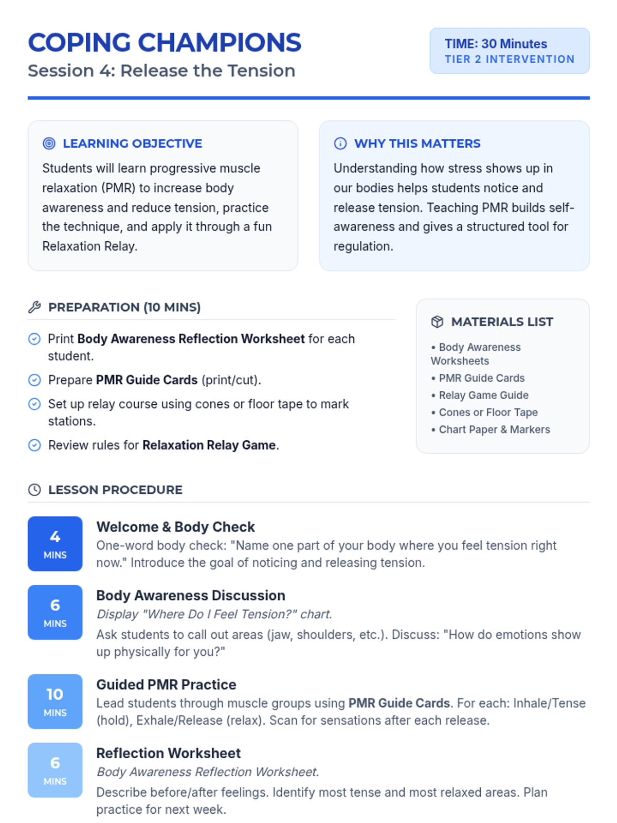 A five-session small-group series teaching 7th–8th graders with social-emotional needs how to identify, implement, and personalize coping skills. Research shows explicit instruction in coping strategies improves emotional regulation and reduces stress.