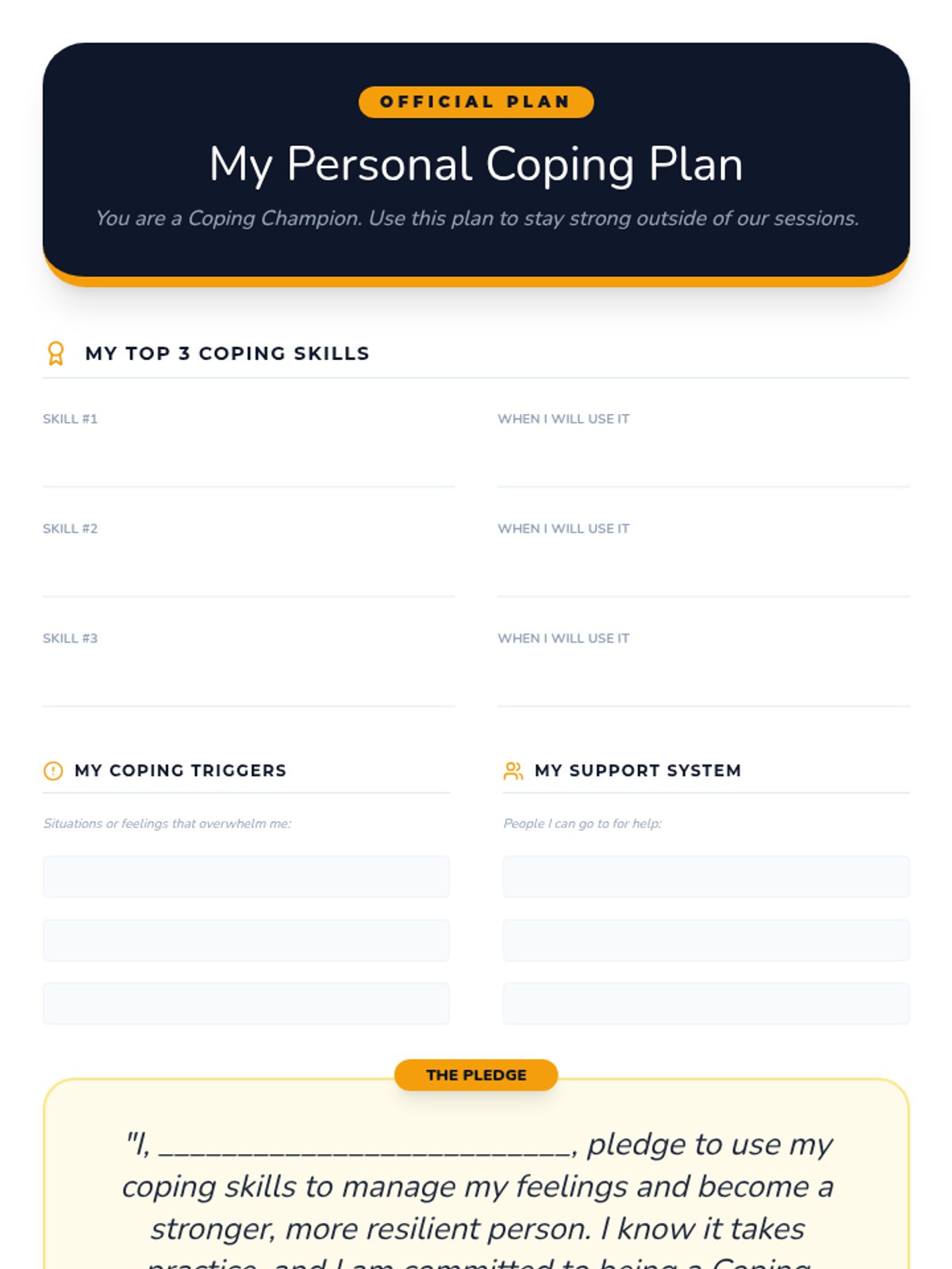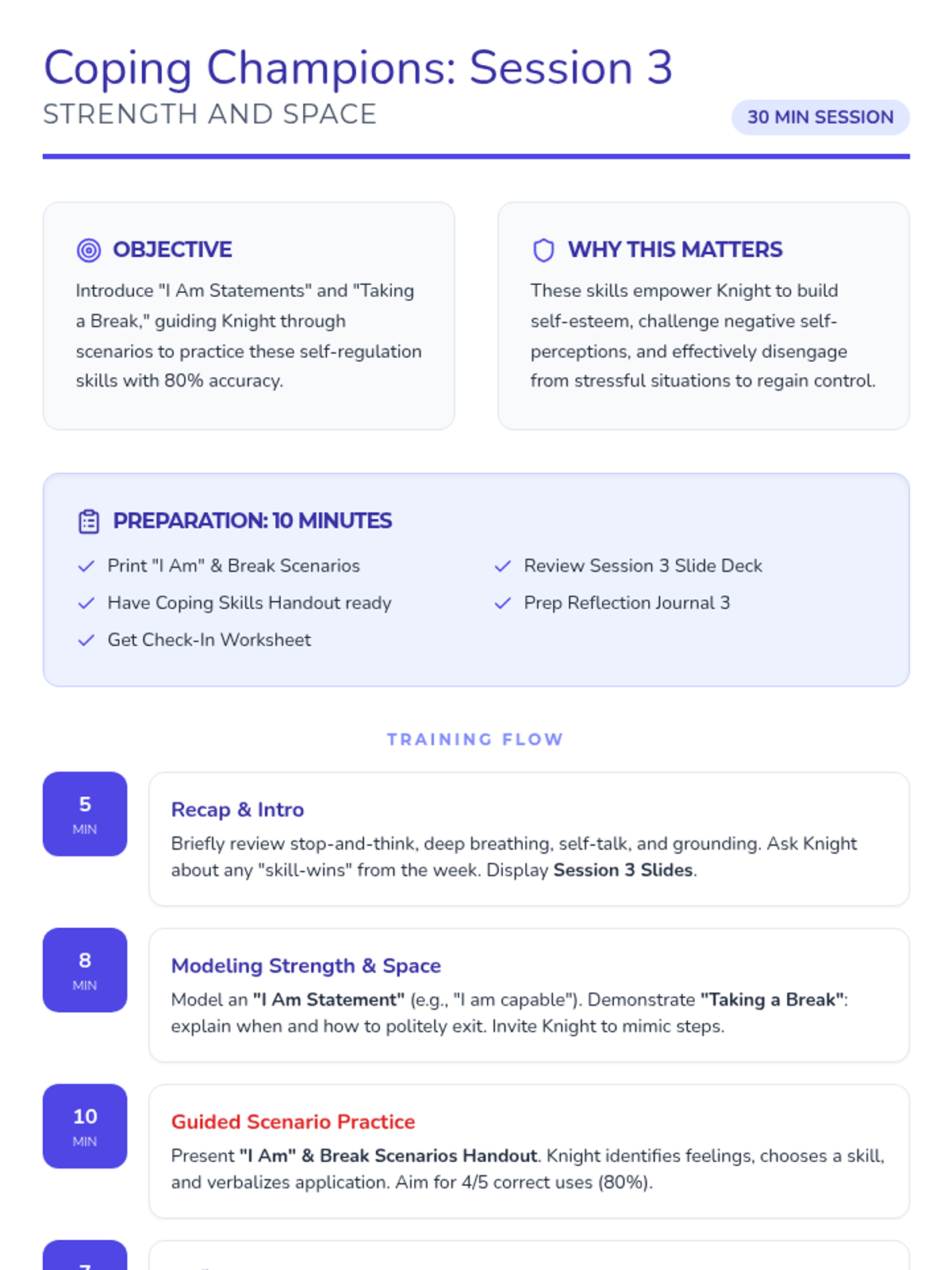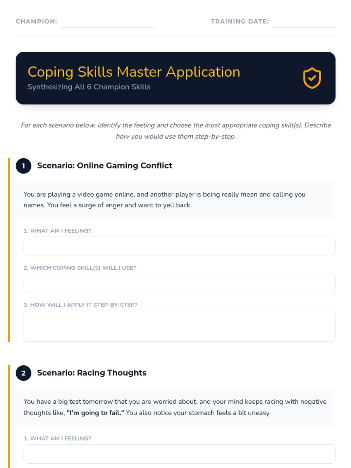 A comprehensive 4-session counseling series designed for 7th-grade students to master six key coping skills. The series focuses on Stop-and-Think, Deep Breathing, Positive Self-Talk, Grounding, 'I Am' Statements, and Taking a Break through interactive scenarios and a custom game.