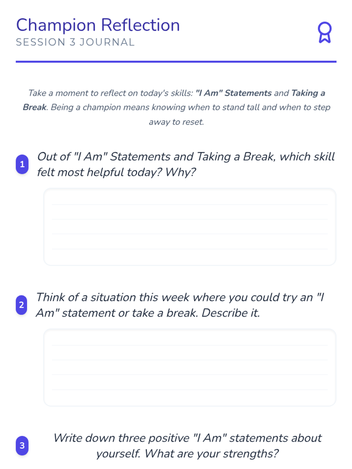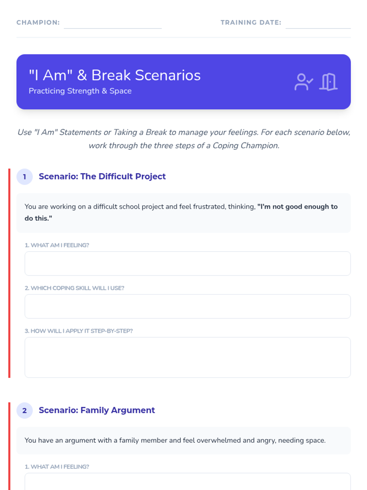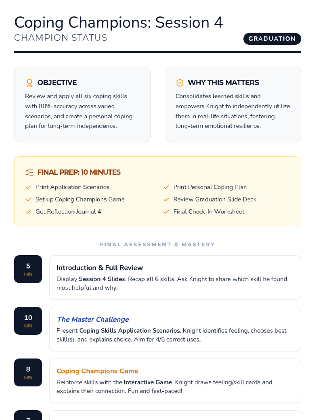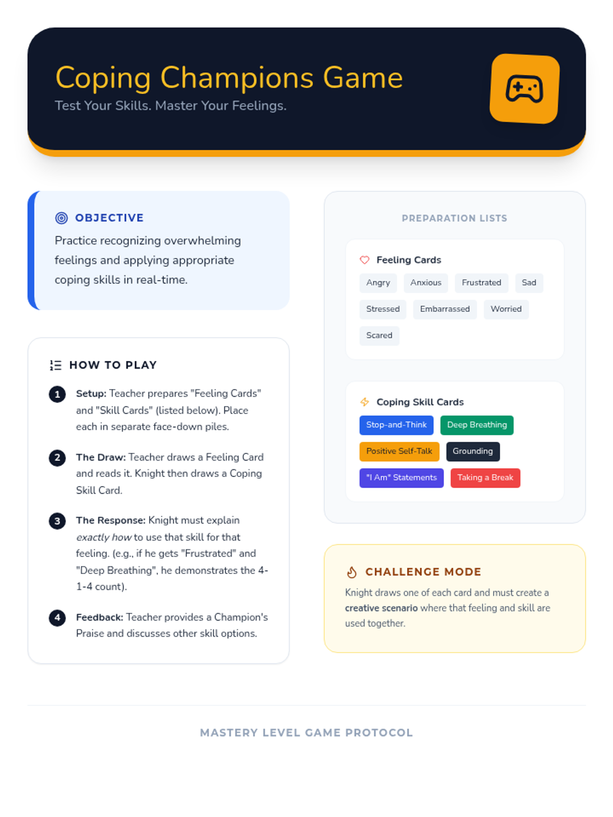A comprehensive 4-session counseling series designed for 7th-grade students to master six key coping skills. The series focuses on Stop-and-Think, Deep Breathing, Positive Self-Talk, Grounding, 'I Am' Statements, and Taking a Break through interactive scenarios and a custom game.