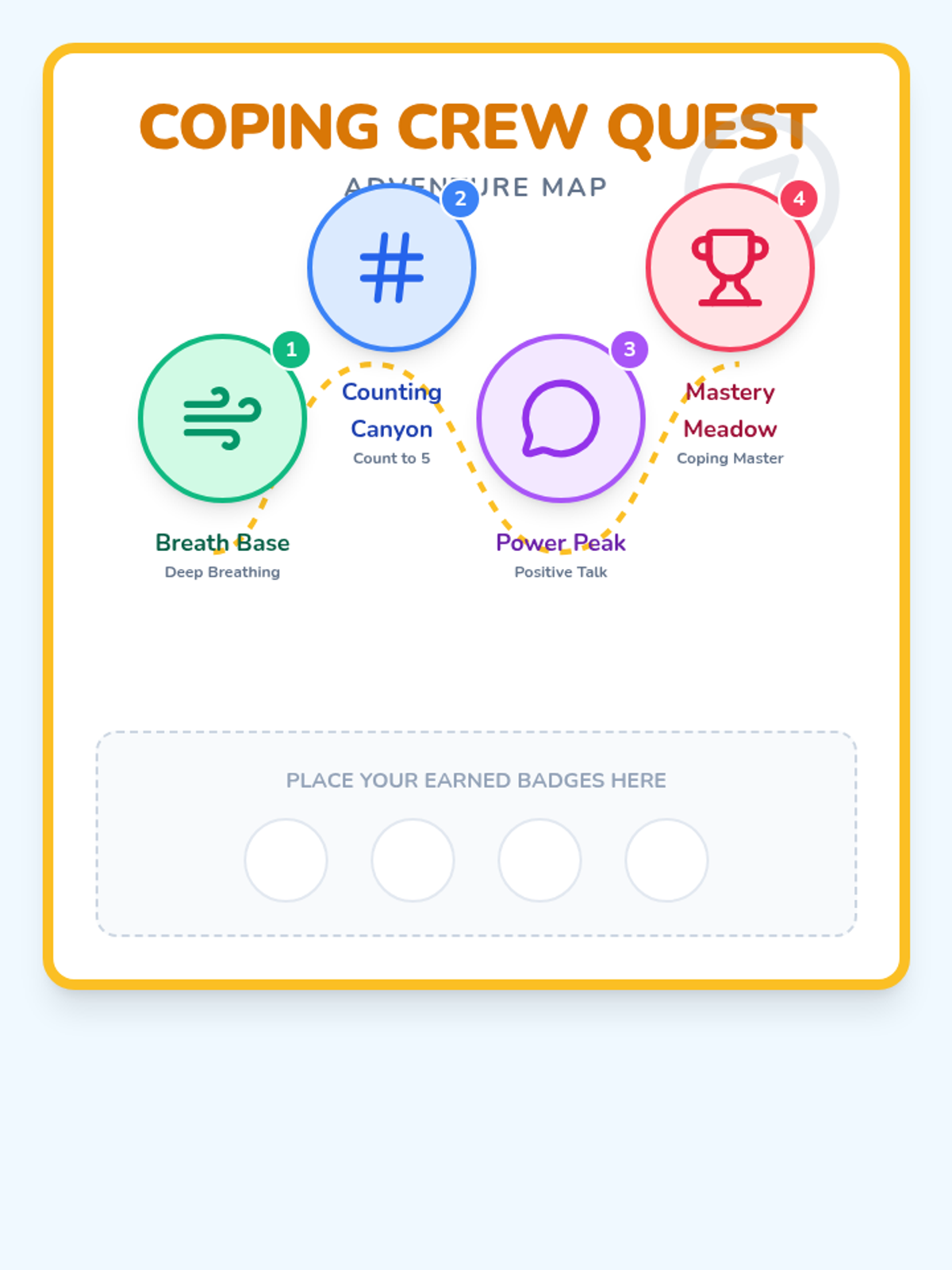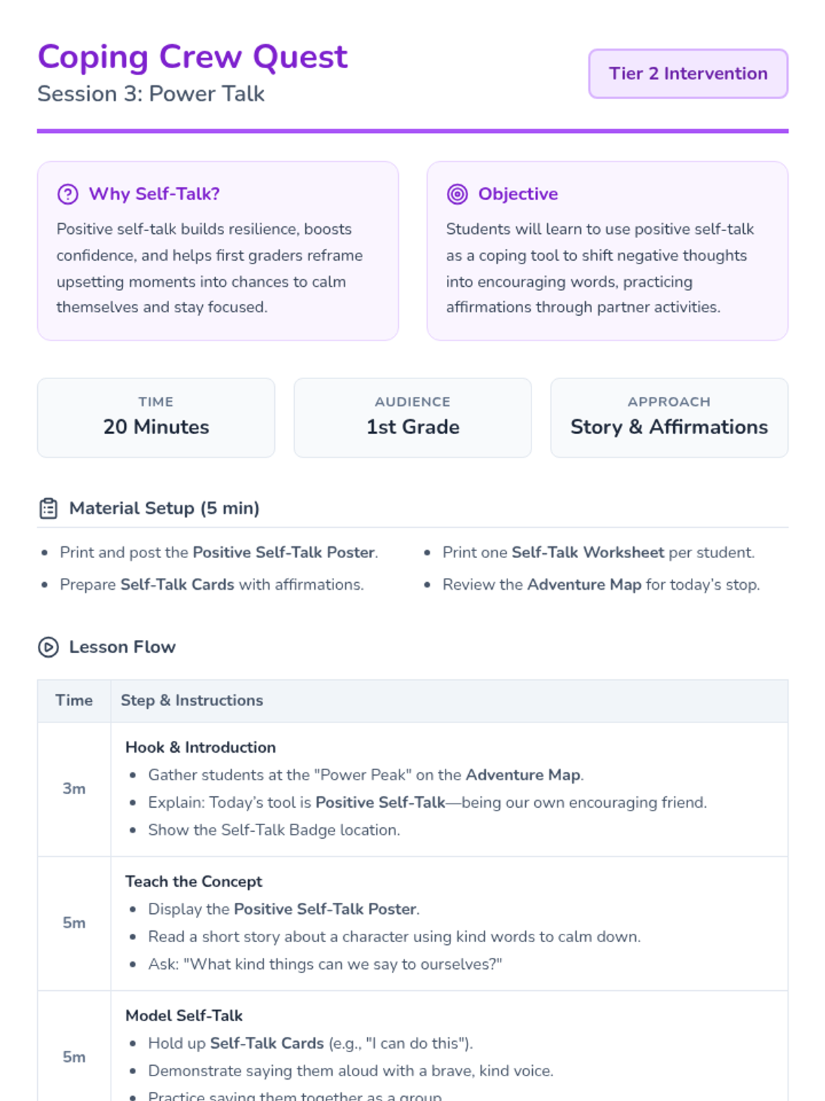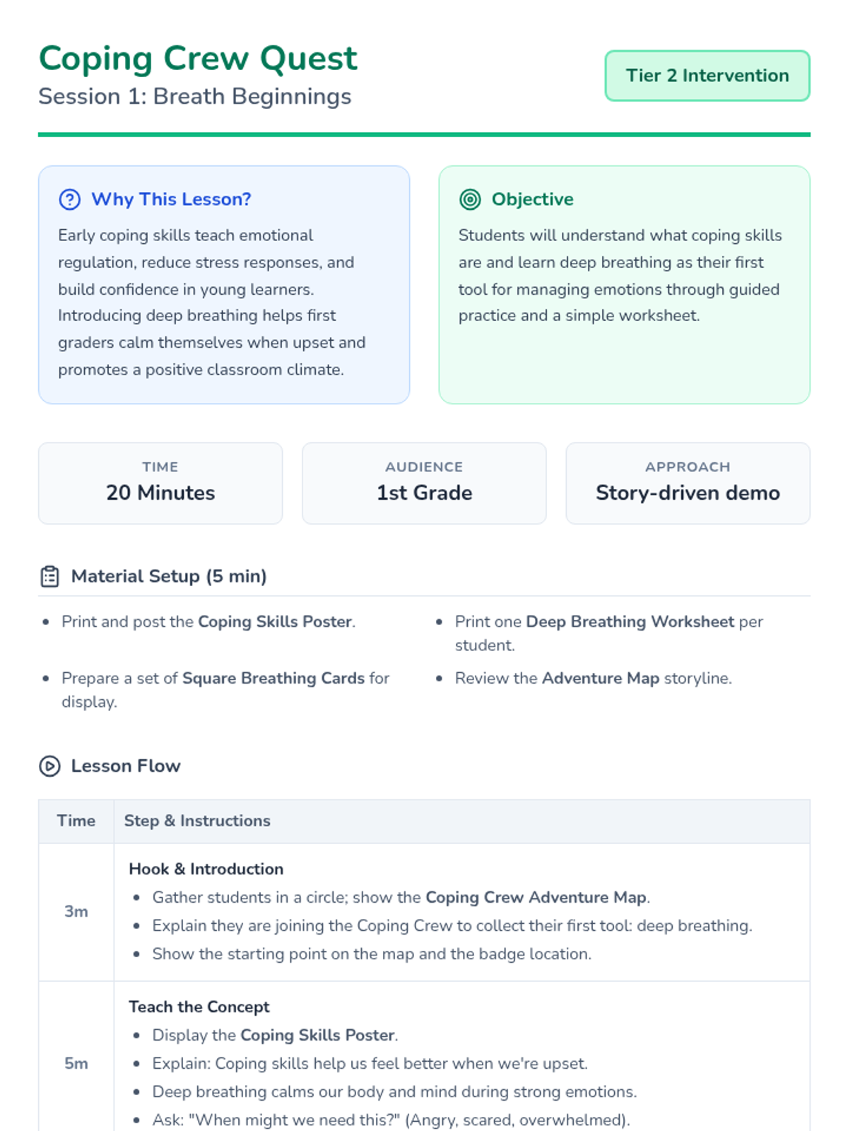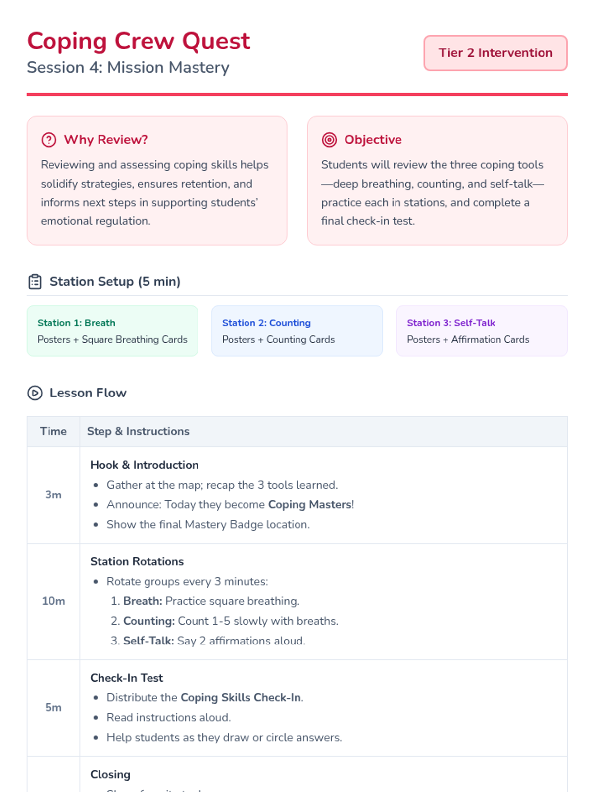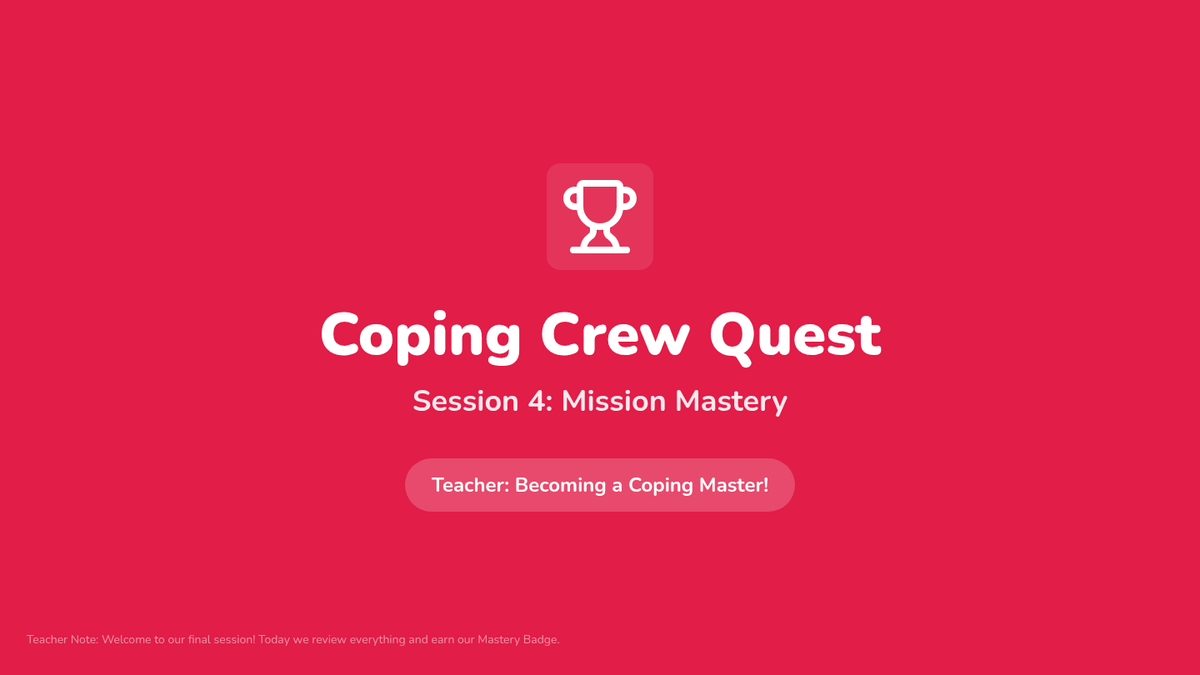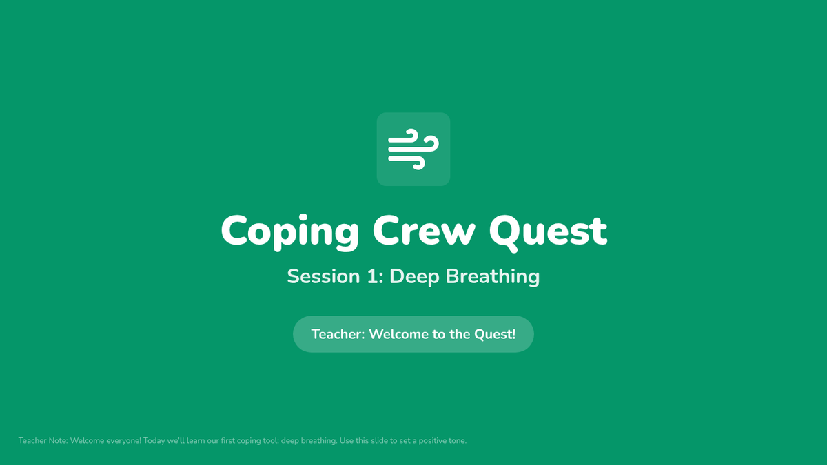 A 4-session Tier 2 group intervention for 1st graders designed to teach foundational emotional regulation tools like deep breathing, counting, and positive self-talk through an adventure-themed quest.