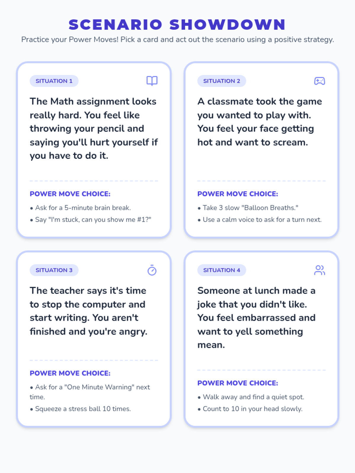 A Tier 3 intervention sequence designed to help students recognize emotions, identify triggers, and practice positive coping strategies to replace self-harming threats or task-avoidant behaviors.