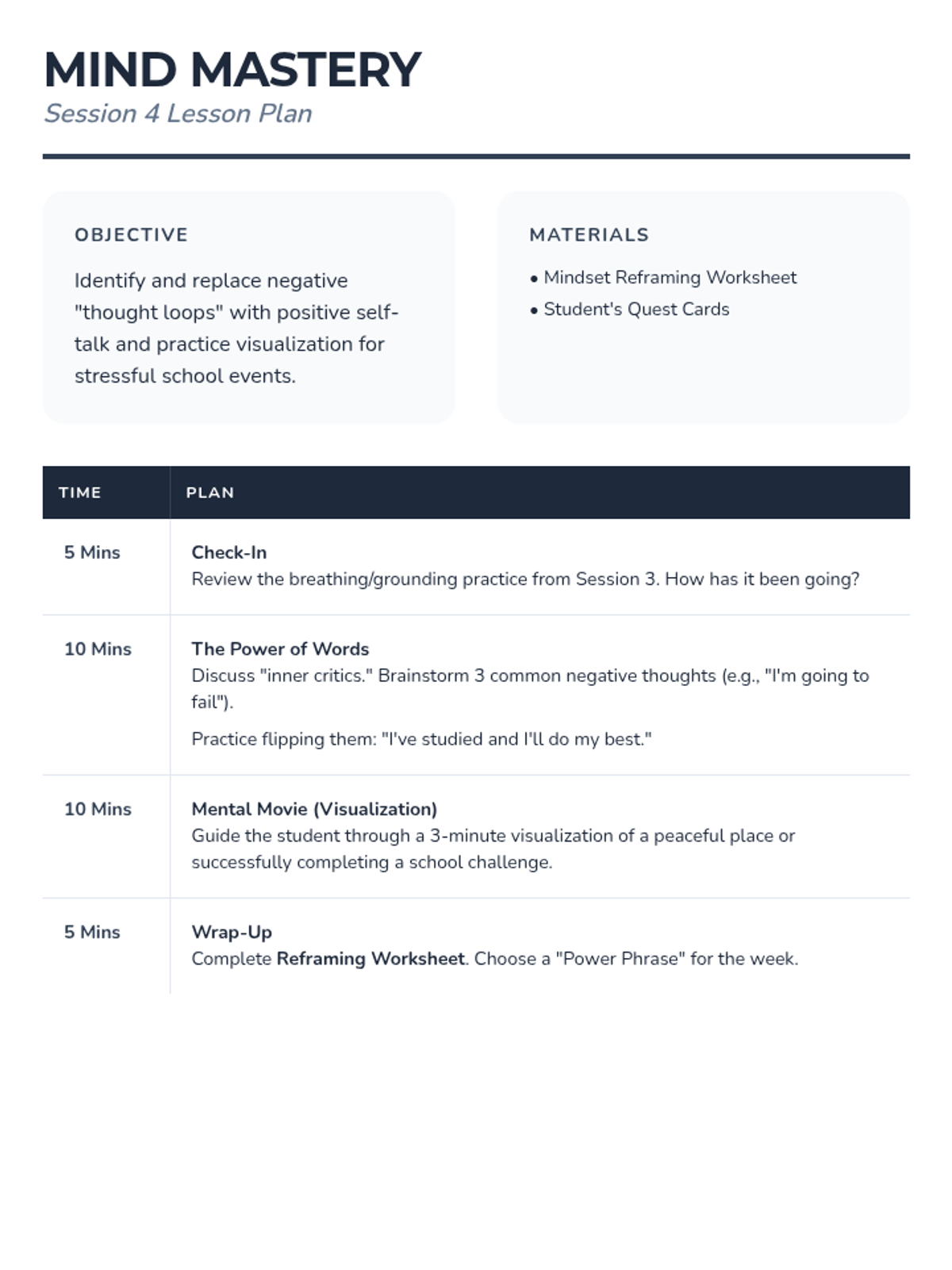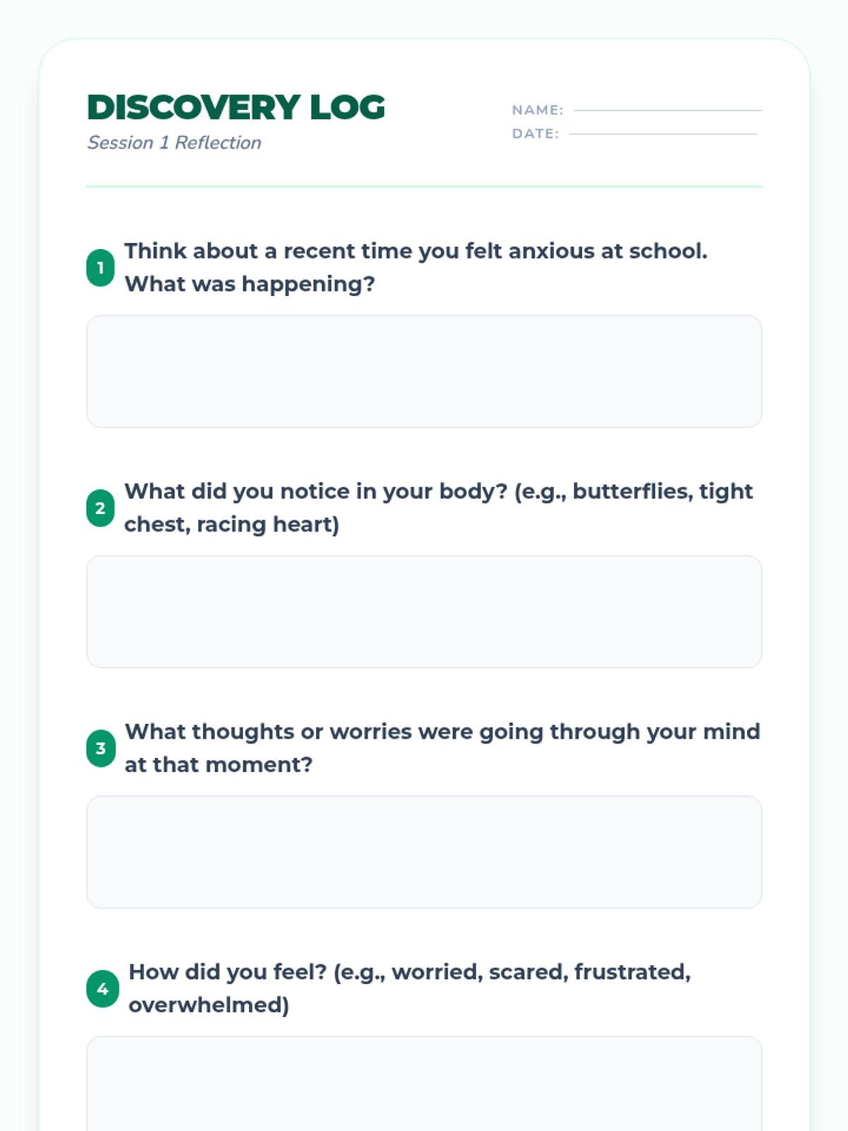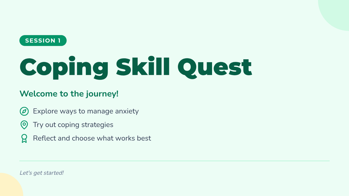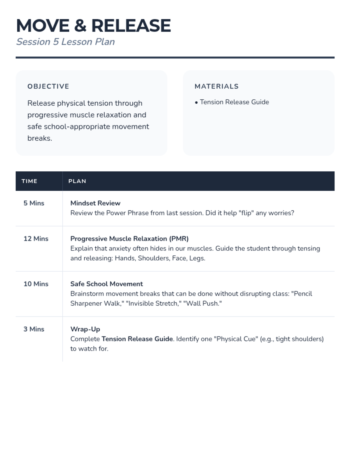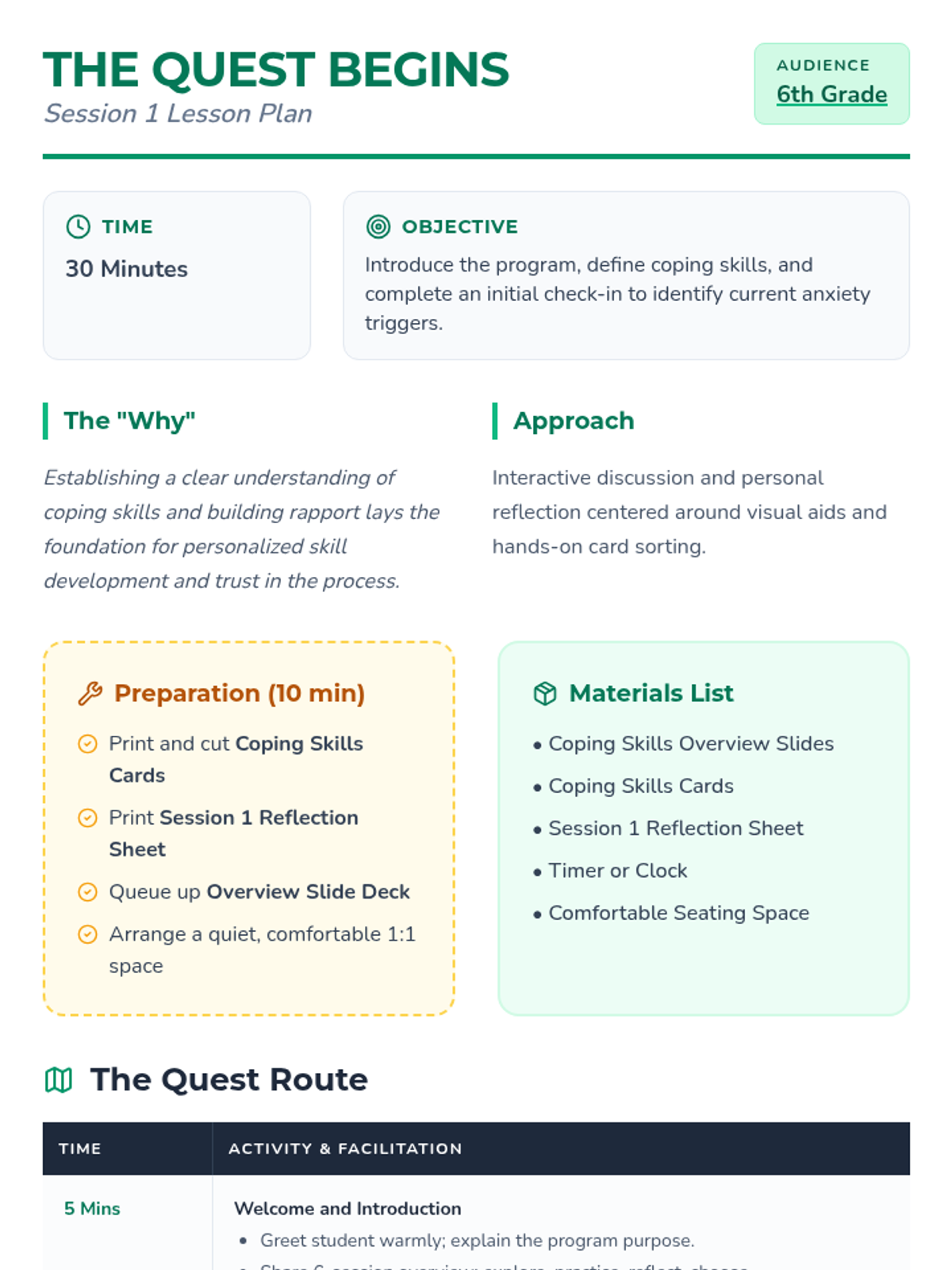 A 6-session individual program for 6th-grade students to explore, practice, and choose coping strategies for anxiety management. Through hands-on practice and personalized reflection, students build a toolkit of techniques to navigate school-related stress.