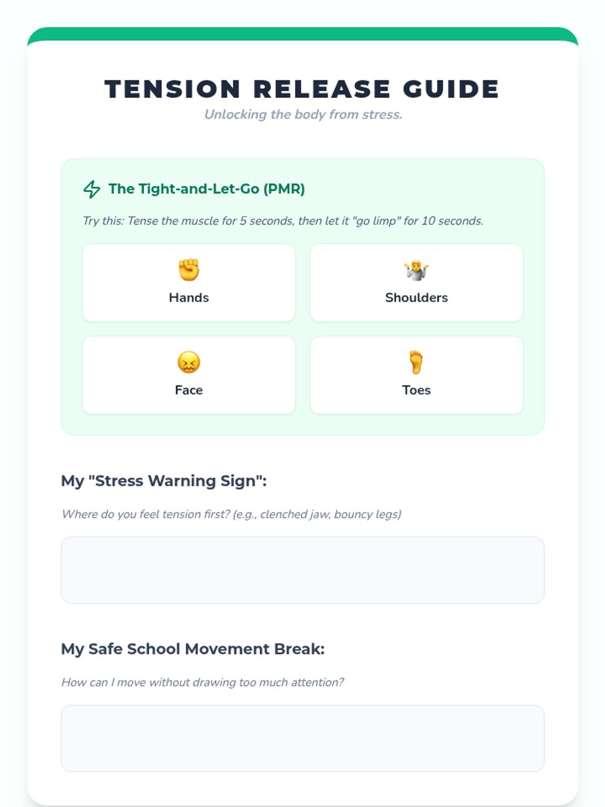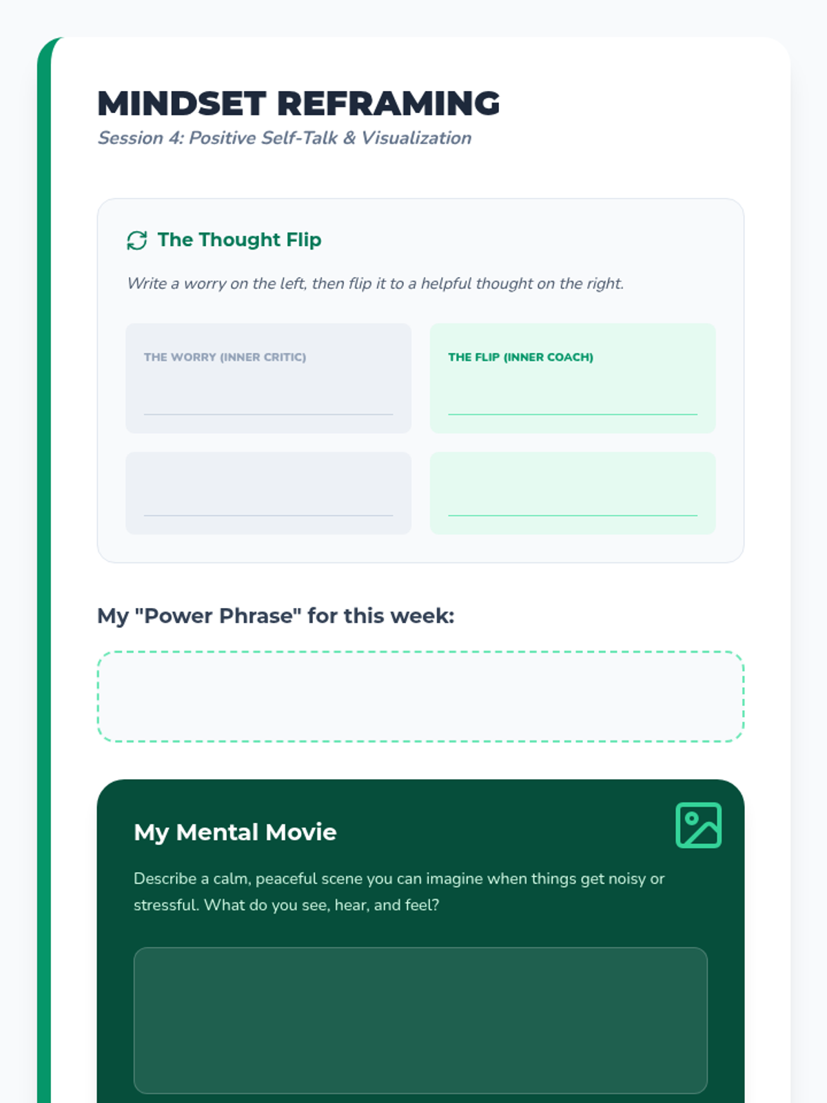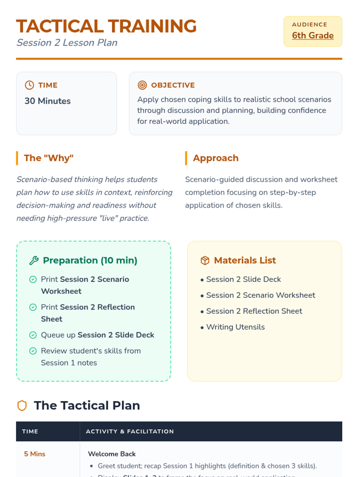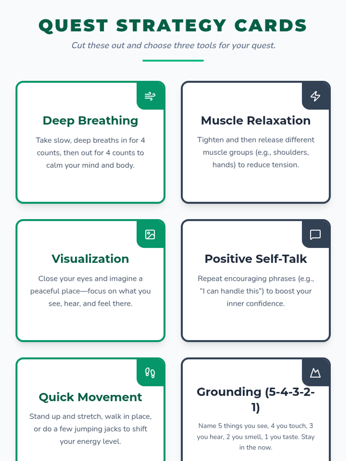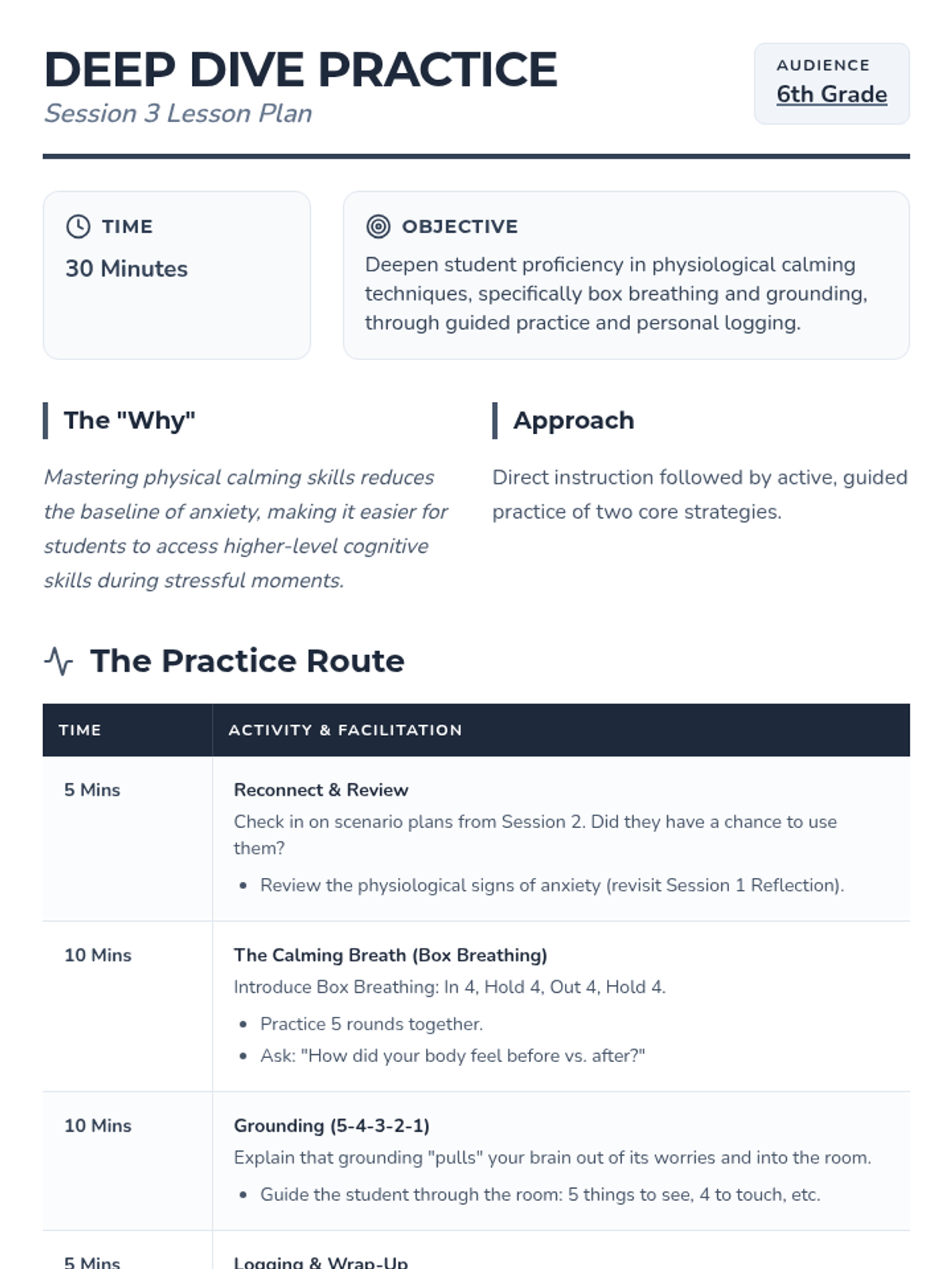 A 6-session individual program for 6th-grade students to explore, practice, and choose coping strategies for anxiety management. Through hands-on practice and personalized reflection, students build a toolkit of techniques to navigate school-related stress.