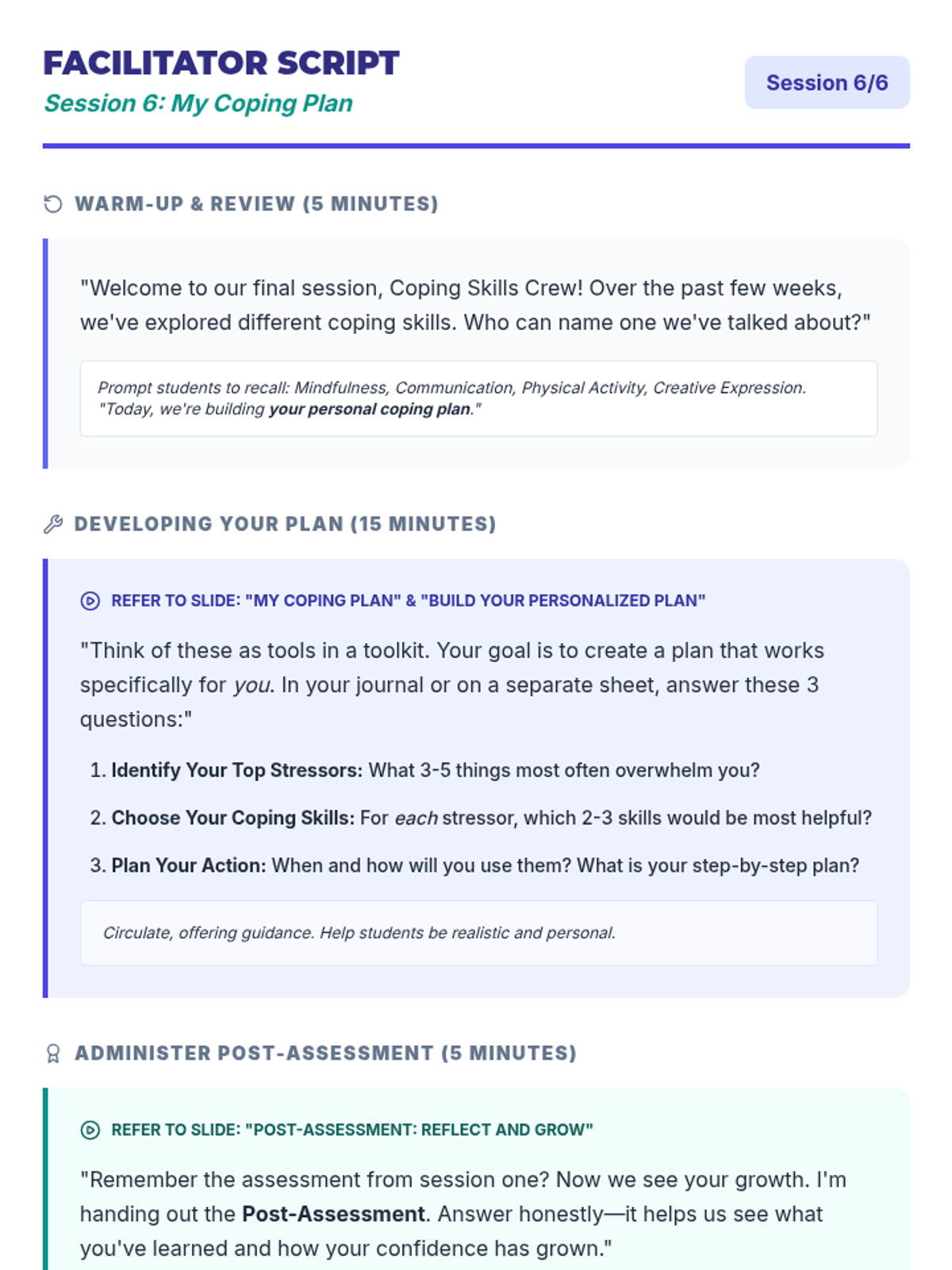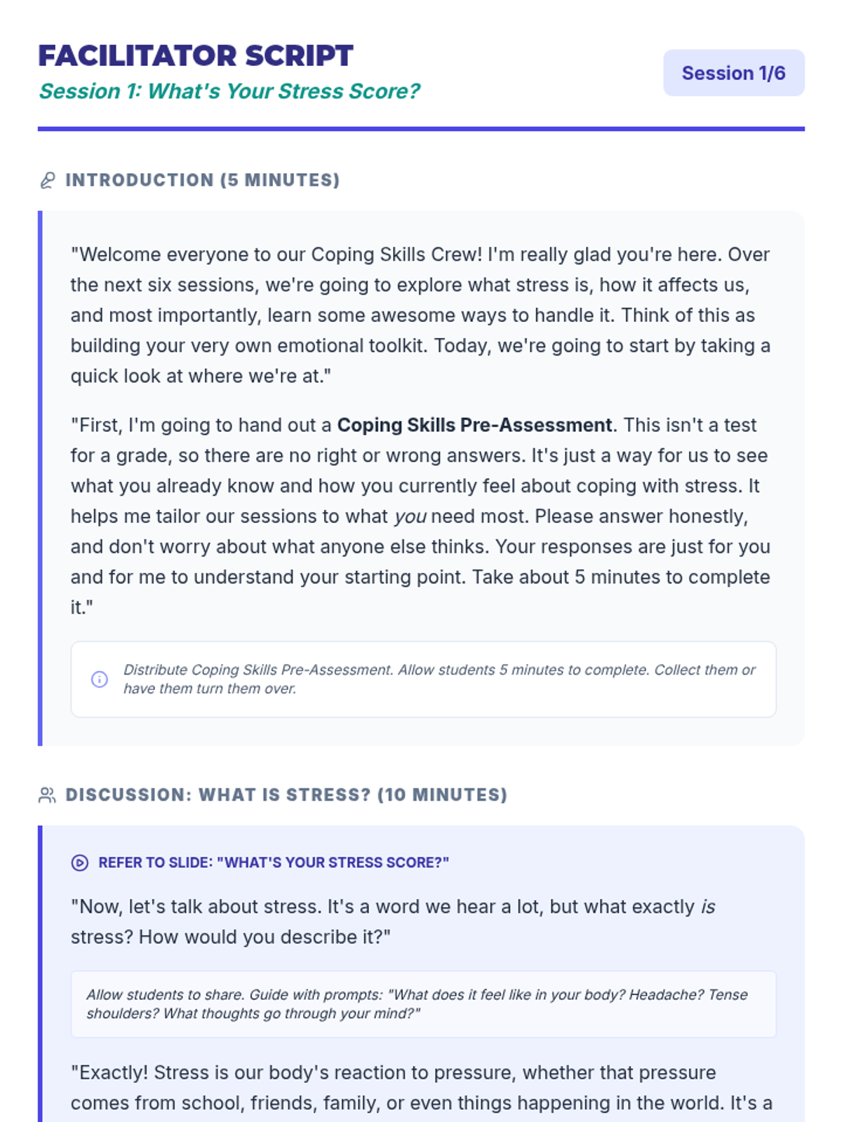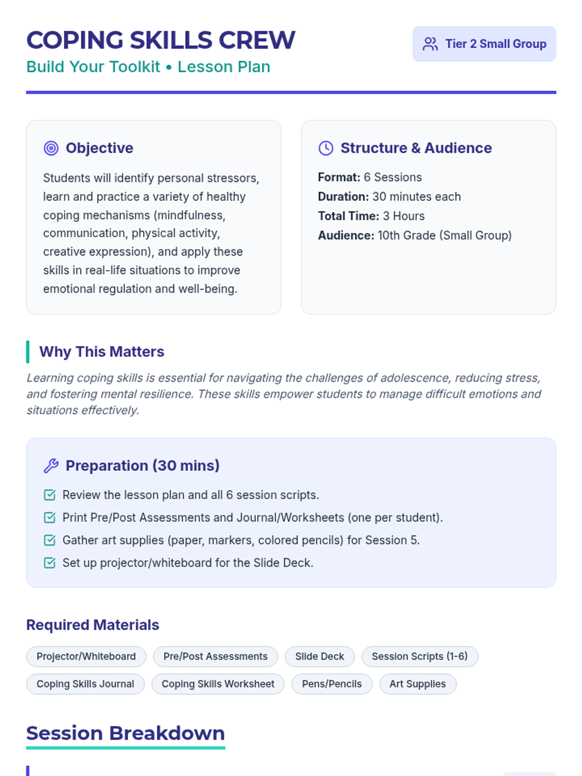 A 6-session unit designed for small groups of 10th-grade students to develop, practice, and implement effective coping strategies for managing stress and emotions.
