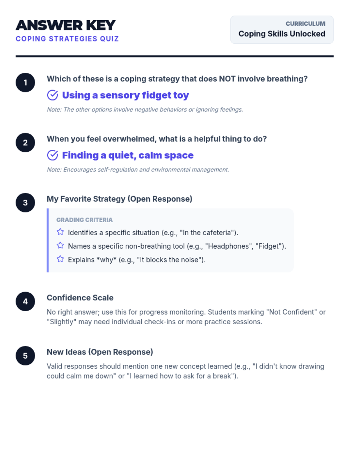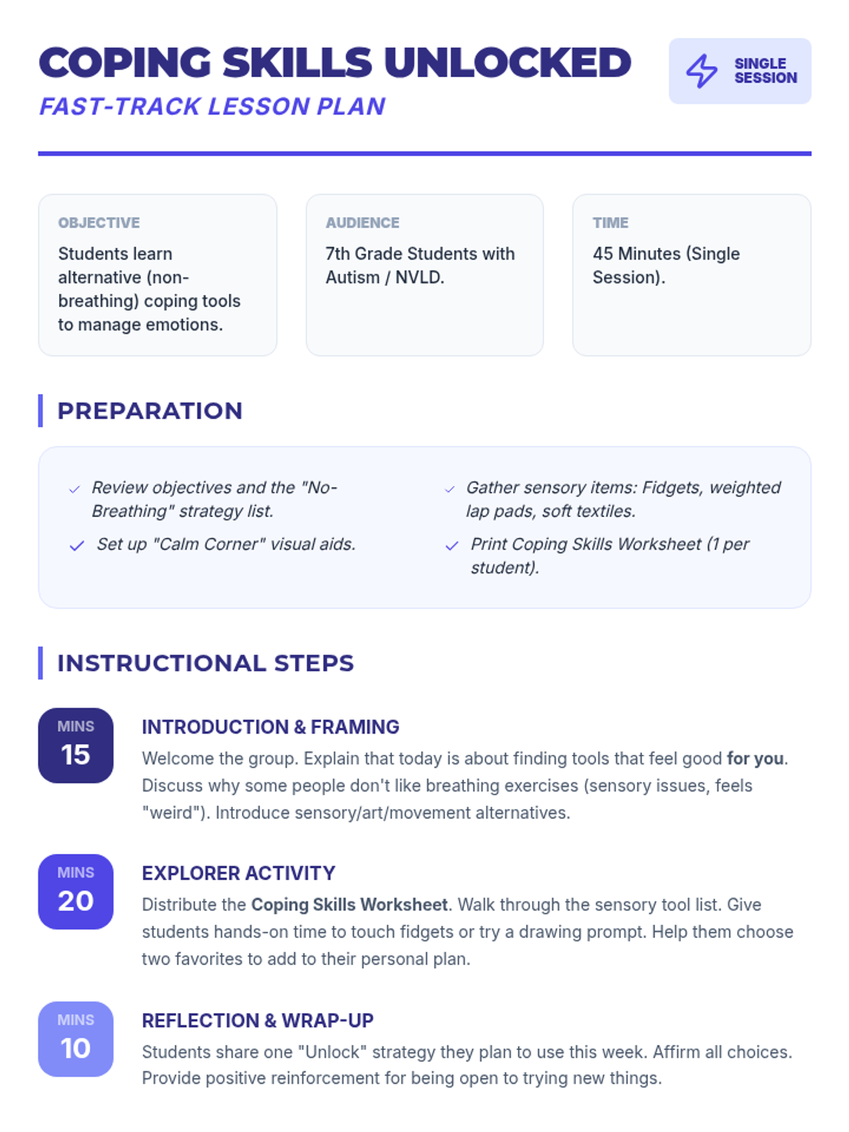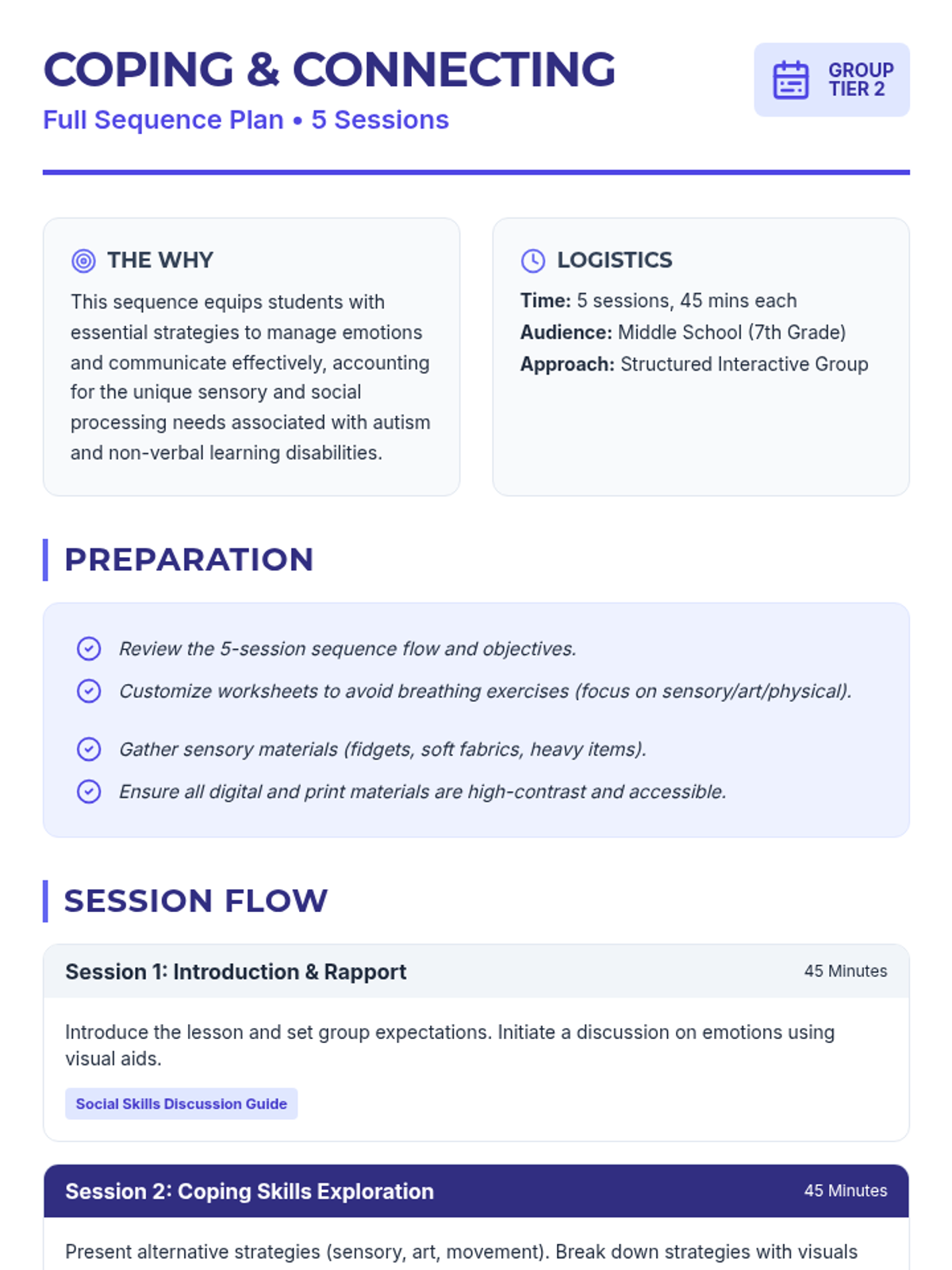 A 5-session group counseling sequence for 7th-grade students with autism, focusing on alternative (non-breathing) coping strategies, social skills, and emotional regulation.
