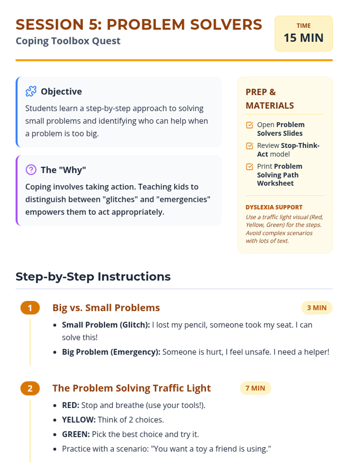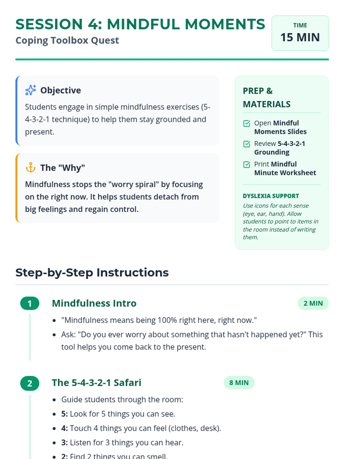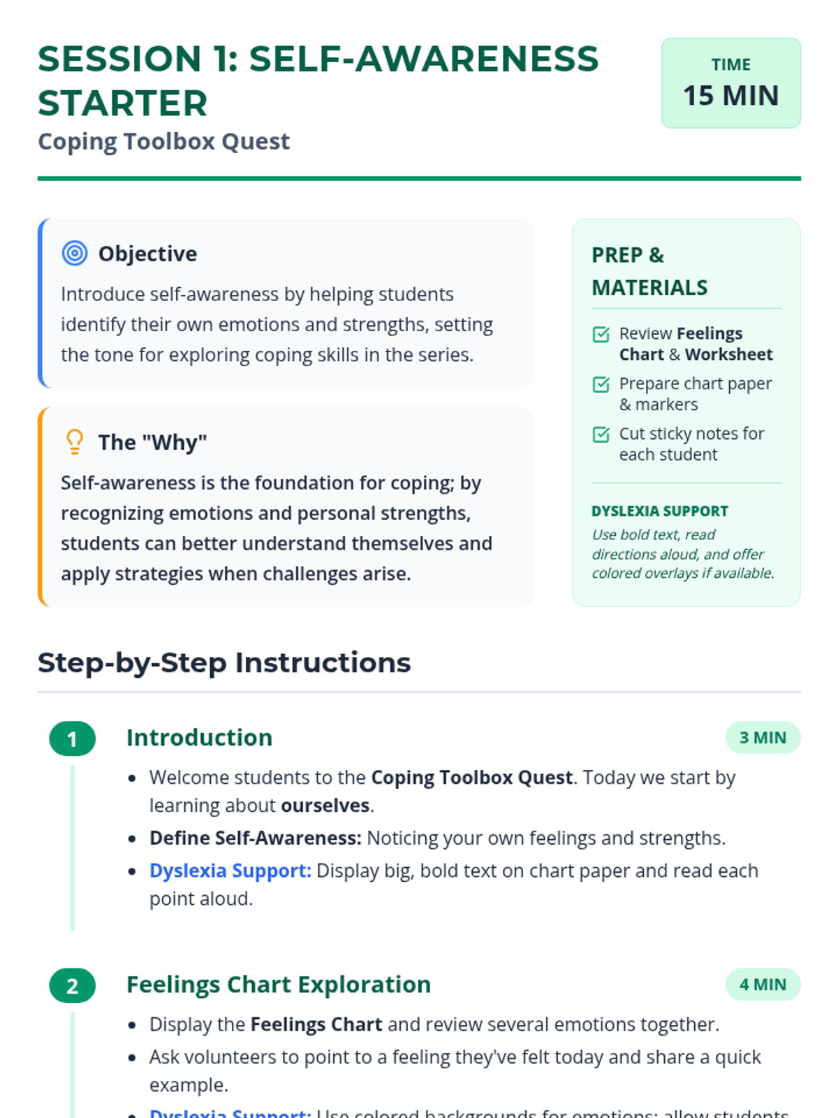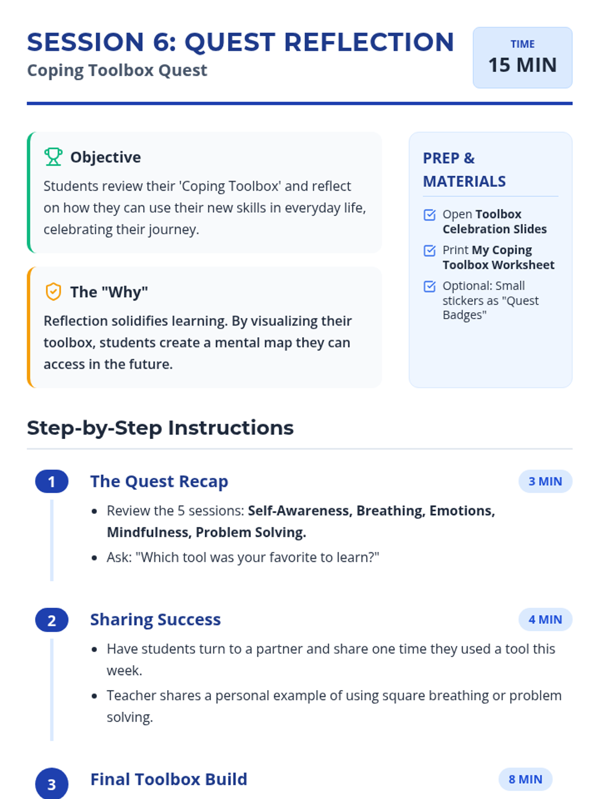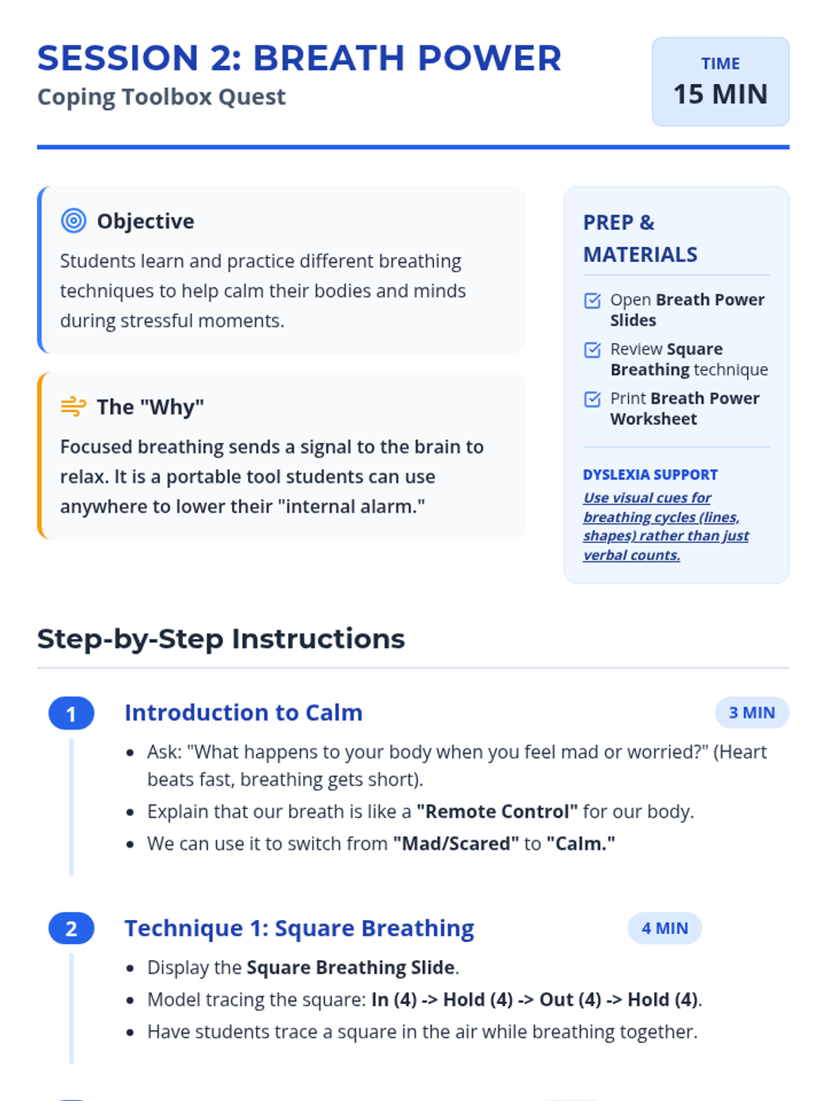 A 6-session classroom series for elementary students focused on building a 'Coping Toolbox' through self-awareness, breathing, mindfulness, and problem-solving. Each 15-minute session uses adventure-themed materials designed for dyslexia-friendly accessibility.