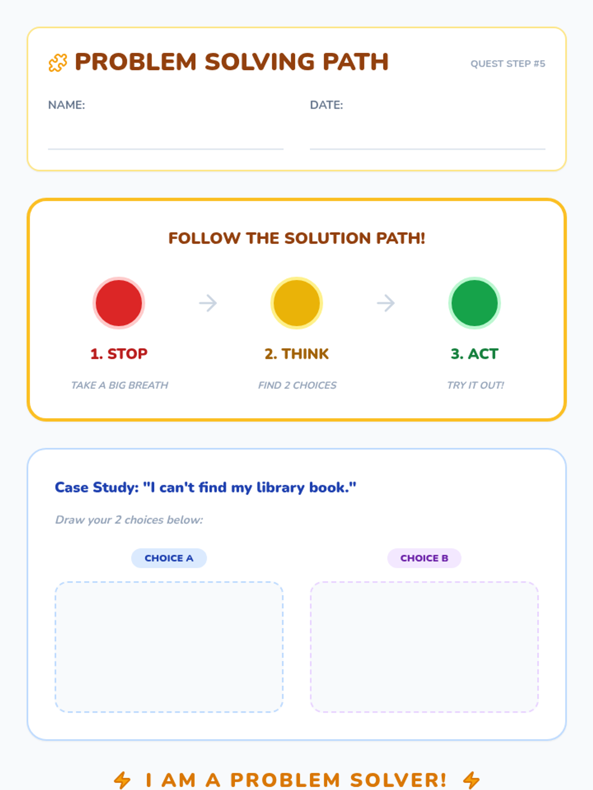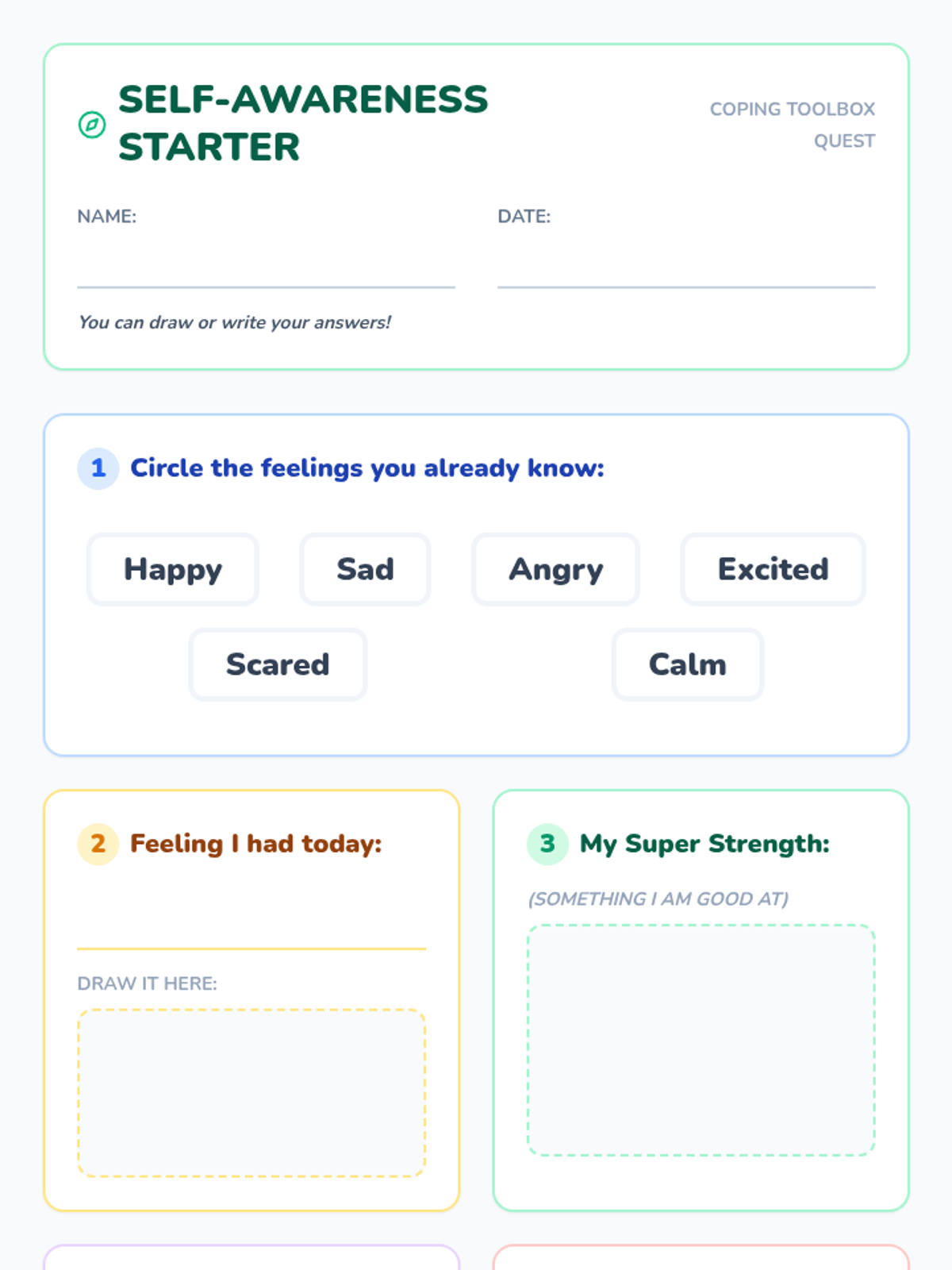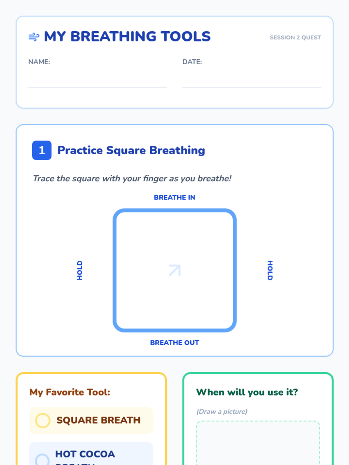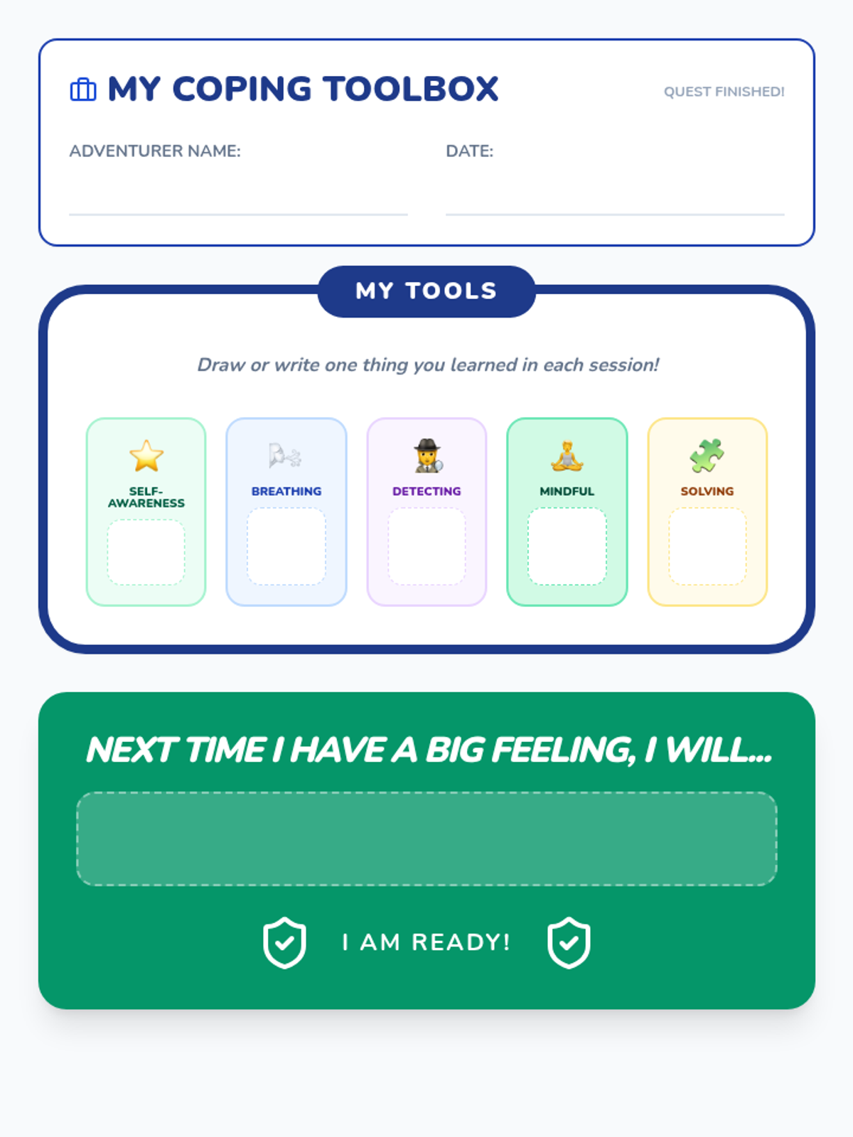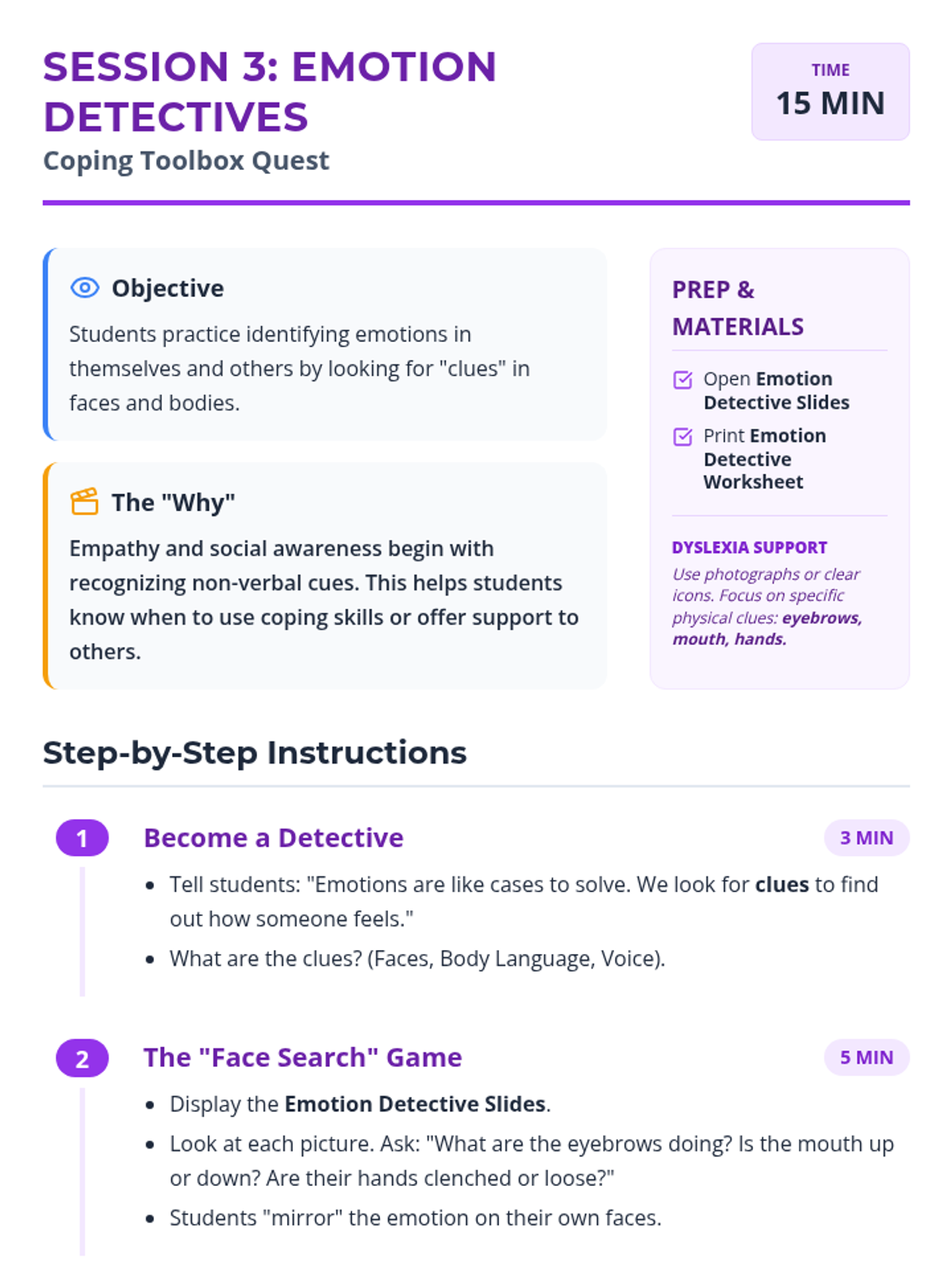 A 6-session classroom series for elementary students focused on building a 'Coping Toolbox' through self-awareness, breathing, mindfulness, and problem-solving. Each 15-minute session uses adventure-themed materials designed for dyslexia-friendly accessibility.