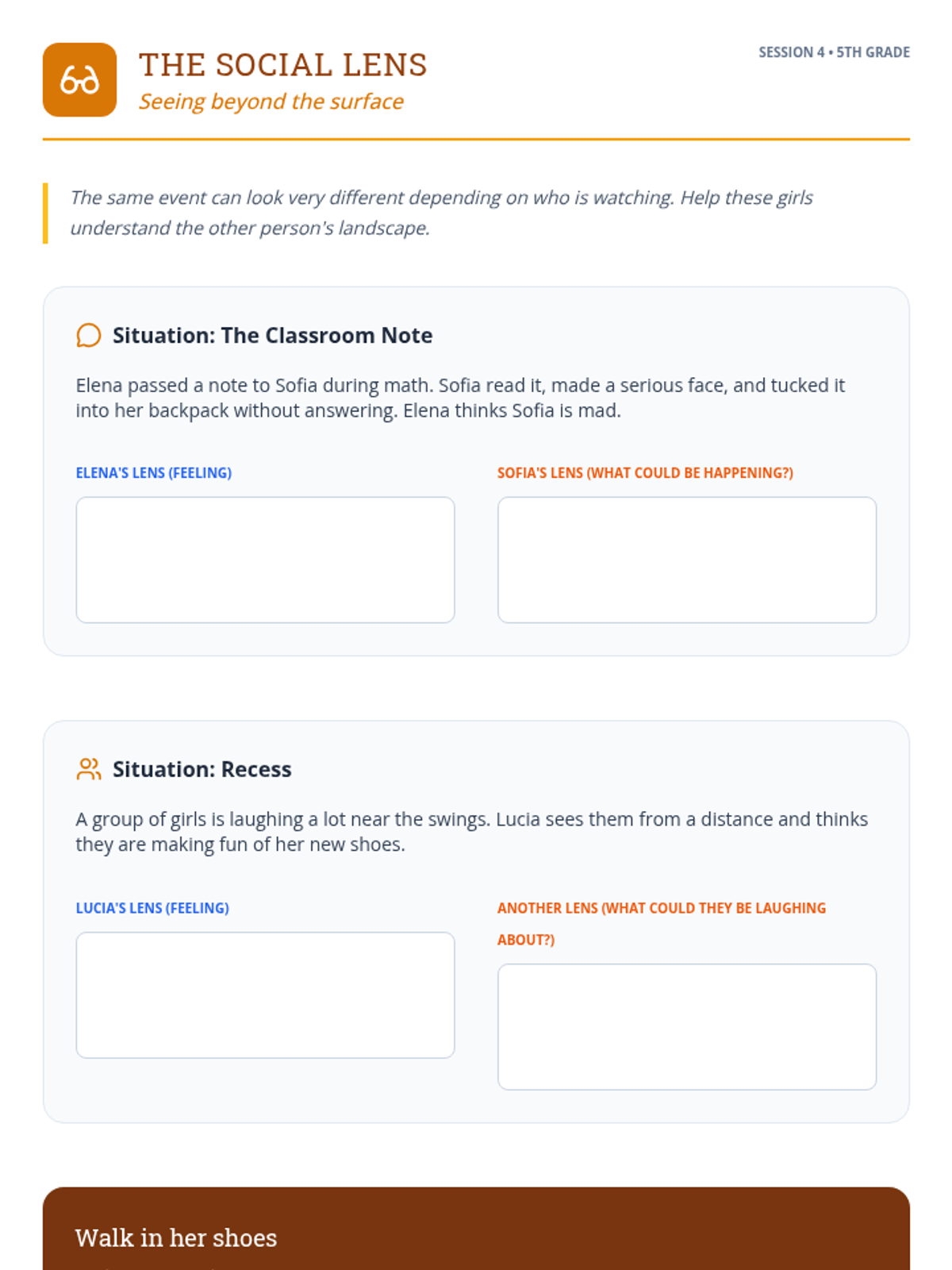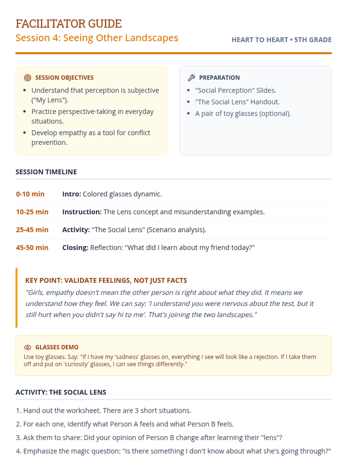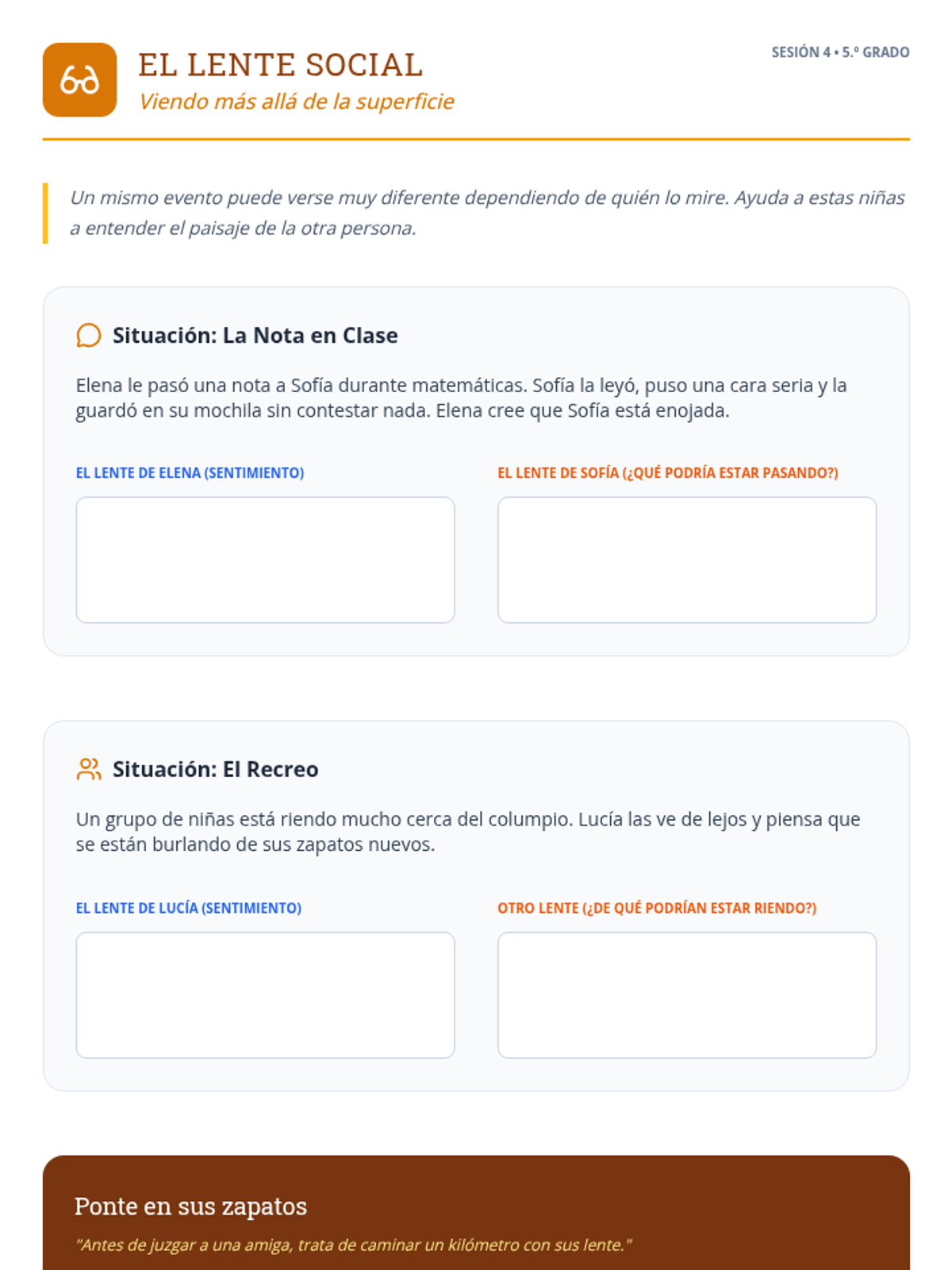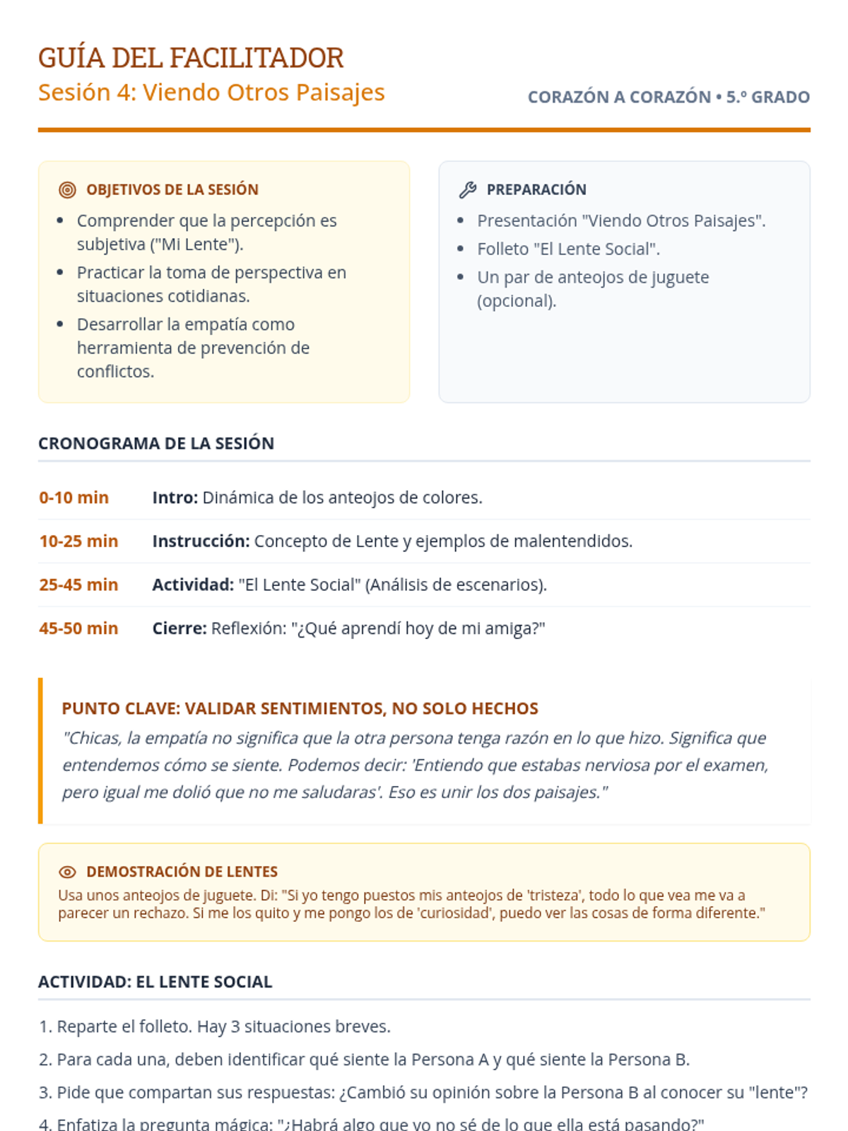 Un currículo de orientación de 6 sesiones adaptado para niñas de 5.º grado, centrado en los fundamentos de la amistad y la resolución de conflictos. Usando la metáfora de un 'Jardín de Amigos', las estudiantes exploran cómo nutrir relaciones positivas, comunicarse con amabilidad y establecer límites saludables.