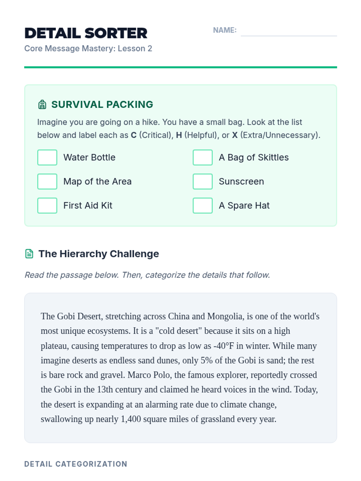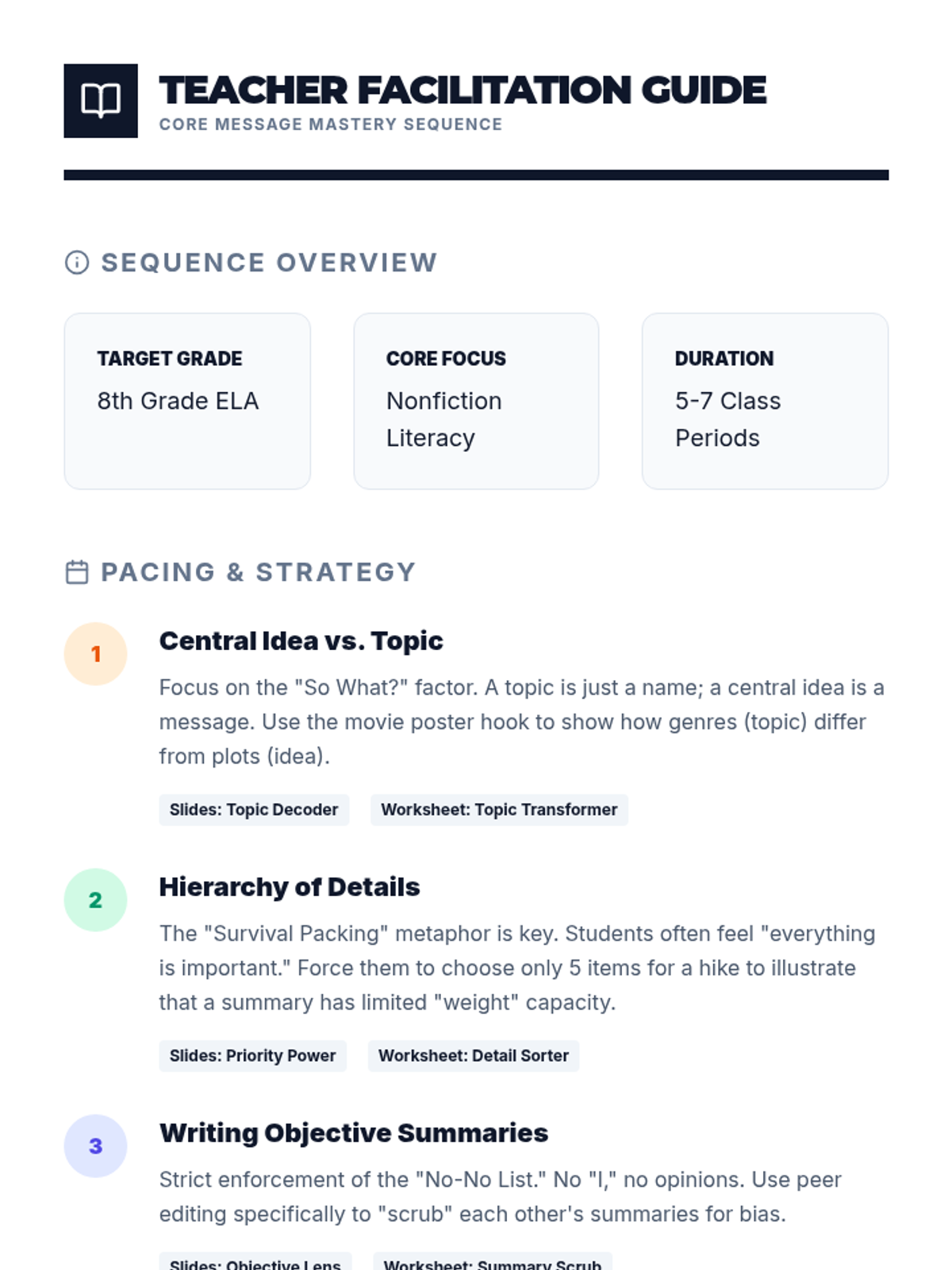 An 8th-grade ELA sequence focused on the mastery of determining central ideas and writing objective summaries in nonfiction. Students move from distinguishing topics to distilling complex texts into concise, neutral summaries across various genres.