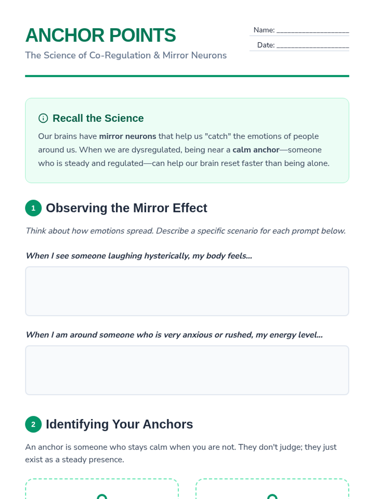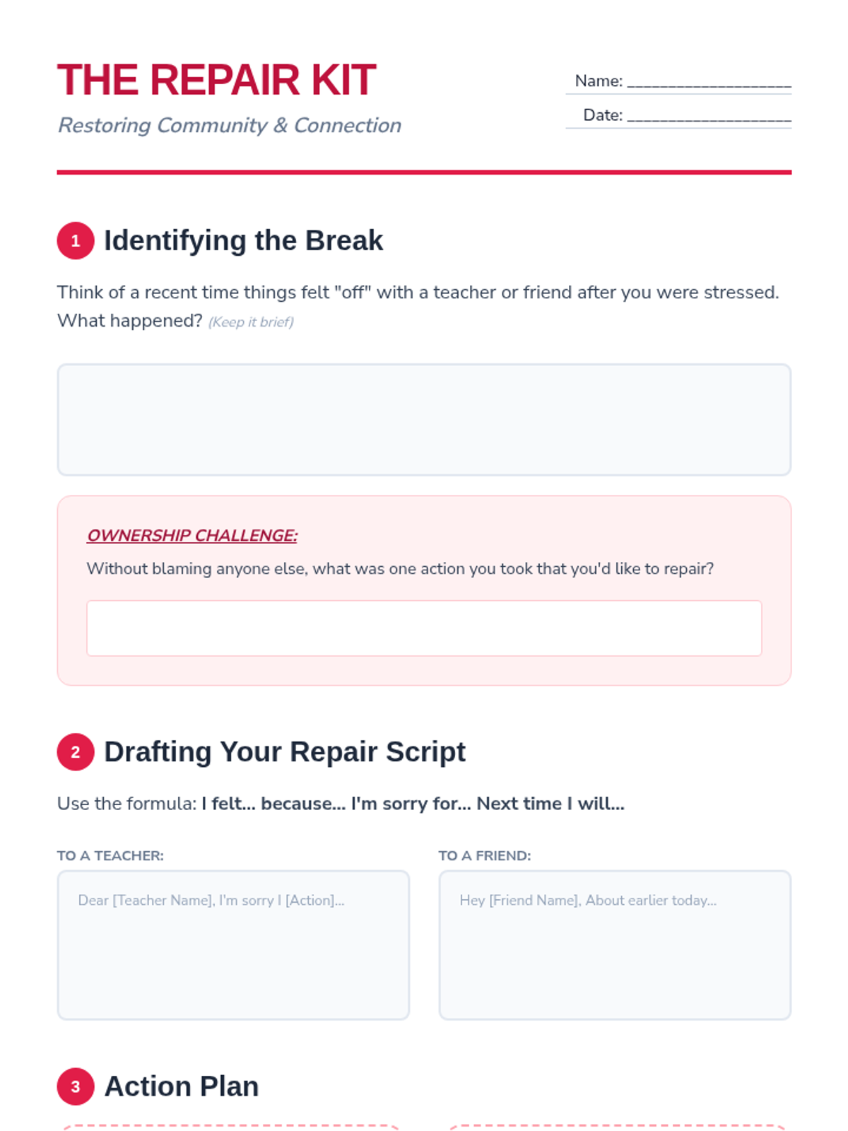 A 5-lesson sequence for 9th-grade students focused on the social aspects of dysregulation recovery. Students learn about the science of co-regulation, identify safe supporters, develop non-verbal communication systems, and practice restorative re-entry and repair techniques after a crisis.