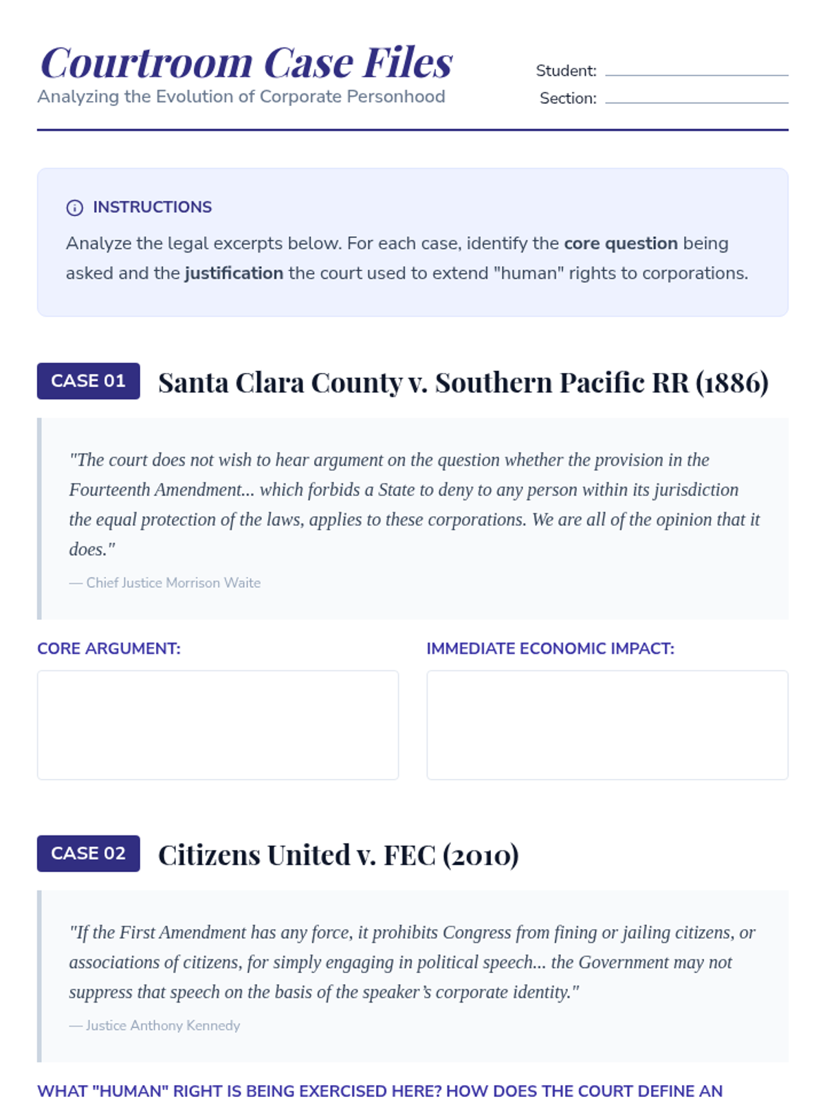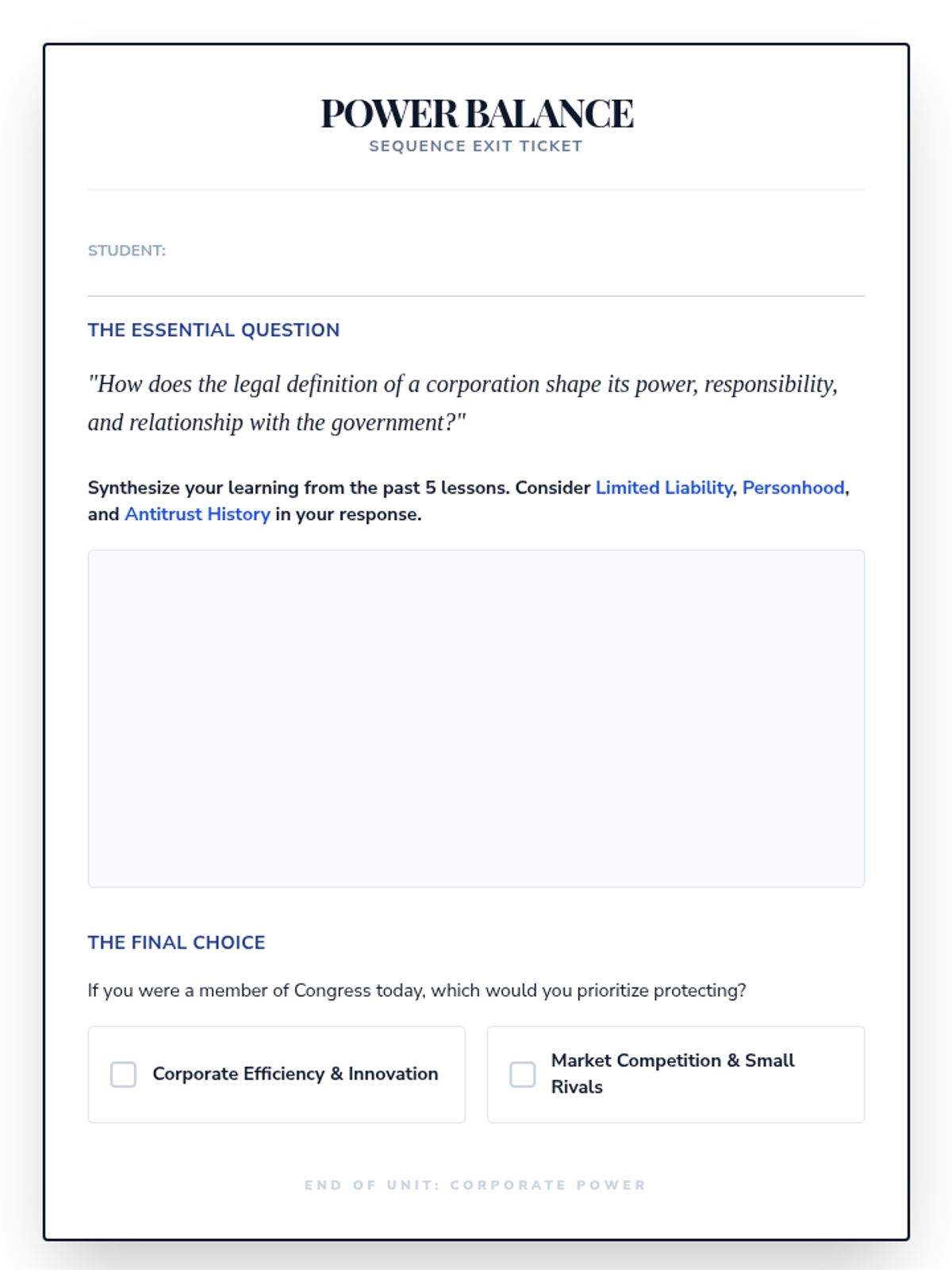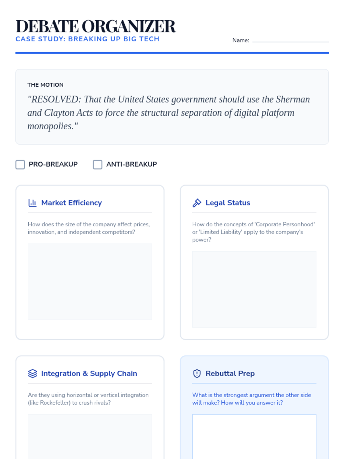 This high school economics sequence explores the legal and economic structures of corporations, tracing the history of market power from the Gilded Age to modern Big Tech. Students analyze business structures, the concept of corporate personhood, the rise of monopolies like Standard Oil, and the evolution of antitrust regulation.